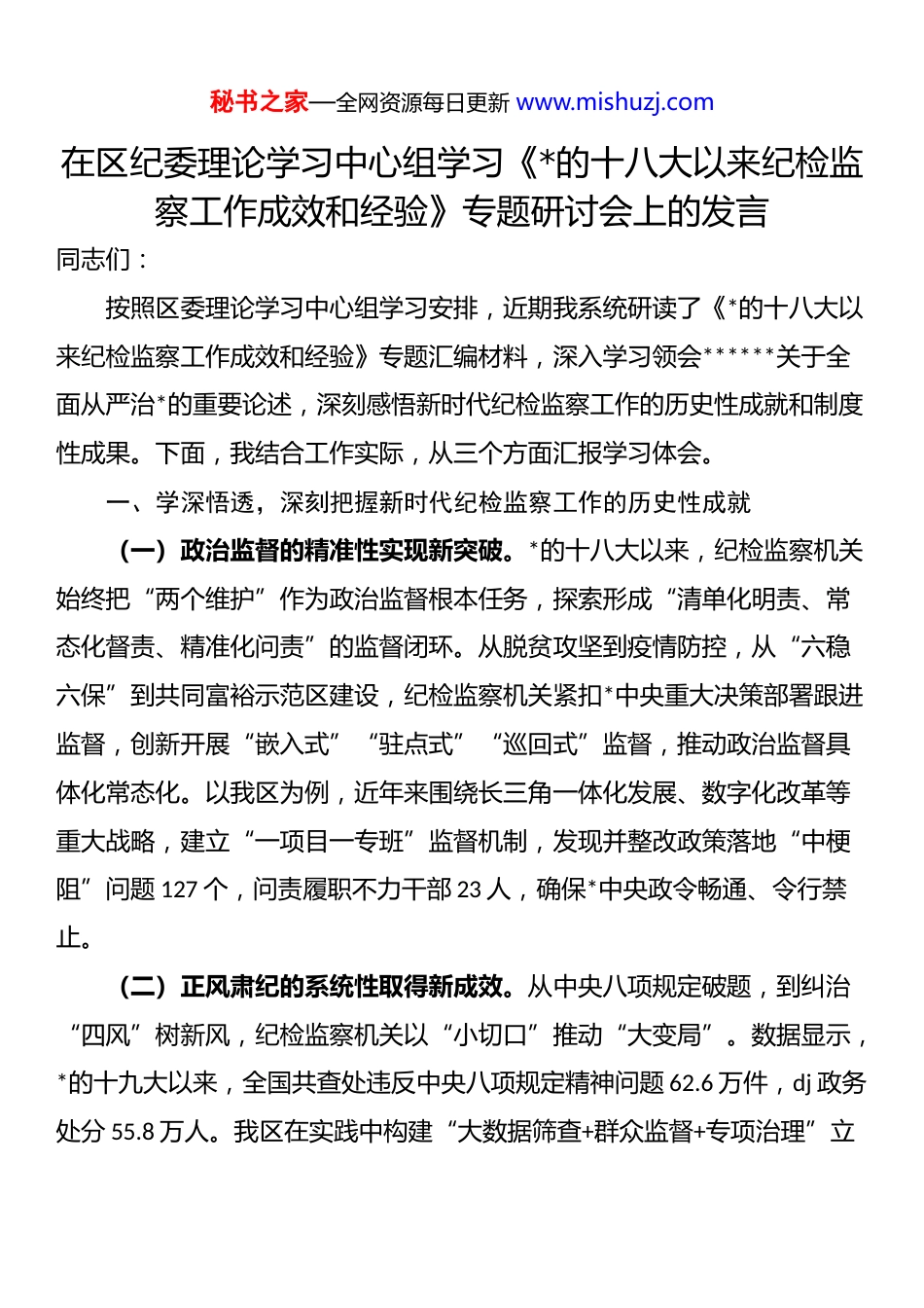 秘书之家—全网资源每日更新 www.mishuzj.com在区纪委理论学习中心组学习《*的十八大以来纪检监察工作成效和经验》专题研讨会上的发言同志们:按照区委理论学习中心组学习安排,近期我系统研读了《*的十八大以来纪检监察工作成效和经验》专题汇编材料,深入学习领会******关于全面从严治*的重要论述,深刻感悟新时代纪检监察工作的历史性成就和制度性成果。下面,我结合工作实际,从三个方面汇报学习体会。一、学深悟透,深刻把握新时代纪检监察工作的历史性成就(一)政治监督的精准性实现新突破。*的十八大以来,纪检监察机关始终把“两个维护”作为政治监督根本任务,探索形成“清单化明责、常态化督责、精准化问责”的监督闭环。从脱贫攻坚到疫情防控,从“六稳六保”到共同富裕示范区建设,纪检监察机关紧扣*中央重大决策部署跟进监督,创新开展“嵌入式”“驻点式”“巡回式”监督,推动政治监督具体化常态化。以我区为例,近年来围绕长三角一体化发展、数字化改革等重大战略,建立“一项目一专班”监督机制,发现并整改政策落地“中梗阻”问题 127 个,问责履职不力干部 23 人,确保*中央政令畅通、令行禁止。(二)正风肃纪的系统性取得新成效。从中央八项规定破题,到纠治“四风”树新风,纪检监察机关以“小切口”推动“大变局”。数据显示,*的十九大以来,全国共查处违反中央八项规定精神问题 62.6 万件,dj 政务处分 55.8 万人。我区在实践中构建“大数据筛查+群众监督+专项治理”立秘书之家—全网资源每日更新 www.mishuzj.com体化监督模式,开发“四风”问题预警平台,整合税务、公车管理等数据资源,精准发现隐形变异“四风”问题。针对基层反映强烈的“文山会海”问题,推动建立发文开会负面清单,全区性会议同比减少 37%,让干部有更多时间抓落实。(三)反腐惩恶的震慑力形成新常态。“打虎”“拍蝇”“猎狐”多管齐下,反腐败斗争取得压倒性胜利并全面巩固。全国纪检监察机关立案审查调查中管干部 624 人,处分厅局级干部 2.6 万人、县处级干部 23.9 万人。我区坚持“全周期管理”理念,构建“受贿行贿一起查”的联合惩戒机制,建立行贿人“黑名单”制度,对 5 家涉案企业实施市场准入限制。在基层治理领域,开展村级集体“三资”管理专项整治,追回资金 1.2 亿元,推动建立“三资”智慧监管平台,相关做法获中央纪委国家监委推介。二、以案为鉴,清醒认识当前纪检监察工作的短板不足(一)“四风”问题隐形变异亟待破解虽然“舌尖上的浪费”“车轮上的腐败”得到有效遏制,但新变种不断出现。有的以“专家评审费”名义违规发放津补贴,有的借“招商引资”之名组织变相公款旅游。我区在监督检查中发现,某单位将超标准接待费用转嫁至下属企业报销,某街道通过虚列会议支出套取资金购买高档烟酒。这些现象表明,作风建设必须常抓不懈、久久为功,坚决防止老问题复燃、新问题萌发、小问题坐大。(二)监督执纪“最后一公里”仍需打通基层监督存在“熟人社会”掣肘,个别纪检监察干部存在“老好人”思想。我区在村社巡察中发现,某村书记利用职务便利,在工程招投标中暗箱操作,连续 5 年未被发现。秘书之家—全网资源每日更新 www.mishuzj.com这暴露出基层监督存在“上级监督远、同级监督软、群众监督弱”的问题。必须创新监督方式,推广运用“小微权力”监督平台,让群众动动手指就能参与监督,真正实现“阳光是最好的防腐剂”。(三)干部队伍能力素质面临新挑战随着监督对象数字化转型,纪检监察干部本领恐慌问题日益凸显。我区在查办某平台经济领域腐败案件时,因缺乏大数据取证能力,导致关键证据固定滞后。这警示我们,必须加强纪检监察干部数字化监督能力培训,建立“实战实训+跟班学习+导师帮带”培养机制,着力培养既懂 dj 法规又懂信息技术的复合型人才。三、勇毅前行,以高质量纪检监察工作护航现代化建设(一)聚焦国之大者,构建政治监督新格局。要完善**********批示精神贯彻落实机制,建立学习-部署-落实-反馈全链条闭环。在学习环节,通过*委(*组)理论学习中心组专题学、*支部三会一课深入学、*员干部个人自主学三...