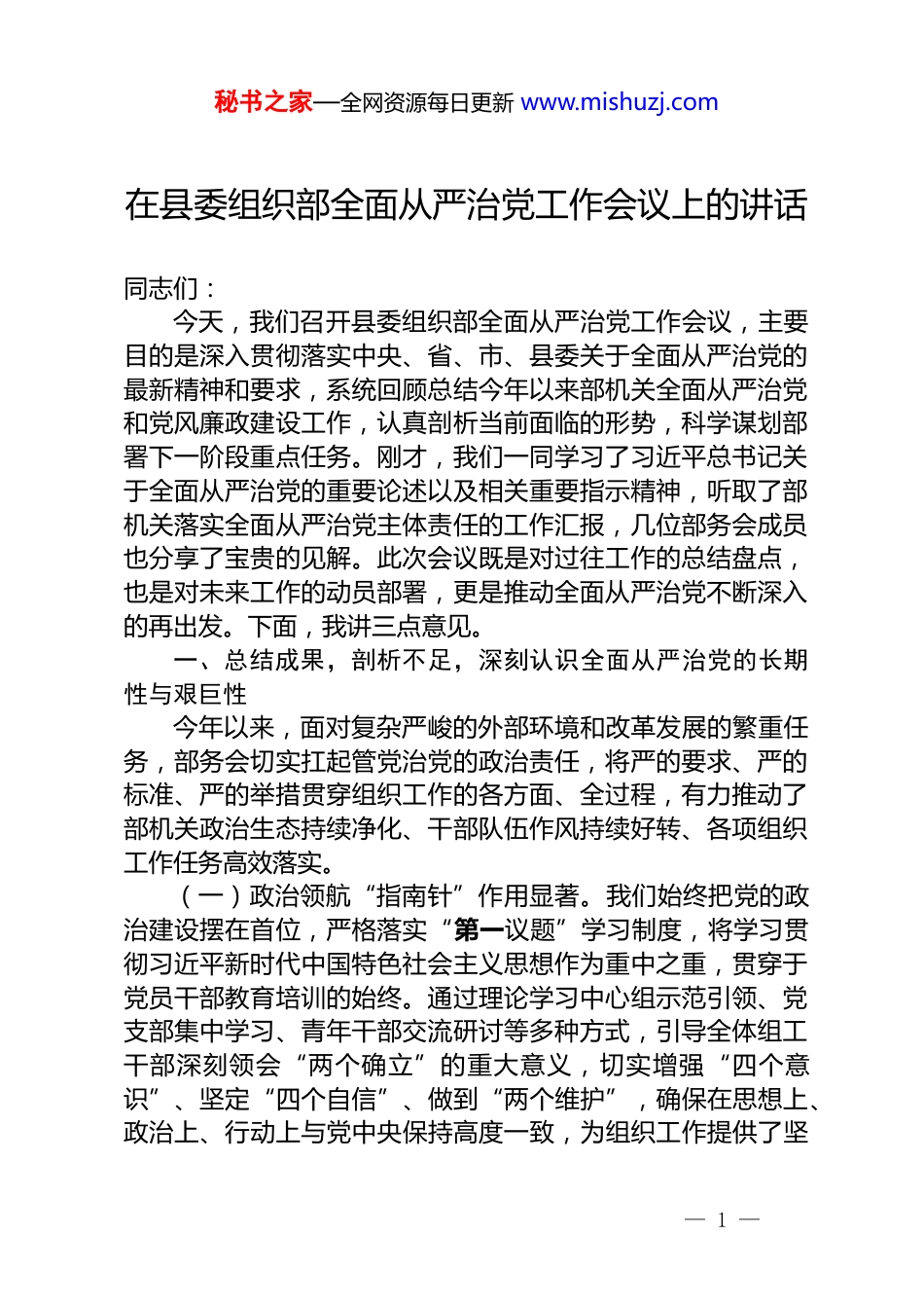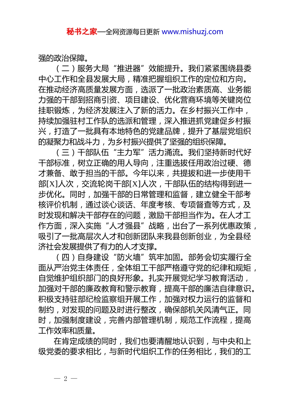 秘书之家—全网资源每日更新 www.mishuzj.com在县委组织部全面从严治党工作会议上的讲话同志们:今天,我们召开县委组织部全面从严治党工作会议,主要目的是深入贯彻落实中央、省、市、县委关于全面从严治党的最新精神和要求,系统回顾总结今年以来部机关全面从严治党和党风廉政建设工作,认真剖析当前面临的形势,科学谋划部署下一阶段重点任务。刚才,我们一同学习了习近平总书记关于全面从严治党的重要论述以及相关重要指示精神,听取了部机关落实全面从严治党主体责任的工作汇报,几位部务会成员也分享了宝贵的见解。此次会议既是对过往工作的总结盘点,也是对未来工作的动员部署,更是推动全面从严治党不断深入的再出发。下面,我讲三点意见。一、总结成果,剖析不足,深刻认识全面从严治党的长期性与艰巨性今年以来,面对复杂严峻的外部环境和改革发展的繁重任务,部务会切实扛起管党治党的政治责任,将严的要求、严的标准、严的举措贯穿组织工作的各方面、全过程,有力推动了部机关政治生态持续净化、干部队伍作风持续好转、各项组织工作任务高效落实。(一)政治领航“指南针”作用显著。我们始终把党的政治建设摆在首位,严格落实“第一议题”学习制度,将学习贯彻习近平新时代中国特色社会主义思想作为重中之重,贯穿于党员干部教育培训的始终。通过理论学习中心组示范引领、党支部集中学习、青年干部交流研讨等多种方式,引导全体组工干部深刻领会“两个确立”的重大意义,切实增强“四个意识”、坚定“四个自信”、做到“两个维护”,确保在思想上、政治上、行动上与党中央保持高度一致,为组织工作提供了坚— 1 —秘书之家—全网资源每日更新 www.mishuzj.com强的政治保障。(二)服务大局“推进器”效能提升。我们紧紧围绕县委中心工作和全县发展大局,精准把握组织工作的定位和方向。在推动经济高质量发展方面,选派了一批政治素质高、业务能力强的干部到招商引资、项目建设、优化营商环境等关键岗位挂职锻炼,为经济发展注入了新的活力。在乡村振兴工作中,持续加强驻村工作队的选派和管理,深入推进抓党建促乡村振兴,打造了一批具有本地特色的党建品牌,提升了基层党组织的凝聚力和战斗力,为乡村振兴提供了坚强的组织保障。(三)干部队伍“主力军”活力涌流。我们坚持新时代好干部标准,树立正确的用人导向,注重选拔任用政治过硬、德才兼备、敢于担当的干部。今年以来,共提拔和进一步使用干部[X]人次,交流轮岗干部[X]人次,干部队伍的结构得到进一步优化。同时,加强干部的日常管理和监督,建立健全干部考核评价机制,通过谈心谈话、年度考核、专项督查等方式,及时发现和解决干部存在的问题,激励干部担当作为。在人才工作方面,深入实施“人才强县”战略,出台了一系列优惠政策,吸引了一批高层次人才和创新团队来我县创新创业,为全县经济社会发展提供了有力的人才支撑。(四)自身建设“防火墙”筑牢加固。部务会切实履行全面从严治党主体责任,全体组工干部严格遵守党的纪律和规矩,自觉维护组织部门的良好形象。扎实开展党纪学习教育活动,加强对干部的廉政教育和警示教育,提高干部的廉洁自律意识。积极支持驻部纪检监察组开展工作,加强对权力运行的监督和制约,对发现的问题及时进行整改,确保部机关风清气正。同时,加强制度建设,完善内部管理机制,规范工作流程,提高工作效率和质量。在肯定成绩的同时,我们也要清醒地认识到,与中央和上级党委的要求相比,与新时代组织工作的任务相比,我们的工— 2 —秘书之家—全网资源每日更新 www.mishuzj.com作还存在一些差距和不足。比如,在理论学习方面,还存在学用结合不够紧密的问题,部分干部对党的创新理论理解不够深入,运用理论指导实践的能力还有待提高。在服务大局方面,还存在前瞻性不够、精准度不高的问题,对县委中心工作的把握还不够精准,组织工作与业务工作的融合还不够紧密。在干部监督管理方面,还存在手段不够丰富、力度不够大的问题,对干部“八小时之外”的监督还存在薄弱环节。在自身建设方面,还存在工作作风不够扎实、创新意识不够强的问题,部分干部存在安于现状、不...
