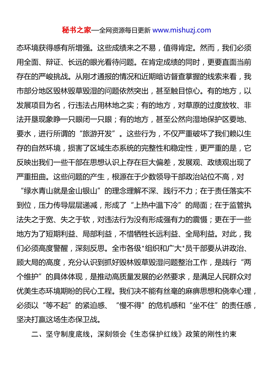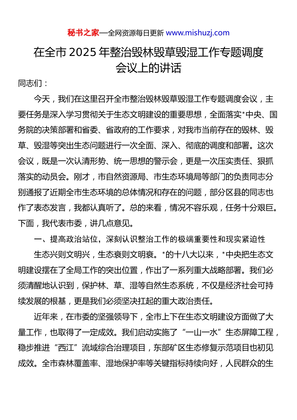 秘书之家—全网资源每日更新 www.mishuzj.com在全市 2025 年整治毁林毁草毁湿工作专题调度会议上的讲话同志们:今天,我们在这里召开全市整治毁林毁草毁湿工作专题调度会议,主要任务是深入学习贯彻关于生态文明建设的重要思想,全面落实*中央、国务院的决策部署和省委、省政府的工作要求,对我市当前存在的毁林、毁草、毁湿等突出生态问题进行一次全面、深入、彻底的调度和部署。这次会议,既是一次认清形势、统一思想的警示会,更是一次压实责任、狠抓落实的动员会。刚才,市自然资源局、市生态环境局等部门的负责同志分别通报了近期全市生态环境的总体情况和存在的问题,部分区县的同志也作了表态发言,我都认真听了。总的来看,情况不容乐观,任务十分艰巨。下面,我代表市委,讲几点意见。一、提高政治站位,深刻认识整治工作的极端重要性和现实紧迫性生态兴则文明兴,生态衰则文明衰。*的十八大以来,*中央把生态文明建设摆在了全局工作的突出位置,作出了一系列重大战略部署。我们必须清醒地认识到,保护林、草、湿等自然生态系统,不仅是经济社会可持续发展的根基,更是我们必须坚决扛起的重大政治责任。近年来,在市委的坚强领导下,全市上下在生态文明建设方面做了大量工作,也取得了一定成效。我们启动实施了“一山一水”生态屏障工程,稳步推进“西江”流域综合治理项目,东部矿区生态修复示范项目也初见成效。全市森林覆盖率、湿地保护率等关键指标持续向好,人民群众的生秘书之家—全网资源每日更新 www.mishuzj.com态环境获得感有所增强。这些成绩来之不易,值得肯定。然而,我们必须用全面、辩证、长远的眼光看待问题。在肯定成绩的同时,更要直面当前存在的严峻挑战。从刚才通报的情况和近期暗访督查掌握的线索来看,我市部分地区毁林毁草毁湿的问题依然突出,甚至触目惊心。有的地方,以发展项目为名,行违法占用林地之实;有的地方,对草原的过度放牧、非法开垦现象睁一只眼闭一只眼;有的地方,甚至公然向湿地保护区要地、要水,进行所谓的“旅游开发”。这些行为,不仅严重破坏了我们赖以生存的自然环境,损害了区域生态系统的完整性和稳定性,更严重的是,它反映出我们一些干部在思想认识上存在巨大偏差,发展观、政绩观出现了严重扭曲。这些问题的产生,根源在于少数领导干部政治站位不高,对“绿水青山就是金山银山”的理念理解不深、践行不力;在于责任落实不到位,压力传导层层递减,形成了“上热中温下冷”的局面;在于监管执法失之于宽、失之于软,对违法行为没有形成强有力的震慑;更在于一些地方为了短期利益、局部利益,不惜牺牲长远利益、全局利益。对此,我们必须高度警醒,深刻反思。全市各级*组织和广大*员干部要从讲政治、顾大局的高度,充分认识到抓好毁林毁草毁湿问题整治工作,是践行“两个维护”的具体体现,是推动高质量发展的必然要求,是满足人民群众对优美生态环境期盼的民心工程。我们决不能有丝毫的麻痹思想和侥幸心理,必须以“等不起”的紧迫感、“慢不得”的危机感和“坐不住”的责任感,坚决打赢这场生态保卫战。二、坚守制度底线,深刻领会《生态保护红线》政策的刚性约束秘书之家—全网资源每日更新 www.mishuzj.com国之大事,必有法式。生态文明建设要行稳致远,必须依靠最严格的制度、最严密的法治。中共中央、国务院印发的《关于划定并严守生态保护红线的若干意见》,为我们划定了生态安全的底线和生命线。《生态保护红线》政策,不是一个建议、一个号召,而是必须严格遵守的法律法规和制度规矩,是生态环境领域带电的“高压线”。首先,要深刻理解生态保护红线的战略内涵。生态保护红线,并不仅仅是一条地理上的空间界线,更是一套实施严格源头保护的制度设计。它将我国生态功能最重要、生态环境最敏感、生物多样性最富集的区域识别出来,实施强制性、刚性的保护措施。其核心要义,就是从源头管控人类活动对自然生态空间的占用和扰动,确保核心生态功能不降低、面积不减少、性质不改变。我市划定的生态保护红线区域,涵盖了重要的水源涵养区、生物多样性维护区和水土流失重点防治区,是我们城市永续发展的“生命线”...