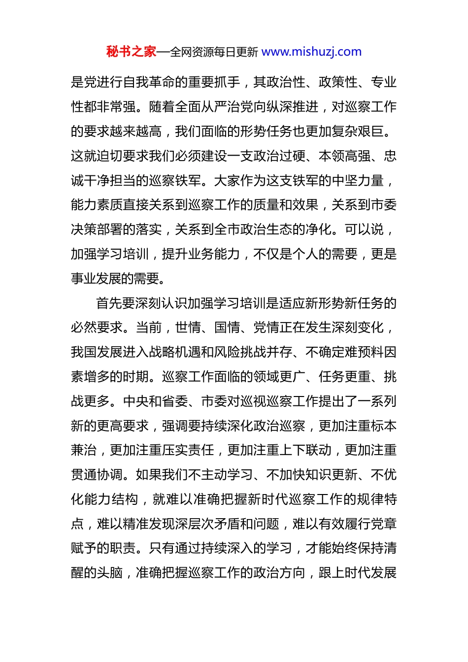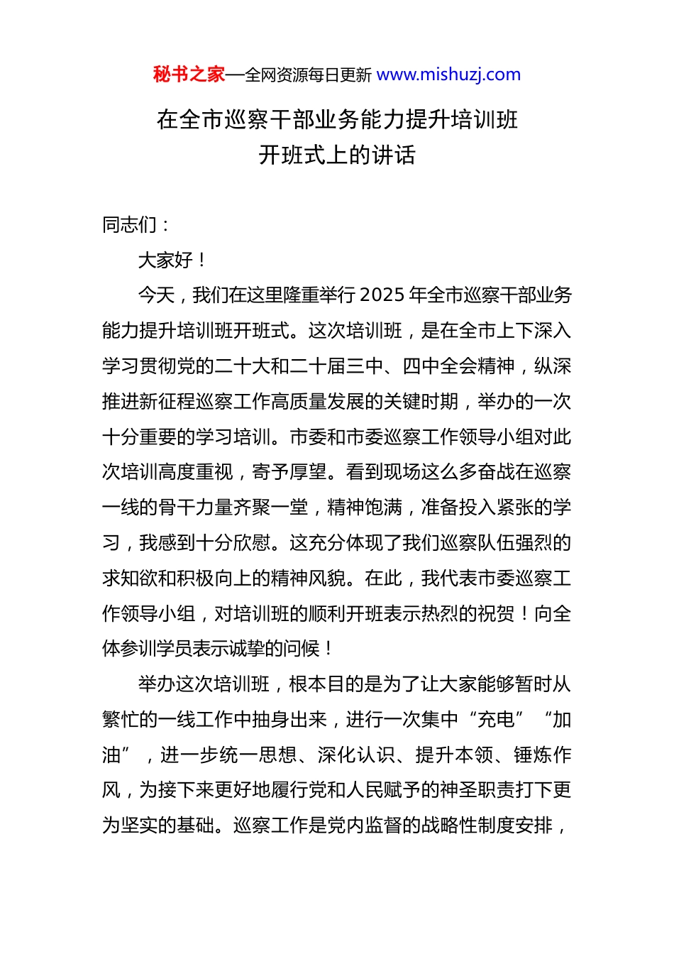 秘书之家—全网资源每日更新 www.mishuzj.com在全市巡察干部业务能力提升培训班开班式上的讲话 同志们:大家好!今天,我们在这里隆重举行 2025 年全市巡察干部业务能力提升培训班开班式。这次培训班,是在全市上下深入学习贯彻党的二十大和二十届三中、四中全会精神,纵深推进新征程巡察工作高质量发展的关键时期,举办的一次十分重要的学习培训。市委和市委巡察工作领导小组对此次培训高度重视,寄予厚望。看到现场这么多奋战在巡察一线的骨干力量齐聚一堂,精神饱满,准备投入紧张的学习,我感到十分欣慰。这充分体现了我们巡察队伍强烈的求知欲和积极向上的精神风貌。在此,我代表市委巡察工作领导小组,对培训班的顺利开班表示热烈的祝贺!向全体参训学员表示诚挚的问候!举办这次培训班,根本目的是为了让大家能够暂时从繁忙的一线工作中抽身出来,进行一次集中“充电”“加油”,进一步统一思想、深化认识、提升本领、锤炼作风,为接下来更好地履行党和人民赋予的神圣职责打下更为坚实的基础。巡察工作是党内监督的战略性制度安排,秘书之家—全网资源每日更新 www.mishuzj.com是党进行自我革命的重要抓手,其政治性、政策性、专业性都非常强。随着全面从严治党向纵深推进,对巡察工作的要求越来越高,我们面临的形势任务也更加复杂艰巨。这就迫切要求我们必须建设一支政治过硬、本领高强、忠诚干净担当的巡察铁军。大家作为这支铁军的中坚力量,能力素质直接关系到巡察工作的质量和效果,关系到市委决策部署的落实,关系到全市政治生态的净化。可以说,加强学习培训,提升业务能力,不仅是个人的需要,更是事业发展的需要。首先要深刻认识加强学习培训是适应新形势新任务的必然要求。当前,世情、国情、党情正在发生深刻变化,我国发展进入战略机遇和风险挑战并存、不确定难预料因素增多的时期。巡察工作面临的领域更广、任务更重、挑战更多。中央和省委、市委对巡视巡察工作提出了一系列新的更高要求,强调要持续深化政治巡察,更加注重标本兼治,更加注重压实责任,更加注重上下联动,更加注重贯通协调。如果我们不主动学习、不加快知识更新、不优化能力结构,就难以准确把握新时代巡察工作的规律特点,难以精准发现深层次矛盾和问题,难以有效履行党章赋予的职责。只有通过持续深入的学习,才能始终保持清醒的头脑,准确把握巡察工作的政治方向,跟上时代发展秘书之家—全网资源每日更新 www.mishuzj.com的步伐,适应事业发展的需要。同时要深刻认识加强学习培训是解决本领恐慌、提升监督质效的迫切需要。巡察工作本质上是政治监督,要善于从业务看政治、从问题看责任、从现象看本质。这需要我们具备多方面的能力,比如发现问题的能力、分析判断的能力、政策把握的能力、群众工作的能力、文字综合的能力等等。在实际工作中,我们有些同志可能还存在“老办法不管用、新办法不会用”的困惑,在精准发现问题的深度、定性分析的准度、提出建议的高度上还有提升空间。特别是在面对一些专业性较强的领域,如金融、国企、工程建设、信息化等,更容易感到知识储备不足、方法手段不多。这次培训,正是针对大家在实际工作中遇到的难点、堵点,设置了相应的课程,邀请了理论功底扎实、实践经验丰富的领导和专家进行授课,目的就是帮助大家弥补知识弱项、能力短板、经验盲区,切实提高透过现象看本质、精准发现和分析问题的能力,使我们的巡察监督更加精准、更加有力、更加有效。更重要的是深刻认识加强学习培训是加强队伍建设、锻造巡察铁军的重要途径。打铁必须自身硬。巡察干部队伍的形象和素质,直接关系到巡察的公信力。我们必须时刻保持“赶考”的清醒和坚定,把加强自身建设摆在突出秘书之家—全网资源每日更新 www.mishuzj.com位置。学习不仅是提升业务能力的过程,更是锤炼党性、修养心性、严明纪律的过程。要通过学习,进一步筑牢对党忠诚的政治品格,进一步强化纪律规矩意识,进一步弘扬担当实干的精神,进一步坚守清正廉洁的底线。希望大家把学习培训作为一次深刻的党性锻炼,不断提高政治判断力、政治领悟力、政治执行力,努力成为一支让党放心、人民信赖的忠诚...