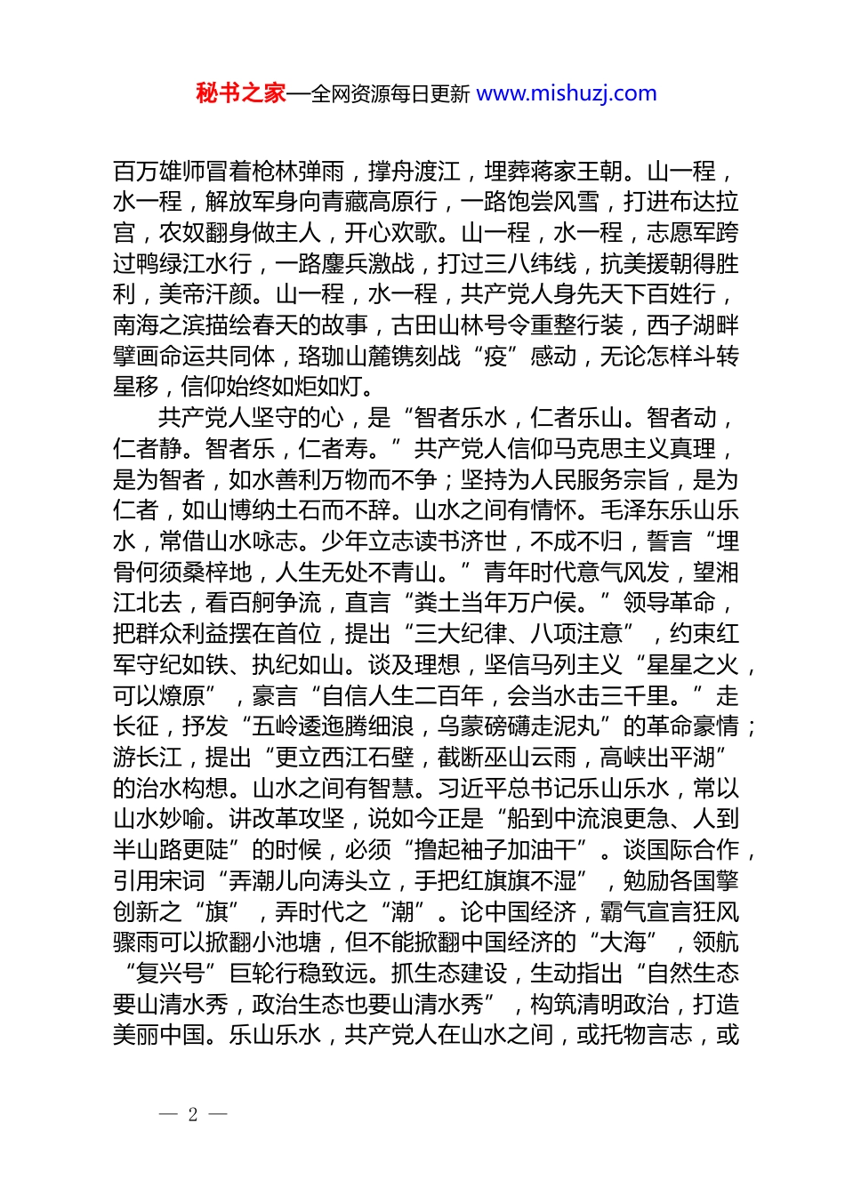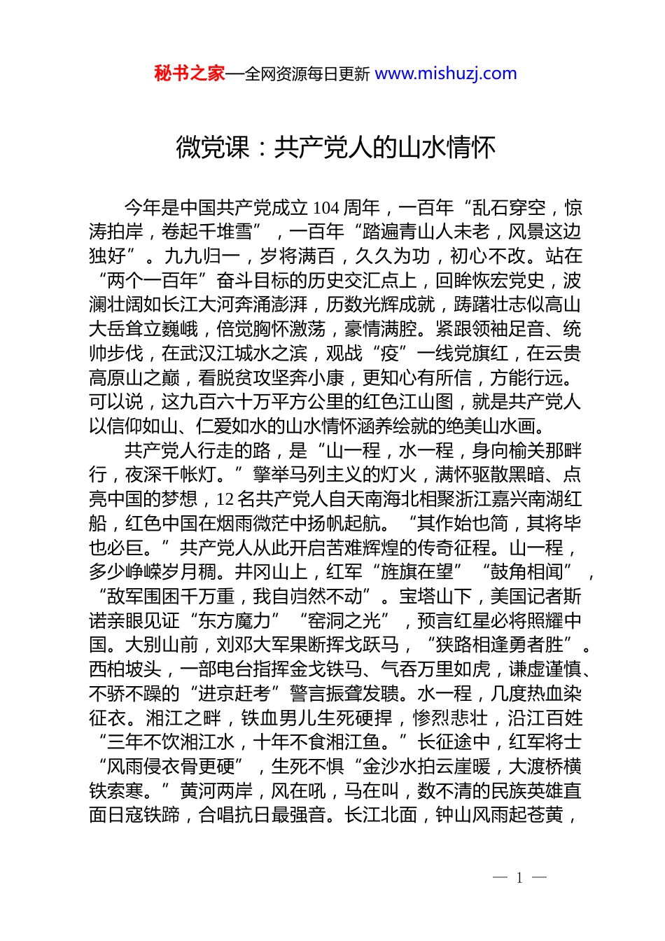 秘书之家—全网资源每日更新 www.mishuzj.com微党课:共产党人的山水情怀今年是中国共产党成立 104 周年,一百年“乱石穿空,惊涛拍岸,卷起千堆雪”,一百年“踏遍青山人未老,风景这边独好”。九九归一,岁将满百,久久为功,初心不改。站在“两个一百年”奋斗目标的历史交汇点上,回眸恢宏党史,波澜壮阔如长江大河奔涌澎湃,历数光辉成就,踌躇壮志似高山大岳耸立巍峨,倍觉胸怀激荡,豪情满腔。紧跟领袖足音、统帅步伐,在武汉江城水之滨,观战“疫”一线党旗红,在云贵高原山之巅,看脱贫攻坚奔小康,更知心有所信,方能行远。可以说,这九百六十万平方公里的红色江山图,就是共产党人以信仰如山、仁爱如水的山水情怀涵养绘就的绝美山水画。共产党人行走的路,是“山一程,水一程,身向榆关那畔行,夜深千帐灯。”擎举马列主义的灯火,满怀驱散黑暗、点亮中国的梦想,12 名共产党人自天南海北相聚浙江嘉兴南湖红船,红色中国在烟雨微茫中扬帆起航。“其作始也简,其将毕也必巨。”共产党人从此开启苦难辉煌的传奇征程。山一程,多少峥嵘岁月稠。井冈山上,红军“旌旗在望”“鼓角相闻”,“敌军围困千万重,我自岿然不动”。宝塔山下,美国记者斯诺亲眼见证“东方魔力”“窑洞之光”,预言红星必将照耀中国。大别山前,刘邓大军果断挥戈跃马,“狭路相逢勇者胜”。西柏坡头,一部电台指挥金戈铁马、气吞万里如虎,谦虚谨慎、不骄不躁的“进京赶考”警言振聋发聩。水一程,几度热血染征衣。湘江之畔,铁血男儿生死硬捍,惨烈悲壮,沿江百姓“三年不饮湘江水,十年不食湘江鱼。”长征途中,红军将士“风雨侵衣骨更硬”,生死不惧“金沙水拍云崖暖,大渡桥横铁索寒。”黄河两岸,风在吼,马在叫,数不清的民族英雄直面日寇铁蹄,合唱抗日最强音。长江北面,钟山风雨起苍黄,— 1 —秘书之家—全网资源每日更新 www.mishuzj.com百万雄师冒着枪林弹雨,撑舟渡江,埋葬蒋家王朝。山一程,水一程,解放军身向青藏高原行,一路饱尝风雪,打进布达拉宫,农奴翻身做主人,开心欢歌。山一程,水一程,志愿军跨过鸭绿江水行,一路鏖兵激战,打过三八纬线,抗美援朝得胜利,美帝汗颜。山一程,水一程,共产党人身先天下百姓行,南海之滨描绘春天的故事,古田山林号令重整行装,西子湖畔擘画命运共同体,珞珈山麓镌刻战“疫”感动,无论怎样斗转星移,信仰始终如炬如灯。共产党人坚守的心,是“智者乐水,仁者乐山。智者动,仁者静。智者乐,仁者寿。”共产党人信仰马克思主义真理,是为智者,如水善利万物而不争;坚持为人民服务宗旨,是为仁者,如山博纳土石而不辞。山水之间有情怀。毛泽东乐山乐水,常借山水咏志。少年立志读书济世,不成不归,誓言“埋骨何须桑梓地,人生无处不青山。”青年时代意气风发,望湘江北去,看百舸争流,直言“粪土当年万户侯。”领导革命,把群众利益摆在首位,提出“三大纪律、八项注意”,约束红军守纪如铁、执纪如山。谈及理想,坚信马列主义“星星之火,可以燎原”,豪言“自信人生二百年,会当水击三千里。”走长征,抒发“五岭逶迤腾细浪,乌蒙磅礴走泥丸”的革命豪情;游长江,提出“更立西江石壁,截断巫山云雨,高峡出平湖”的治水构想。山水之间有智慧。习近平总书记乐山乐水,常以山水妙喻。讲改革攻坚,说如今正是“船到中流浪更急、人到半山路更陡”的时候,必须“撸起袖子加油干”。谈国际合作,引用宋词“弄潮儿向涛头立,手把红旗旗不湿”,勉励各国擎创新之“旗”,弄时代之“潮”。论中国经济,霸气宣言狂风骤雨可以掀翻小池塘,但不能掀翻中国经济的“大海”,领航“复兴号”巨轮行稳致远。抓生态建设,生动指出“自然生态要山清水秀,政治生态也要山清水秀”,构筑清明政治,打造美丽中国。乐山乐水,共产党人在山水之间,或托物言志,或— 2 —秘书之家—全网资源每日更新 www.mishuzj.com明理见心,对真理信仰更笃,智者无忧,和百姓感情更深,仁者无敌。党员干部的山水情怀,当如“海纳百川,有容乃大;壁立千仞,无欲则刚。”党员干部是党的细胞和触手,需涵养山水之情,以山为友,友山之坚;以水为师,师水之柔。在一友...