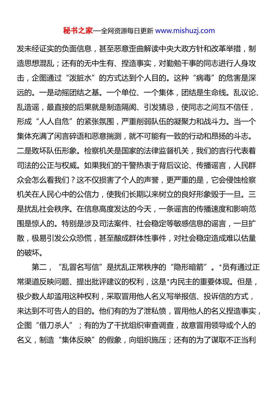 秘书之家—全网资源每日更新 www.mishuzj.com*课:坚守纪律底线,涵养清风正气,坚决向“三乱”现象亮剑同志们:今天,我们机关*支部召开一次专题*课,主题是整治“乱议论造谣、乱冒名写信、乱诬告陷害”这“三乱”现象。召开这次会议,组织这次*课,目的非常明确,就是要引导我们全体*员干警,深刻认识“三乱”的极端危害性,自觉划清界限、坚决予以抵制,进一步巩固我们*县人民检察院风清气正的政治生态和干事创业的良好环境。这既是深入贯彻落实*中央关于全面从严治*战略部署的必然要求,也是我们加强自身队伍建设、确保检察权始终为人民正确行使的现实需要。下面,我围绕这个主题,讲几点意见,与同志们共同交流、共勉。一、深刻认识“三乱”现象的现实表现与严重危害,始终保持高度的政治警醒“三乱”现象不是小事,而是侵蚀*的肌体、污染政治生态的“毒瘤”。它像一种无声的瘟疫,在我们队伍内部悄然传播,如果我们不能及时发现、坚决清除,必将贻害无穷。我们必须用“显微镜”来审视其具体表现,用“放大镜”来看清其严重危害。第一,“乱议论造谣”是侵蚀思想根基的“政治病毒”。这种现象的表现形式多种多样,有的热衷于传播“小道消息”,把道听途说当作新闻发布,把捕风捉影当作事实依据,在背后对单位决策、同事言行评头论足、说三道四;有的则通过微信群、朋友圈等网络平台,匿名或化名发布、转秘书之家—全网资源每日更新 www.mishuzj.com发未经证实的负面信息,甚至恶意歪曲解读中央大政方针和改革举措,制造思想混乱;还有的无中生有、捏造事实,对勤勉干事的同志进行人身攻击,企图通过“泼脏水”的方式达到个人目的。这种“病毒”的危害是深远的。一是动摇团结之基。一个单位、一个集体,团结是生命线。乱议论、乱造谣,最直接的后果就是制造隔阂、引发猜忌,使同志之间互不信任,形成“人人自危”的紧张氛围,严重削弱队伍的凝聚力和战斗力。当一个集体充满了闲言碎语和恶意揣测,就不可能有一致的行动和昂扬的斗志。二是败坏队伍形象。检察机关是国家的法律监督机关,我们的言行代表着司法的公正与权威。如果我们的干警热衷于背后议论、传播谣言,人民群众会怎么看我们?这不仅损害了个人的声誉,更严重的是,它会侵蚀检察机关在人民心中的公信力,使我们长期以来树立的良好形象毁于一旦。三是扰乱社会秩序。在信息高度发达的今天,一条谣言的传播速度和影响范围是惊人的。特别是涉及司法案件、社会稳定等敏感信息的谣言,一旦扩散,极易引发公众恐慌,甚至酿成群体性事件,对社会稳定造成难以估量的破坏。第二,“乱冒名写信”是扰乱正常秩序的“隐形暗箭”。*员有通过正常渠道反映问题、提出批评建议的权利,这是*内民主的重要体现。但是,极少数人却滥用这种权利,采取冒用他人名义写举报信、投诉信的方式,来达到不可告人的目的。他们有的为了泄私愤,冒用他人的名义捏造事实,企图“借刀杀人”;有的为了干扰组织审查调查,故意冒用领导或个人的名义,制造“集体反映”的假象,向组织施压;还有的为了谋取不正当利秘书之家—全网资源每日更新 www.mishuzj.com益,在干部提拔、评先评优等关键时期,冒名写信搅乱局势。这种行为,如同射出的“隐形暗箭”,其危害在于:一是严重侵犯他人合法权益。姓名权是公民的基本权利,受法律保护。乱冒名写信,直接侵犯了被冒名者的姓名权和名誉权,使其无辜受过,承受不白之冤,给他们的工作和生活带来巨大困扰。二是严重干扰信访举报秩序。信访举报是*和政府联系群众的桥梁,是监督干部的重要渠道。乱冒名写信的行为,混淆视听,增加了纪检监察和组织部门的甄别难度,浪费了大量的调查资源,让真正需要解决的问题得不到及时处理,严重破坏了正常的信访秩序。三是严重破坏组织信任。这种行为在干部队伍中制造了极大的不信任感,让大家相互提防,不敢坦诚交流,破坏了健康的同志关系,使正常的批评和自我批评难以开展。第三,“乱诬告陷害”是污染政治生态的“最大恶源”。如果说乱议论是“口头污染”,乱冒名是“程序骚扰”,那么乱诬告陷害就是赤裸的“政治迫害”,是性质最为恶劣、危害最为严重的行为。其核心就...