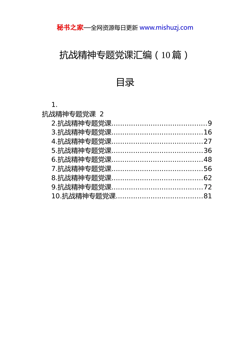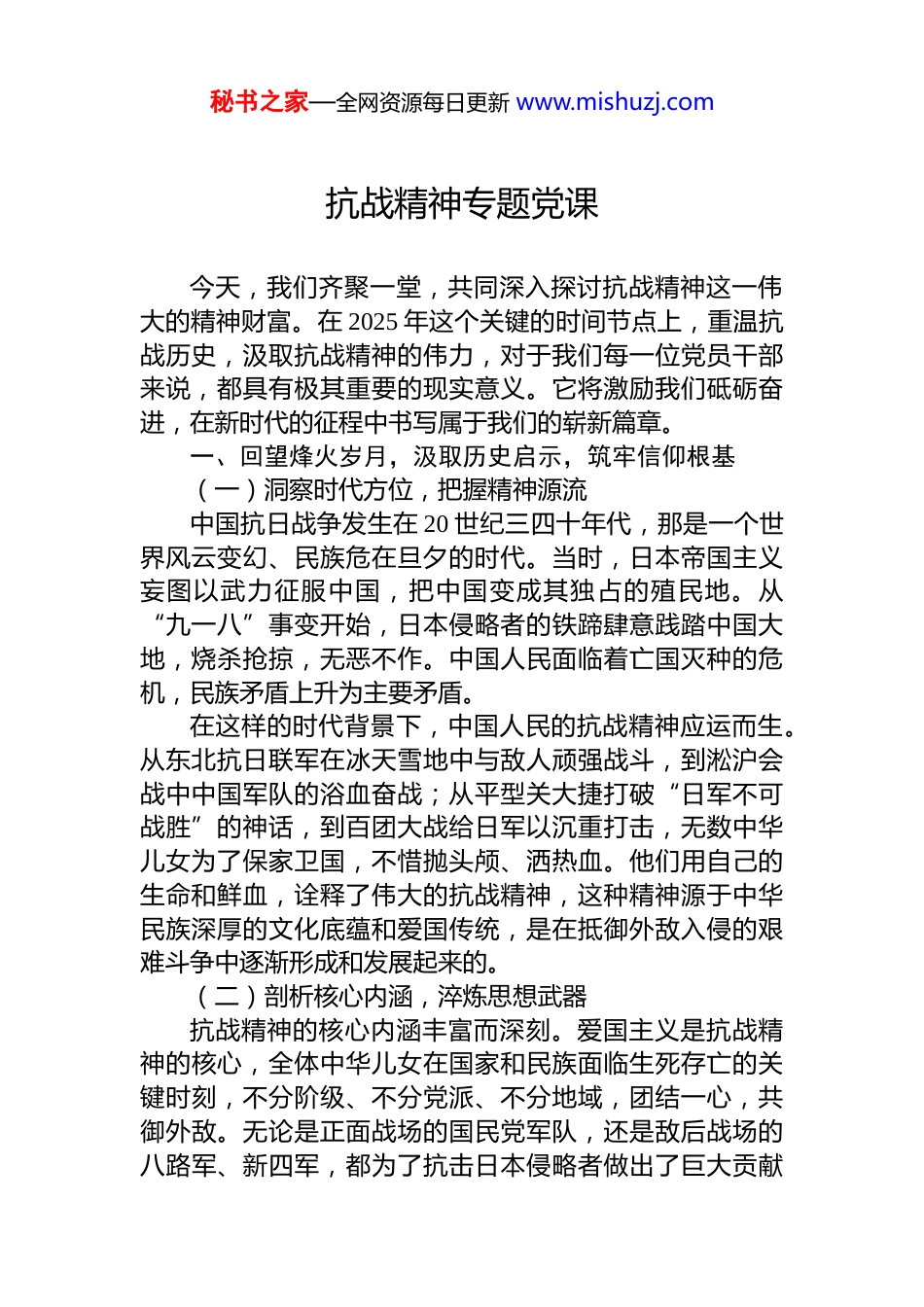 秘书之家—全网资源每日更新 www.mishuzj.com抗战精神专题党课汇编(10 篇)目录1.抗战精神专题党课 22.抗战精神专题党课............................................93.抗战精神专题党课..........................................164.抗战精神专题党课..........................................275.抗战精神专题党课..........................................366.抗战精神专题党课..........................................487.抗战精神专题党课..........................................568.抗战精神专题党课..........................................629.抗战精神专题党课..........................................7210.抗战精神专题党课........................................81秘书之家—全网资源每日更新 www.mishuzj.com抗战精神专题党课今天,我们齐聚一堂,共同深入探讨抗战精神这一伟大的精神财富。在 2025 年这个关键的时间节点上,重温抗战历史,汲取抗战精神的伟力,对于我们每一位党员干部来说,都具有极其重要的现实意义。它将激励我们砥砺奋进,在新时代的征程中书写属于我们的崭新篇章。一、回望烽火岁月,汲取历史启示,筑牢信仰根基(一)洞察时代方位,把握精神源流中国抗日战争发生在 20 世纪三四十年代,那是一个世界风云变幻、民族危在旦夕的时代。当时,日本帝国主义妄图以武力征服中国,把中国变成其独占的殖民地。从“九一八”事变开始,日本侵略者的铁蹄肆意践踏中国大地,烧杀抢掠,无恶不作。中国人民面临着亡国灭种的危机,民族矛盾上升为主要矛盾。在这样的时代背景下,中国人民的抗战精神应运而生。从东北抗日联军在冰天雪地中与敌人顽强战斗,到淞沪会战中中国军队的浴血奋战;从平型关大捷打破“日军不可战胜”的神话,到百团大战给日军以沉重打击,无数中华儿女为了保家卫国,不惜抛头颅、洒热血。他们用自己的生命和鲜血,诠释了伟大的抗战精神,这种精神源于中华民族深厚的文化底蕴和爱国传统,是在抵御外敌入侵的艰难斗争中逐渐形成和发展起来的。(二)剖析核心内涵,淬炼思想武器抗战精神的核心内涵丰富而深刻。爱国主义是抗战精神的核心,全体中华儿女在国家和民族面临生死存亡的关键时刻,不分阶级、不分党派、不分地域,团结一心,共御外敌。无论是正面战场的国民党军队,还是敌后战场的八路军、新四军,都为了抗击日本侵略者做出了巨大贡献秘书之家—全网资源每日更新 www.mishuzj.com无数爱国志士毁家纾难,奔赴抗日前线,体现了对祖国的无限忠诚和热爱。英勇顽强、不畏牺牲的精神也是抗战精神的重要体现。在战斗中,中国军民面对装备精良、残暴凶狠的日本侵略者,毫不退缩,奋勇抵抗。狼牙山五壮士为了掩护群众和部队转移,毅然跳下悬崖;八女投江的英雄事迹,展现了巾帼英雄的豪迈气概。他们以血肉之躯,筑起了保卫祖国的钢铁长城。同时,抗战精神还包括坚韧不拔、自力更生的精神。在长期的抗战过程中,中国面临着巨大的困难和压力,但中国人民没有被困难吓倒,而是凭借着顽强的意志和坚韧不拔的精神,坚持抗战到底。并且,中国人民依靠自己的力量,发展生产,保障供给,为抗战的胜利奠定了坚实的物质基础。(三)明晰历史地位,坚定文化自信抗战精神在中国历史上具有举足轻重的地位。它是中华民族精神的重要组成部分,是中华民族在抗日战争时期的集中体现。抗日战争的胜利,是近代以来中国反抗外敌入侵第一次取得完全胜利的民族解放战争,而抗战精神则是取得这一伟大胜利的强大精神动力。抗战精神不仅在中国历史上留下了浓墨重彩的一笔,也在世界反法西斯战争史上闪耀着光芒。中国的抗日战争是世界反法西斯战争的重要组成部分,中国人民为世界反法西斯战争的胜利做出了巨大的贡献。抗战精神所体现的正义、和平、团结等价值观念,与世界反法西斯战争的精神相契合,为世界和平与发展做出了积极贡献。我们要从抗战精神中汲取力量,坚定文化自信。中华民族有着悠久的历史和灿烂的文化,抗战精神是中华文化的瑰宝,它彰显了中华民族的伟大品格和精神风貌。我们要传承和弘扬抗战精神,让中华文化在新时代焕...