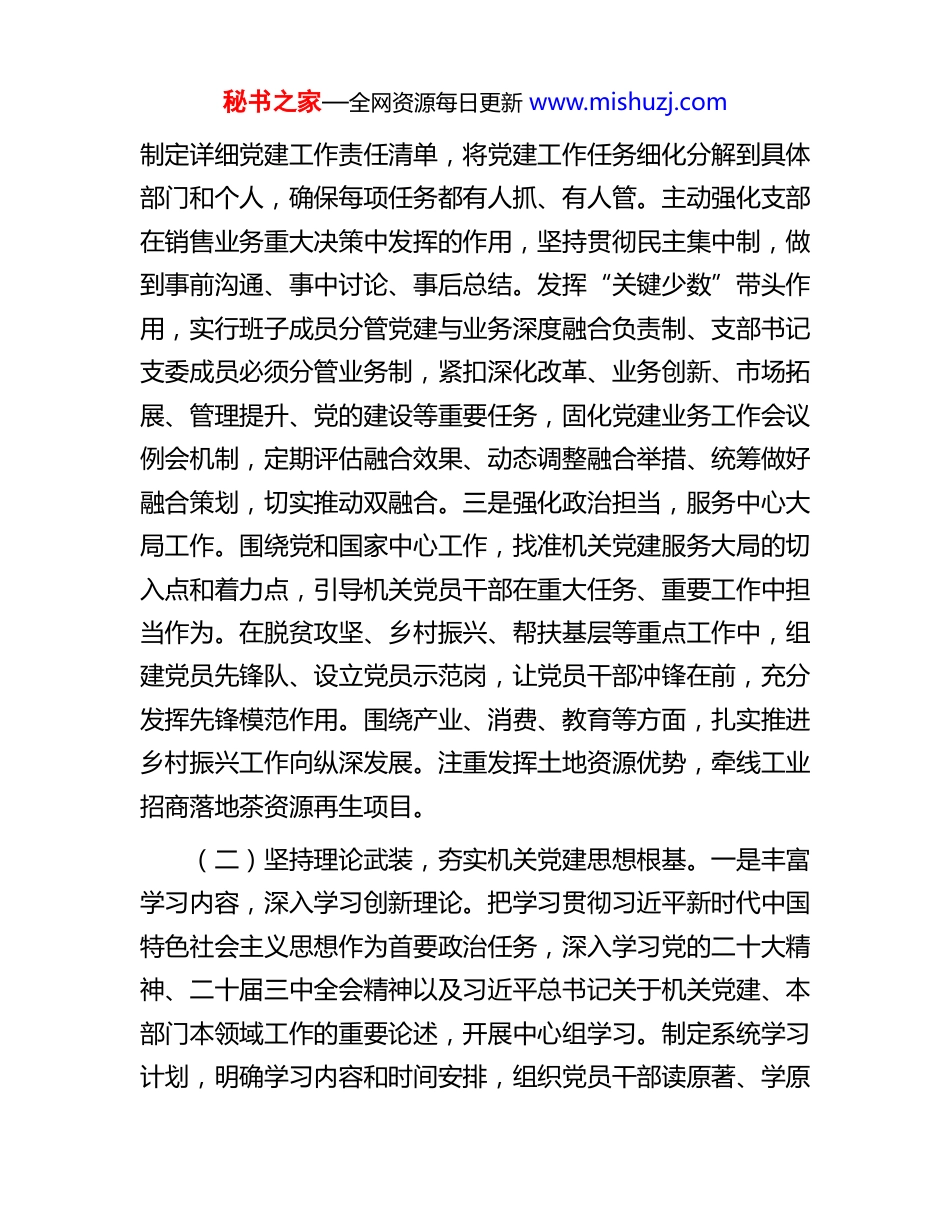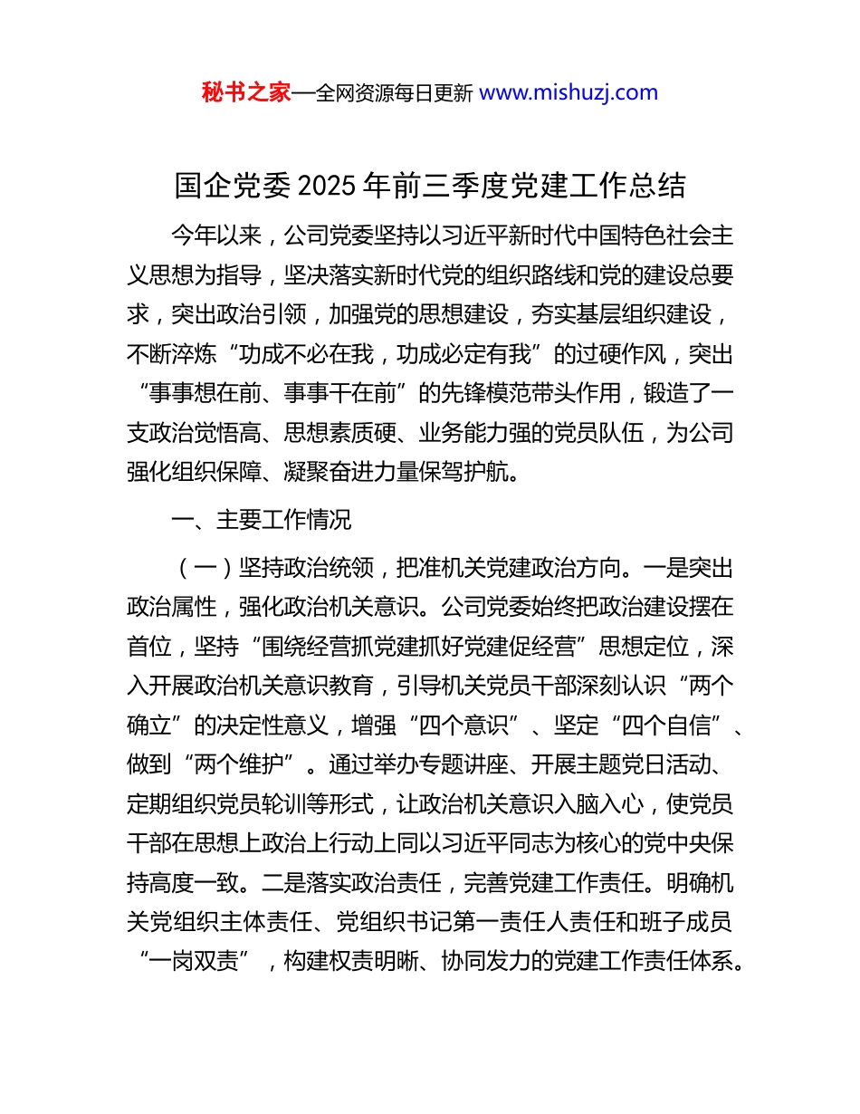 秘书之家—全网资源每日更新 www.mishuzj.com国企党委 2025 年前三季度党建工作总结今年以来,公司党委坚持以习近平新时代中国特色社会主义思想为指导,坚决落实新时代党的组织路线和党的建设总要求,突出政治引领,加强党的思想建设,夯实基层组织建设,不断淬炼“功成不必在我,功成必定有我”的过硬作风,突出“事事想在前、事事干在前”的先锋模范带头作用,锻造了一支政治觉悟高、思想素质硬、业务能力强的党员队伍,为公司强化组织保障、凝聚奋进力量保驾护航。一、主要工作情况(一)坚持政治统领,把准机关党建政治方向。一是突出政治属性,强化政治机关意识。公司党委始终把政治建设摆在首位,坚持“围绕经营抓党建抓好党建促经营”思想定位,深入开展政治机关意识教育,引导机关党员干部深刻认识“两个确立”的决定性意义,增强“四个意识”、坚定“四个自信”、做到“两个维护”。通过举办专题讲座、开展主题党日活动、定期组织党员轮训等形式,让政治机关意识入脑入心,使党员干部在思想上政治上行动上同以习近平同志为核心的党中央保持高度一致。二是落实政治责任,完善党建工作责任。明确机关党组织主体责任、党组织书记第一责任人责任和班子成员“一岗双责”,构建权责明晰、协同发力的党建工作责任体系。秘书之家—全网资源每日更新 www.mishuzj.com制定详细党建工作责任清单,将党建工作任务细化分解到具体部门和个人,确保每项任务都有人抓、有人管。主动强化支部在销售业务重大决策中发挥的作用,坚持贯彻民主集中制,做到事前沟通、事中讨论、事后总结。发挥“关键少数”带头作用,实行班子成员分管党建与业务深度融合负责制、支部书记支委成员必须分管业务制,紧扣深化改革、业务创新、市场拓展、管理提升、党的建设等重要任务,固化党建业务工作会议例会机制,定期评估融合效果、动态调整融合举措、统筹做好融合策划,切实推动双融合。三是强化政治担当,服务中心大局工作。围绕党和国家中心工作,找准机关党建服务大局的切入点和着力点,引导机关党员干部在重大任务、重要工作中担当作为。在脱贫攻坚、乡村振兴、帮扶基层等重点工作中,组建党员先锋队、设立党员示范岗,让党员干部冲锋在前,充分发挥先锋模范作用。围绕产业、消费、教育等方面,扎实推进乡村振兴工作向纵深发展。注重发挥土地资源优势,牵线工业招商落地茶资源再生项目。(二)坚持理论武装,夯实机关党建思想根基。一是丰富学习内容,深入学习创新理论。把学习贯彻习近平新时代中国特色社会主义思想作为首要政治任务,深入学习党的二十大精神、二十届三中全会精神以及习近平总书记关于机关党建、本部门本领域工作的重要论述,开展中心组学习。制定系统学习计划,明确学习内容和时间安排,组织党员干部读原著、学原秘书之家—全网资源每日更新 www.mishuzj.com文、悟原理,深刻领会其核心要义、精神实质、丰富内涵和实践要求,机关党员撰写心得体会。二是创新学习形式,不断增强学习效果。综合运用集中学习、个人自学、专题研讨、辅导讲座、实地调研等多种形式,激发党员干部学习积极性和主动性。利用线上“集团党建”“学习强国”等平台拓宽学习渠道、丰富学习资源。构建“领学+联学+深学”立体化理论学习体系,党委班子成员全年讲授专题党课 26 场次,建立基层联系点,累计赴联系点开展“学用结合”主题调研,推动解决“加能站服务优化”等实际问题;举办读书班,开展“周五机关大讲堂”等特色培训。开展互动式、体验式学习活动,增强学习的吸引力和感染力。组织党员干部到红色教育基地参观学习 4次,通过实地感受革命历史,让党员干部更加深刻地理解党的初心使命;举办理论知识竞赛、主题演讲比赛等活动 12 场,以赛促学,营造浓厚的学习氛围。三是注重学以致用,推动学习成果转化。依托学习成果推动宣传矩阵升级,在主流媒体发稿,制作微视频,在“集团党建”上稿,刊发典型经验,在“看”杂志发表署名文章 2 篇。强化人才支撑,支部书记参加集团公司党支部书记基本功考试通过率 100%,通过“读书班+项目制”培养复合型干部,选派青年骨干到万吨站、新业态、驻村第一书记...