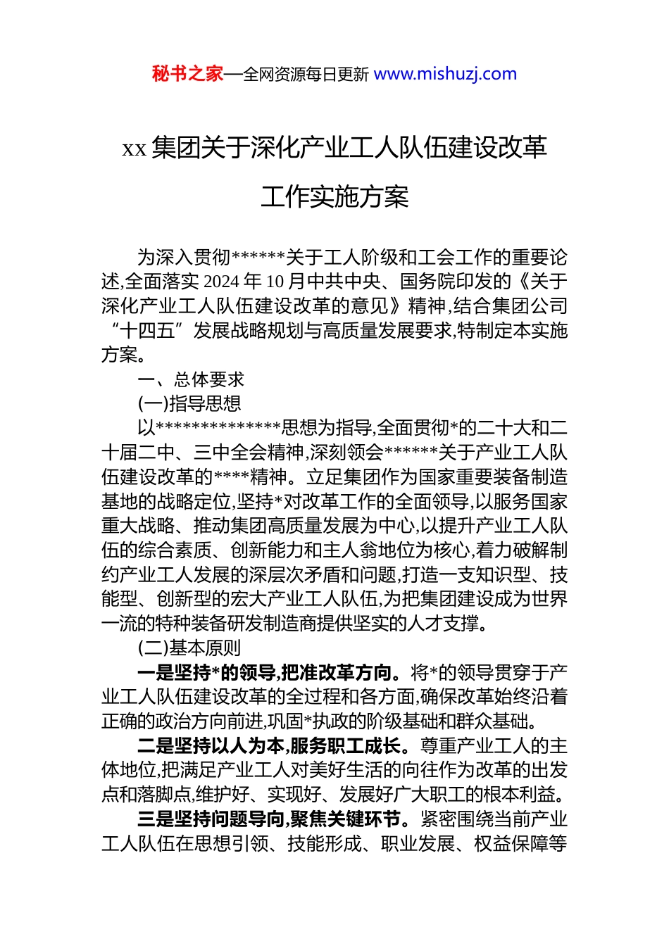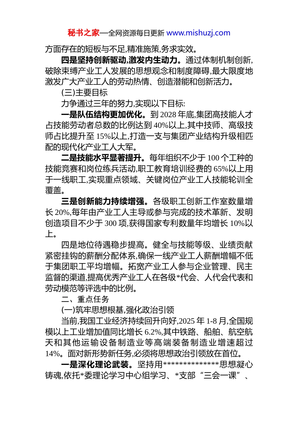 秘书之家—全网资源每日更新 www.mishuzj.comxx 集团关于深化产业工人队伍建设改革工作实施方案为深入贯彻******关于工人阶级和工会工作的重要论述,全面落实 2024 年 10 月中共中央、国务院印发的《关于深化产业工人队伍建设改革的意见》精神,结合集团公司“十四五”发展战略规划与高质量发展要求,特制定本实施方案。一、总体要求(一)指导思想以**************思想为指导,全面贯彻*的二十大和二十届二中、三中全会精神,深刻领会******关于产业工人队伍建设改革的****精神。立足集团作为国家重要装备制造基地的战略定位,坚持*对改革工作的全面领导,以服务国家重大战略、推动集团高质量发展为中心,以提升产业工人队伍的综合素质、创新能力和主人翁地位为核心,着力破解制约产业工人发展的深层次矛盾和问题,打造一支知识型、技能型、创新型的宏大产业工人队伍,为把集团建设成为世界一流的特种装备研发制造商提供坚实的人才支撑。(二)基本原则一是坚持*的领导,把准改革方向。将*的领导贯穿于产业工人队伍建设改革的全过程和各方面,确保改革始终沿着正确的政治方向前进,巩固*执政的阶级基础和群众基础。二是坚持以人为本,服务职工成长。尊重产业工人的主体地位,把满足产业工人对美好生活的向往作为改革的出发点和落脚点,维护好、实现好、发展好广大职工的根本利益。三是坚持问题导向,聚焦关键环节。紧密围绕当前产业工人队伍在思想引领、技能形成、职业发展、权益保障等秘书之家—全网资源每日更新 www.mishuzj.com方面存在的短板与不足,精准施策,务求实效。四是坚持创新驱动,激发内生动力。通过体制机制创新,破除束缚产业工人发展的思想观念和制度障碍,最大限度地激发广大产业工人的劳动热情、创造潜能和创新活力。(三)主要目标力争通过三年的努力,实现以下目标:一是队伍结构更加优化。到 2028 年底,集团高技能人才占技能劳动者总数的比例达到 40%以上,其中技师、高级技师占比提升至 15%以上,打造一支与集团产业结构升级相匹配的现代化产业工人大军。二是技能水平显著提升。每年组织不少于 100 个工种的技能竞赛和岗位练兵活动,职工教育培训经费的 65%以上用于一线职工,实现重点领域、关键岗位产业工人技能轮训全覆盖。三是创新能力持续增强。各级职工创新工作室数量增长 20%,每年由产业工人主导或参与完成的技术革新、发明创造项目不少于 300 项,获得国家专利数量年均增长 10%以上。四是地位待遇稳步提高。健全与技能等级、业绩贡献紧密挂钩的薪酬分配体系,确保一线产业工人薪酬增幅不低于集团职工平均增幅。拓宽产业工人参与企业管理、民主监督的渠道,提高优秀产业工人在各级*代会、人代会代表和劳动模范等评选中的比例。二、重点任务(一)筑牢思想根基,强化政治引领当前,我国工业经济持续回升向好,2025 年 1-8 月,全国规模以上工业增加值同比增长 6.2%,其中铁路、船舶、航空航天和其他运输设备制造业等高端装备制造业增速超过14%。面对新形势新任务,必须将思想政治引领放在首位。一是深化理论武装。坚持用**************思想凝心铸魂,依托*委理论学习中心组学习、*支部“三会一课”、秘书之家—全网资源每日更新 www.mishuzj.com班组“微*课”等形式,推动*的创新理论进车间、进班组、进头脑。将学习贯彻《关于深化产业工人队伍建设改革的意见》作为当前和今后一个时期的重要政治任务,引导广大产业工人深刻认识自身肩负的时代重任。二是弘扬三种精神。深入开展以劳模精神、劳动精神、工匠精神为核心的宣传教育活动。以庆祝中华全国总工会成立 100 周年为契机,持续办好“劳模工匠大讲堂”,组织开展职工主题征文、书画摄影展等活动。依托 xx 红色教育基地、xx 先驱事迹展馆等内部资源,深入挖掘和传承“把一切献给*”的人民兵工精神,增强产业工人服务国防、矢志报国的使命感和荣誉感。三是创新宣传载体。充分利用集团内外部宣传平台,在集团主干道、生产厂区设立“工匠风采”宣传栏,编撰《xx精神宣传册》等系列读物。运营好集团官方网站、微信公众号等新媒体矩阵,通过短视频、人物专访、事迹报道等形式,全方位、立体化宣传劳模工匠和一线优秀职工的先进事迹,在...