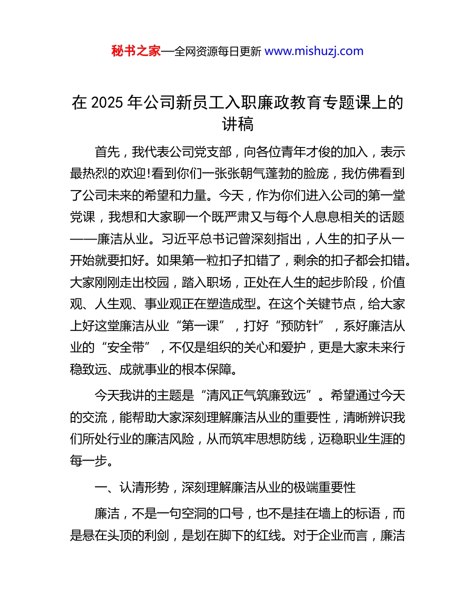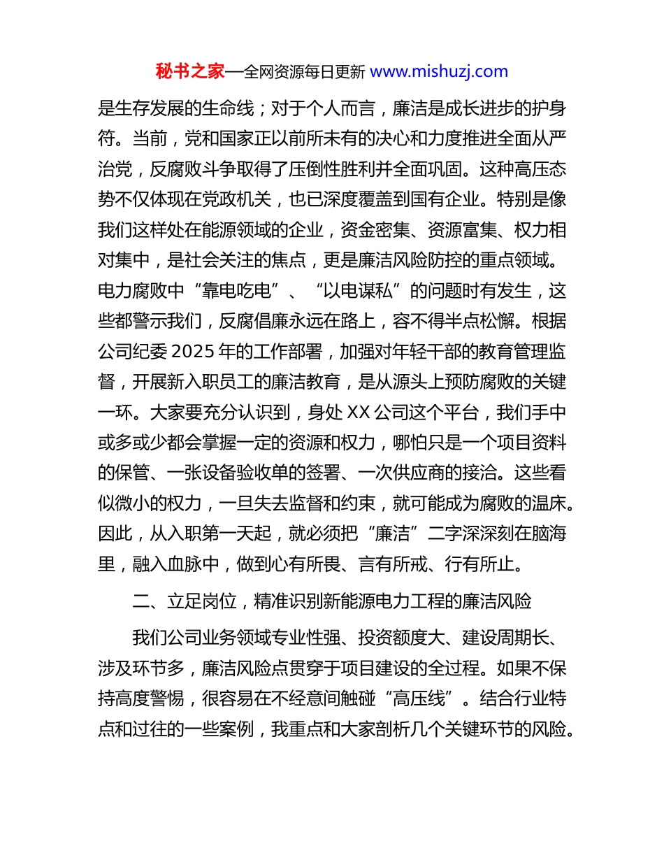 秘书之家—全网资源每日更新 www.mishuzj.com在 2025 年公司新员工入职廉政教育专题课上的讲稿首先,我代表公司党支部,向各位青年才俊的加入,表示最热烈的欢迎!看到你们一张张朝气蓬勃的脸庞,我仿佛看到了公司未来的希望和力量。今天,作为你们进入公司的第一堂党课,我想和大家聊一个既严肃又与每个人息息相关的话题——廉洁从业。习近平总书记曾深刻指出,人生的扣子从一开始就要扣好。如果第一粒扣子扣错了,剩余的扣子都会扣错。大家刚刚走出校园,踏入职场,正处在人生的起步阶段,价值观、人生观、事业观正在塑造成型。在这个关键节点,给大家上好这堂廉洁从业“第一课”,打好“预防针”,系好廉洁从业的“安全带”,不仅是组织的关心和爱护,更是大家未来行稳致远、成就事业的根本保障。今天我讲的主题是“清风正气筑廉致远”。希望通过今天的交流,能帮助大家深刻理解廉洁从业的重要性,清晰辨识我们所处行业的廉洁风险,从而筑牢思想防线,迈稳职业生涯的每一步。一、认清形势,深刻理解廉洁从业的极端重要性廉洁,不是一句空洞的口号,也不是挂在墙上的标语,而是悬在头顶的利剑,是划在脚下的红线。对于企业而言,廉洁秘书之家—全网资源每日更新 www.mishuzj.com是生存发展的生命线;对于个人而言,廉洁是成长进步的护身符。当前,党和国家正以前所未有的决心和力度推进全面从严治党,反腐败斗争取得了压倒性胜利并全面巩固。这种高压态势不仅体现在党政机关,也已深度覆盖到国有企业。特别是像我们这样处在能源领域的企业,资金密集、资源富集、权力相对集中,是社会关注的焦点,更是廉洁风险防控的重点领域。电力腐败中“靠电吃电”、“以电谋私”的问题时有发生,这些都警示我们,反腐倡廉永远在路上,容不得半点松懈。根据公司纪委 2025 年的工作部署,加强对年轻干部的教育管理监督,开展新入职员工的廉洁教育,是从源头上预防腐败的关键一环。大家要充分认识到,身处 XX 公司这个平台,我们手中或多或少都会掌握一定的资源和权力,哪怕只是一个项目资料的保管、一张设备验收单的签署、一次供应商的接洽。这些看似微小的权力,一旦失去监督和约束,就可能成为腐败的温床。因此,从入职第一天起,就必须把“廉洁”二字深深刻在脑海里,融入血脉中,做到心有所畏、言有所戒、行有所止。二、立足岗位,精准识别新能源电力工程的廉洁风险我们公司业务领域专业性强、投资额度大、建设周期长、涉及环节多,廉洁风险点贯穿于项目建设的全过程。如果不保持高度警惕,很容易在不经意间触碰“高压线”。结合行业特点和过往的一些案例,我重点和大家剖析几个关键环节的风险。秘书之家—全网资源每日更新 www.mishuzj.com第一个风险点,工程招投标环节。这是工程建设的“总阀门”,也是利益输送的高发地带。比如,在招标文件中设置倾向性条款,为特定投标人“量身定做”;或者在开标前泄露标底、投标人信息,与投标人串通投标,内外勾结,骗取中标。这些行为不仅严重破坏了公平竞争的市场秩序,也为工程质量和安全埋下了巨大隐患。第二个风险点,物资设备采购环节。一个风电项目或者变电站工程,涉及大量的设备、材料采购,小到一颗螺丝钉,大到风机、变压器,金额动辄数以万计、百万计。这个环节的风险在于,一些供应商为了中标,可能会采取“糖衣炮弹”的攻击,比如赠送礼品礼金、安排高消费娱乐活动、许诺给予回扣等。如果思想防线不牢,就可能被眼前的蝇头小利所迷惑,利用职权为不合格的供应商或质次价高的产品“开绿灯”,最终损害的是公司的利益。第三个风险点,工程建设与验收环节。这是项目执行的核心阶段,也是廉洁风险最集中、最隐蔽的环节。这里我想给大家讲一个系统内发生的真实案例。某供电公司的项目管理员王某,负责一个变电站的新建工程。在项目实施过程中,他与施工方老板称兄道弟,关系十分“融洽”。施工方为了和他搞好关系,不仅时常请他吃饭喝酒,还在逢年过节送上厚礼。一来二去,王某便放松了警惕,把手中的权力当成了寻租的工具。他利用自己负责现场管理和工程量确认的便利,与施工方合谋,秘书之家—全网资源每日更新 www.mishuzj.co...