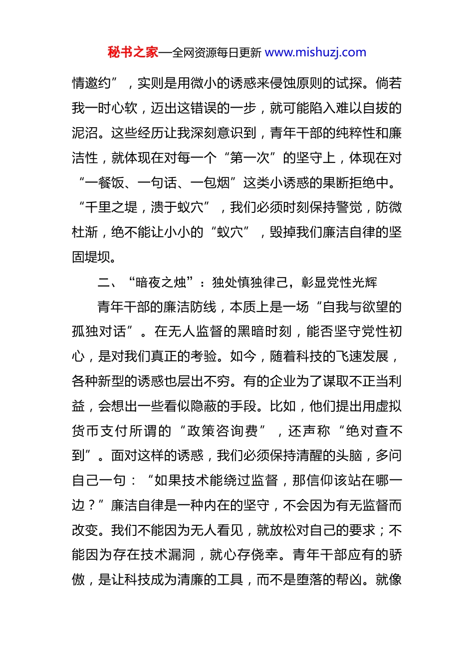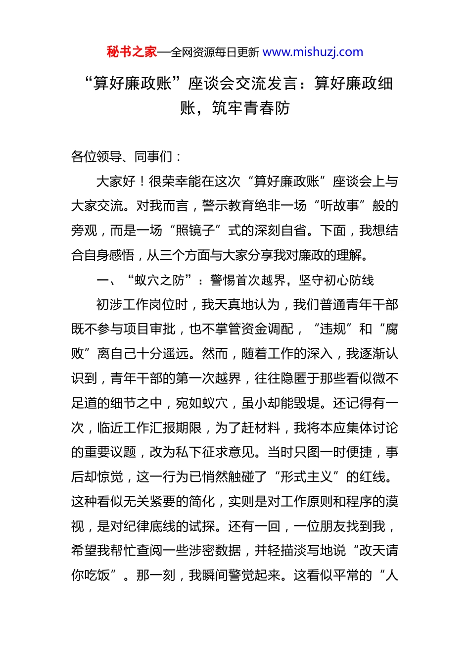 秘书之家—全网资源每日更新 www.mishuzj.com“算好廉政账”座谈会交流发言:算好廉政细账,筑牢青春防 各位领导、同事们:大家好!很荣幸能在这次“算好廉政账”座谈会上与大家交流。对我而言,警示教育绝非一场“听故事”般的旁观,而是一场“照镜子”式的深刻自省。下面,我想结合自身感悟,从三个方面与大家分享我对廉政的理解。一、“蚁穴之防”:警惕首次越界,坚守初心防线初涉工作岗位时,我天真地认为,我们普通青年干部既不参与项目审批,也不掌管资金调配,“违规”和“腐败”离自己十分遥远。然而,随着工作的深入,我逐渐认识到,青年干部的第一次越界,往往隐匿于那些看似微不足道的细节之中,宛如蚁穴,虽小却能毁堤。还记得有一次,临近工作汇报期限,为了赶材料,我将本应集体讨论的重要议题,改为私下征求意见。当时只图一时便捷,事后却惊觉,这一行为已悄然触碰了“形式主义”的红线。这种看似无关紧要的简化,实则是对工作原则和程序的漠视,是对纪律底线的试探。还有一回,一位朋友找到我,希望我帮忙查阅一些涉密数据,并轻描淡写地说“改天请你吃饭”。那一刻,我瞬间警觉起来。这看似平常的“人秘书之家—全网资源每日更新 www.mishuzj.com情邀约”,实则是用微小的诱惑来侵蚀原则的试探。倘若我一时心软,迈出这错误的一步,就可能陷入难以自拔的泥沼。这些经历让我深刻意识到,青年干部的纯粹性和廉洁性,就体现在对每一个“第一次”的坚守上,体现在对“一餐饭、一句话、一包烟”这类小诱惑的果断拒绝中。“千里之堤,溃于蚁穴”,我们必须时刻保持警觉,防微杜渐,绝不能让小小的“蚁穴”,毁掉我们廉洁自律的坚固堤坝。二、“暗夜之烛”:独处慎独律己,彰显党性光辉青年干部的廉洁防线,本质上是一场“自我与欲望的孤独对话”。在无人监督的黑暗时刻,能否坚守党性初心,是对我们真正的考验。如今,随着科技的飞速发展,各种新型的诱惑也层出不穷。有的企业为了谋取不正当利益,会想出一些看似隐蔽的手段。比如,他们提出用虚拟货币支付所谓的“政策咨询费”,还声称“绝对查不到”。面对这样的诱惑,我们必须保持清醒的头脑,多问自己一句:“如果技术能绕过监督,那信仰该站在哪一边?”廉洁自律是一种内在的坚守,不会因为有无监督而改变。我们不能因为无人看见,就放松对自己的要求;不能因为存在技术漏洞,就心存侥幸。青年干部应有的骄傲,是让科技成为清廉的工具,而不是堕落的帮凶。就像秘书之家—全网资源每日更新 www.mishuzj.com在黑暗中点亮一支蜡烛,即使无人注视,也要散发着光明和温暖。我们要在无人监督的暗夜中,坚守党性原则,用信仰之光照亮前行的道路。三、“松柏之养”:内化廉洁意识,铸就忠诚品格通过这段时间的学习和反思,我逐渐从“被动遵守”廉洁规定,转变为“主动构建”自身的廉政防线。首先是认知升维。我不再把廉洁规定仅仅看作是一条条“禁令清单”,而是将其视为青年干部的政治生存指南。这些规定是我们在复杂的工作环境中保持正确方向的灯塔,是我们实现自身价值的保障。只有深刻理解并认同这些规定,我们才能真正做到心有所畏、言有所戒、行有所止。其次是习惯重构。我在手机里设置了“廉政闹钟”,每周五都会提醒自己回顾本周的工作,检查是否有处于“模糊地带”的操作。这种定期的自我审视,让我能够及时发现问题、纠正错误,避免小错酿成大错。同时,它也帮助我养成了廉洁自律的良好习惯,使廉洁意识深入人心。最后是价值扎根。我在笔记本的扉页上写下了李大钊先生的名言:“黄金时代不在过去,乃在将来。”这句话时刻提醒着我,青年干部肩负着党和国家的未来,我们今日坚守的每一个“第一次”,都是在为实现“强国有我”的庄严承诺积蓄力量。我们要把廉洁自律融入血脉,铸就秘书之家—全网资源每日更新 www.mishuzj.com忠诚干净担当的品格,成为党和人民可靠的接班人。“蚁穴之防”让我们防患于未然,“暗夜之烛”使我们慎独律己,“松柏之养”助我们内化品格。作为新时代的青年干部,我们要算好廉政细账,筑牢青春防线,以廉洁自律的实际行动,书写无愧于时代、无愧于人民的精彩篇章!谢谢大家!