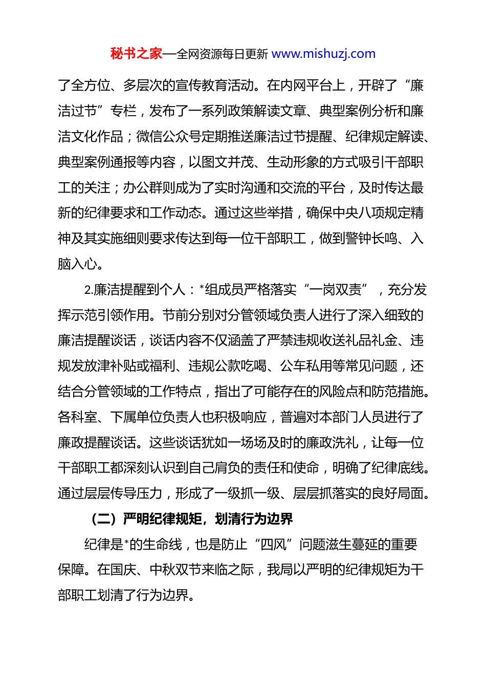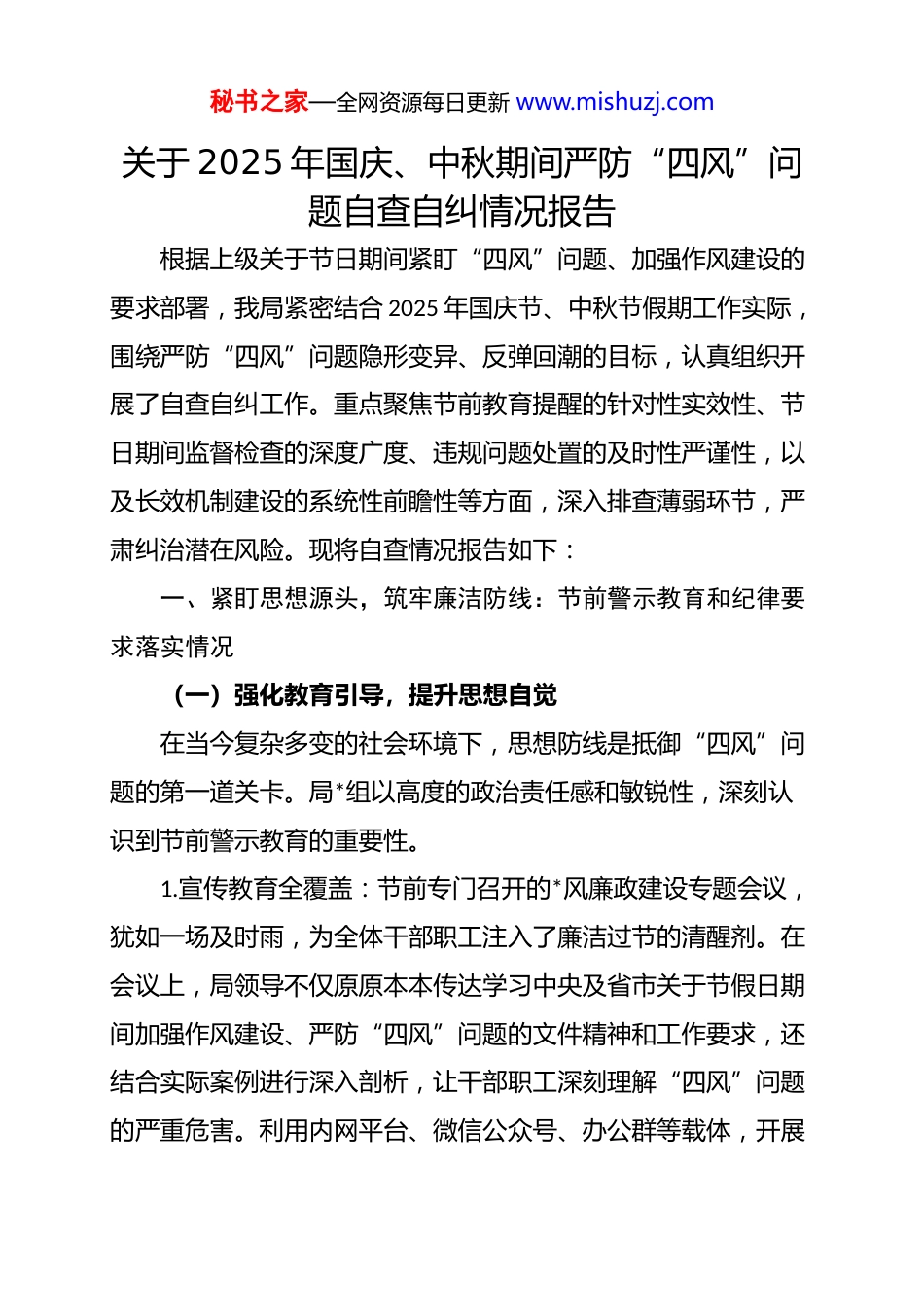 秘书之家—全网资源每日更新 www.mishuzj.com关于 2025 年国庆、中秋期间严防“四风”问题自查自纠情况报告根据上级关于节日期间紧盯“四风”问题、加强作风建设的要求部署,我局紧密结合 2025 年国庆节、中秋节假期工作实际,围绕严防“四风”问题隐形变异、反弹回潮的目标,认真组织开展了自查自纠工作。重点聚焦节前教育提醒的针对性实效性、节日期间监督检查的深度广度、违规问题处置的及时性严谨性,以及长效机制建设的系统性前瞻性等方面,深入排查薄弱环节,严肃纠治潜在风险。现将自查情况报告如下:一、紧盯思想源头,筑牢廉洁防线:节前警示教育和纪律要求落实情况(一)强化教育引导,提升思想自觉在当今复杂多变的社会环境下,思想防线是抵御“四风”问题的第一道关卡。局*组以高度的政治责任感和敏锐性,深刻认识到节前警示教育的重要性。1.宣传教育全覆盖:节前专门召开的*风廉政建设专题会议,犹如一场及时雨,为全体干部职工注入了廉洁过节的清醒剂。在会议上,局领导不仅原原本本传达学习中央及省市关于节假日期间加强作风建设、严防“四风”问题的文件精神和工作要求,还结合实际案例进行深入剖析,让干部职工深刻理解“四风”问题的严重危害。利用内网平台、微信公众号、办公群等载体,开展秘书之家—全网资源每日更新 www.mishuzj.com了全方位、多层次的宣传教育活动。在内网平台上,开辟了“廉洁过节”专栏,发布了一系列政策解读文章、典型案例分析和廉洁文化作品;微信公众号定期推送廉洁过节提醒、纪律规定解读、典型案例通报等内容,以图文并茂、生动形象的方式吸引干部职工的关注;办公群则成为了实时沟通和交流的平台,及时传达最新的纪律要求和工作动态。通过这些举措,确保中央八项规定精神及其实施细则要求传达到每一位干部职工,做到警钟长鸣、入脑入心。2.廉洁提醒到个人:*组成员严格落实“一岗双责”,充分发挥示范引领作用。节前分别对分管领域负责人进行了深入细致的廉洁提醒谈话,谈话内容不仅涵盖了严禁违规收送礼品礼金、违规发放津补贴或福利、违规公款吃喝、公车私用等常见问题,还结合分管领域的工作特点,指出了可能存在的风险点和防范措施。各科室、下属单位负责人也积极响应,普遍对本部门人员进行了廉政提醒谈话。这些谈话犹如一场场及时的廉政洗礼,让每一位干部职工都深刻认识到自己肩负的责任和使命,明确了纪律底线。通过层层传导压力,形成了一级抓一级、层层抓落实的良好局面。(二)严明纪律规矩,划清行为边界纪律是*的生命线,也是防止“四风”问题滋生蔓延的重要保障。在国庆、中秋双节来临之际,我局以严明的纪律规矩为干部职工划清了行为边界。秘书之家—全网资源每日更新 www.mishuzj.com1.禁令重申明底线:下发的《关于严明 2025 年国庆、中秋期间有关纪律要求的通知》,犹如一把高悬的利剑,时刻警示着干部职工要严守纪律底线。通知明确提出“十个严禁”要求,这些要求紧密结合节日特点和实际工作情况,具有很强的针对性和可操作性。严禁违反疫情防控常态化措施组织或参与聚集性活动(如违规操办婚丧喜庆),体现了我局对疫情防控工作的高度重视;严禁违规接受管理服务对象安排的宴请或旅游活动、严禁在隐秘场所违规吃喝或“吃公函”“吃食堂”等,进一步细化了纪律要求,防止干部职工在不知不觉中触碰纪律红线。通过重申这些禁令,让干部职工清楚地知道哪些行为是坚决不允许的,为他们的行为提供了明确的指引。2.风险排查无死角:结合节日特点,我局对财务报销、公务接待、公车管理、食堂采购等关键环节进行了全面深入的风险排查。在财务报销方面,重点检查了报销凭证的真实性、合法性和合理性,防止出现虚报冒领、违规报销等问题;在公务接待方面,严格审查接待标准、接待范围和接待审批程序,确保公务接待规范有序;在公车管理方面,对公车的使用情况进行了详细检查,包括公车的行驶轨迹、使用时间、加油记录等,防止公车私用现象的发生;在食堂采购方面,加强了对采购流程、采购价格和采购质量的监督管理,防止出现采购腐败问题。通过对这些关键环节的风险排查,针对性地完善了审批流程和监管措施,有...