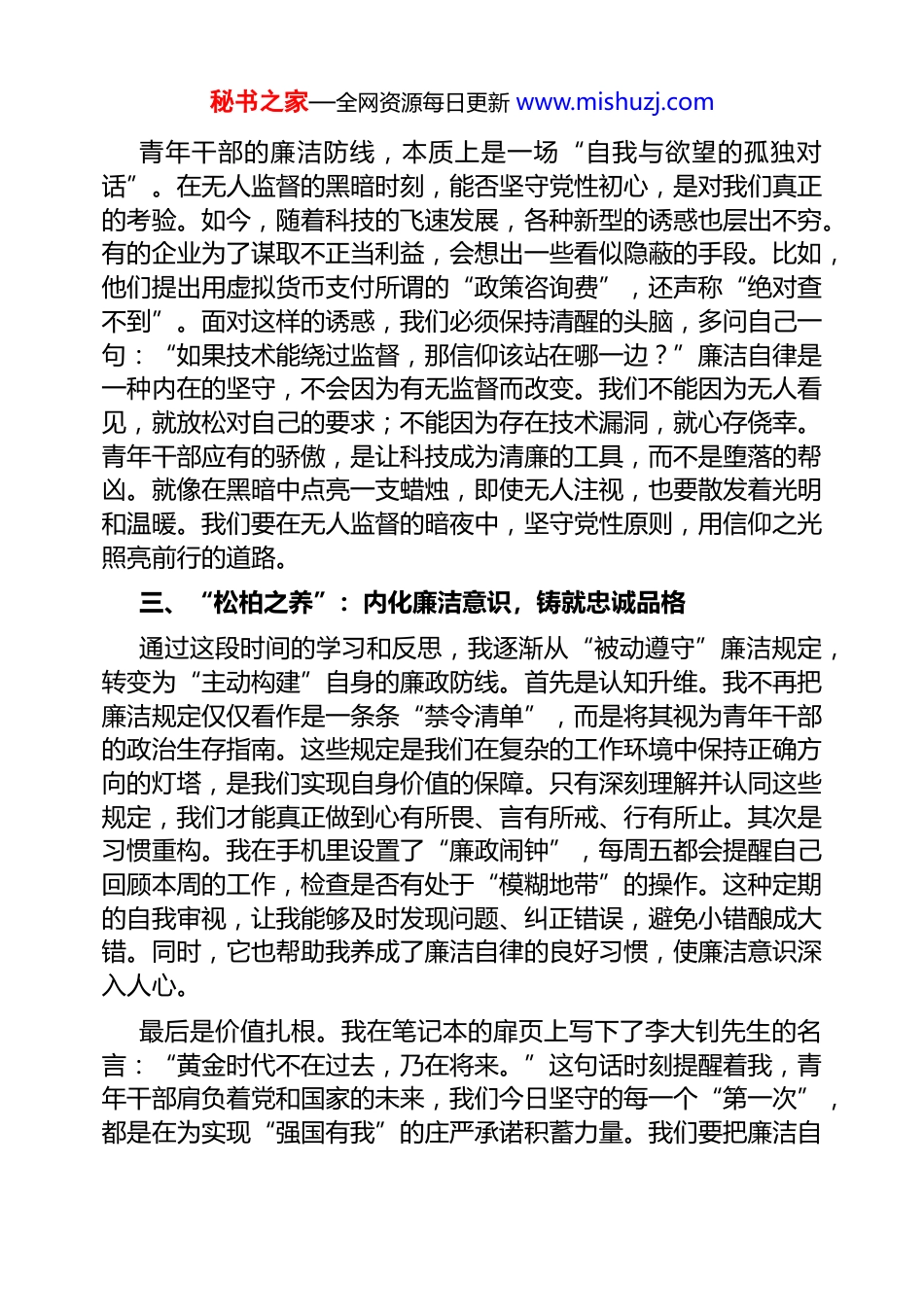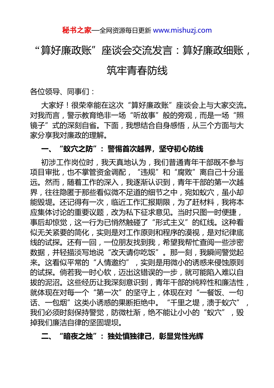 秘书之家—全网资源每日更新 www.mishuzj.com“算好廉政账”座谈会交流发言:算好廉政细账,筑牢青春防线各位领导、同事们:大家好!很荣幸能在这次“算好廉政账”座谈会上与大家交流。对我而言,警示教育绝非一场“听故事”般的旁观,而是一场“照镜子”式的深刻自省。下面,我想结合自身感悟,从三个方面与大家分享我对廉政的理解。一、“蚁穴之防”:警惕首次越界,坚守初心防线初涉工作岗位时,我天真地认为,我们普通青年干部既不参与项目审批,也不掌管资金调配,“违规”和“腐败”离自己十分遥远。然而,随着工作的深入,我逐渐认识到,青年干部的第一次越界,往往隐匿于那些看似微不足道的细节之中,宛如蚁穴,虽小却能毁堤。还记得有一次,临近工作汇报期限,为了赶材料,我将本应集体讨论的重要议题,改为私下征求意见。当时只图一时便捷,事后却惊觉,这一行为已悄然触碰了“形式主义”的红线。这种看似无关紧要的简化,实则是对工作原则和程序的漠视,是对纪律底线的试探。还有一回,一位朋友找到我,希望我帮忙查阅一些涉密数据,并轻描淡写地说“改天请你吃饭”。那一刻,我瞬间警觉起来。这看似平常的“人情邀约”,实则是用微小的诱惑来侵蚀原则的试探。倘若我一时心软,迈出这错误的一步,就可能陷入难以自拔的泥沼。这些经历让我深刻意识到,青年干部的纯粹性和廉洁性,就体现在对每一个“第一次”的坚守上,体现在对“一餐饭、一句话、一包烟”这类小诱惑的果断拒绝中。“千里之堤,溃于蚁穴”,我们必须时刻保持警觉,防微杜渐,绝不能让小小的“蚁穴”,毁掉我们廉洁自律的坚固堤坝。二、“暗夜之烛”:独处慎独律己,彰显党性光辉秘书之家—全网资源每日更新 www.mishuzj.com青年干部的廉洁防线,本质上是一场“自我与欲望的孤独对话”。在无人监督的黑暗时刻,能否坚守党性初心,是对我们真正的考验。如今,随着科技的飞速发展,各种新型的诱惑也层出不穷。有的企业为了谋取不正当利益,会想出一些看似隐蔽的手段。比如,他们提出用虚拟货币支付所谓的“政策咨询费”,还声称“绝对查不到”。面对这样的诱惑,我们必须保持清醒的头脑,多问自己一句:“如果技术能绕过监督,那信仰该站在哪一边?”廉洁自律是一种内在的坚守,不会因为有无监督而改变。我们不能因为无人看见,就放松对自己的要求;不能因为存在技术漏洞,就心存侥幸。青年干部应有的骄傲,是让科技成为清廉的工具,而不是堕落的帮凶。就像在黑暗中点亮一支蜡烛,即使无人注视,也要散发着光明和温暖。我们要在无人监督的暗夜中,坚守党性原则,用信仰之光照亮前行的道路。三、“松柏之养”:内化廉洁意识,铸就忠诚品格通过这段时间的学习和反思,我逐渐从“被动遵守”廉洁规定,转变为“主动构建”自身的廉政防线。首先是认知升维。我不再把廉洁规定仅仅看作是一条条“禁令清单”,而是将其视为青年干部的政治生存指南。这些规定是我们在复杂的工作环境中保持正确方向的灯塔,是我们实现自身价值的保障。只有深刻理解并认同这些规定,我们才能真正做到心有所畏、言有所戒、行有所止。其次是习惯重构。我在手机里设置了“廉政闹钟”,每周五都会提醒自己回顾本周的工作,检查是否有处于“模糊地带”的操作。这种定期的自我审视,让我能够及时发现问题、纠正错误,避免小错酿成大错。同时,它也帮助我养成了廉洁自律的良好习惯,使廉洁意识深入人心。最后是价值扎根。我在笔记本的扉页上写下了李大钊先生的名言:“黄金时代不在过去,乃在将来。”这句话时刻提醒着我,青年干部肩负着党和国家的未来,我们今日坚守的每一个“第一次”,都是在为实现“强国有我”的庄严承诺积蓄力量。我们要把廉洁自秘书之家—全网资源每日更新 www.mishuzj.com律融入血脉,铸就忠诚干净担当的品格,成为党和人民可靠的接班人。“蚁穴之防”让我们防患于未然,“暗夜之烛”使我们慎独律己,“松柏之养”助我们内化品格。作为新时代的青年干部,我们要算好廉政细账,筑牢青春防线,以廉洁自律的实际行动,书写无愧于时代、无愧于人民的精彩篇章!谢谢大家!