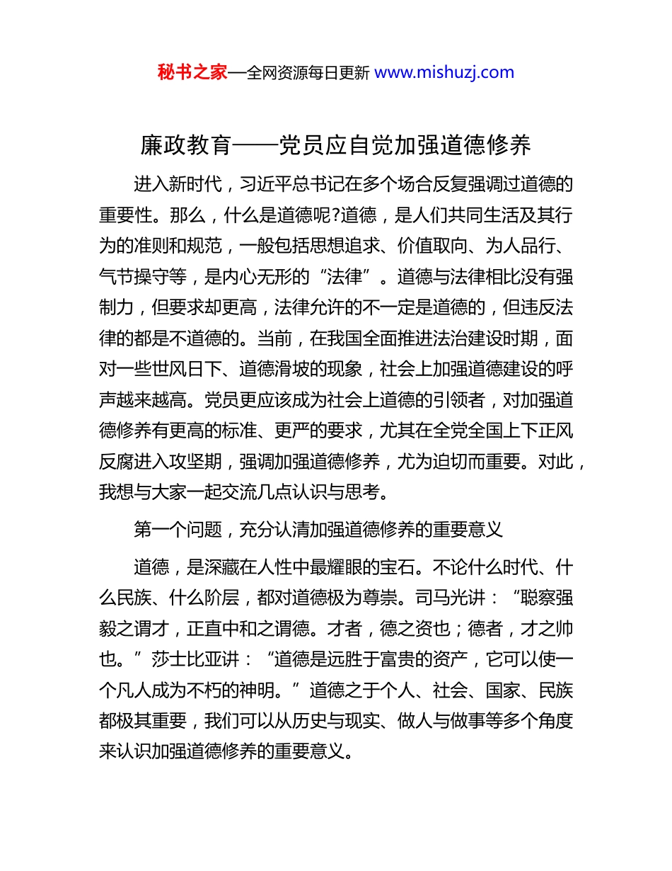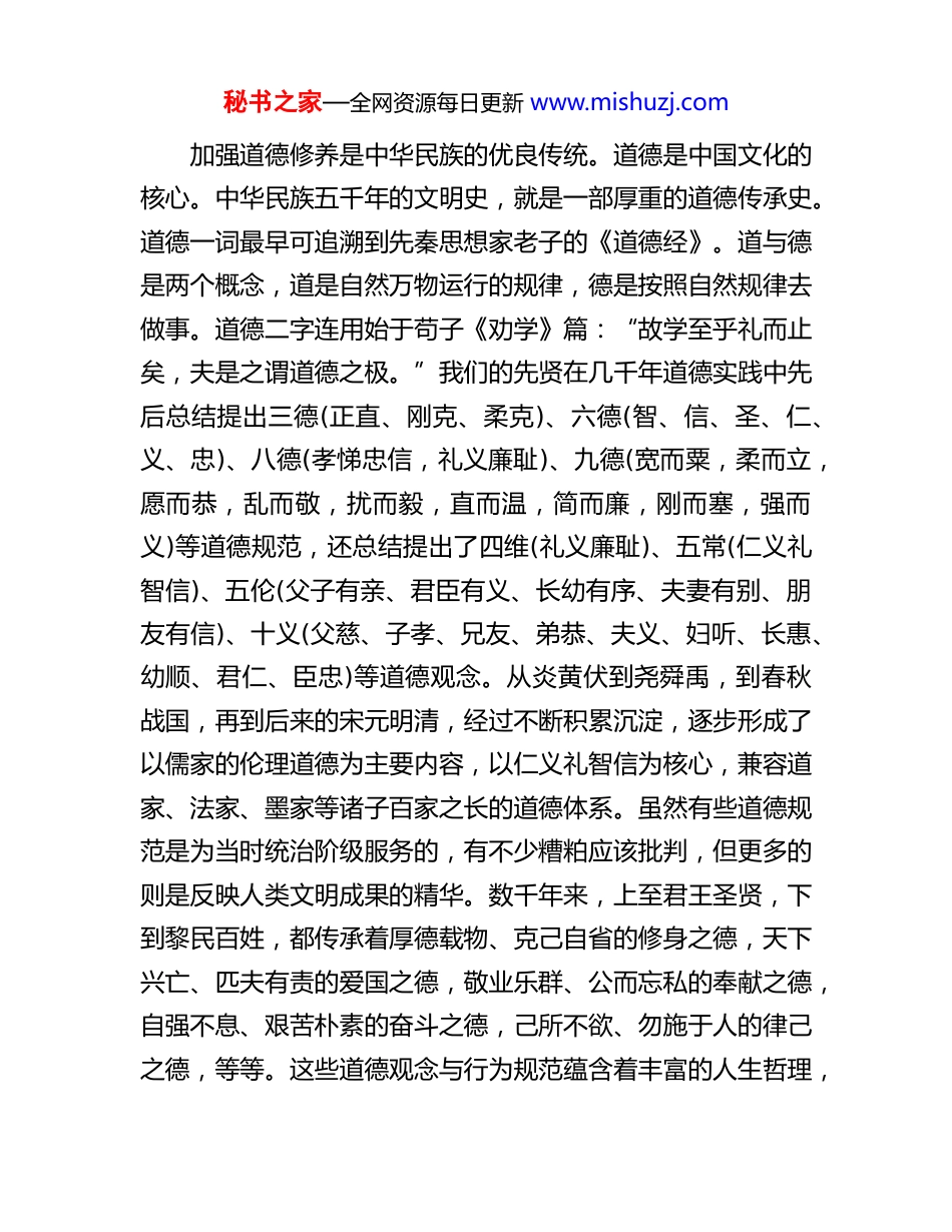 秘书之家—全网资源每日更新 www.mishuzj.com廉政教育——党员应自觉加强道德修养进入新时代,习近平总书记在多个场合反复强调过道德的重要性。那么,什么是道德呢?道德,是人们共同生活及其行为的准则和规范,一般包括思想追求、价值取向、为人品行、气节操守等,是内心无形的“法律”。道德与法律相比没有强制力,但要求却更高,法律允许的不一定是道德的,但违反法律的都是不道德的。当前,在我国全面推进法治建设时期,面对一些世风日下、道德滑坡的现象,社会上加强道德建设的呼声越来越高。党员更应该成为社会上道德的引领者,对加强道德修养有更高的标准、更严的要求,尤其在全党全国上下正风反腐进入攻坚期,强调加强道德修养,尤为迫切而重要。对此,我想与大家一起交流几点认识与思考。第一个问题,充分认清加强道德修养的重要意义道德,是深藏在人性中最耀眼的宝石。不论什么时代、什么民族、什么阶层,都对道德极为尊崇。司马光讲:“聪察强毅之谓才,正直中和之谓德。才者,德之资也;德者,才之帅也。”莎士比亚讲:“道德是远胜于富贵的资产,它可以使一个凡人成为不朽的神明。”道德之于个人、社会、国家、民族都极其重要,我们可以从历史与现实、做人与做事等多个角度来认识加强道德修养的重要意义。秘书之家—全网资源每日更新 www.mishuzj.com加强道德修养是中华民族的优良传统。道德是中国文化的核心。中华民族五千年的文明史,就是一部厚重的道德传承史。道德一词最早可追溯到先秦思想家老子的《道德经》。道与德是两个概念,道是自然万物运行的规律,德是按照自然规律去做事。道德二字连用始于苟子《劝学》篇:“故学至乎礼而止矣,夫是之谓道德之极。”我们的先贤在几千年道德实践中先后总结提出三德(正直、刚克、柔克)、六德(智、信、圣、仁、义、忠)、八德(孝悌忠信,礼义廉耻)、九德(宽而粟,柔而立,愿而恭,乱而敬,扰而毅,直而温,简而廉,刚而塞,强而义)等道德规范,还总结提出了四维(礼义廉耻)、五常(仁义礼智信)、五伦(父子有亲、君臣有义、长幼有序、夫妻有别、朋友有信)、十义(父慈、子孝、兄友、弟恭、夫义、妇听、长惠、幼顺、君仁、臣忠)等道德观念。从炎黄伏到尧舜禹,到春秋战国,再到后来的宋元明清,经过不断积累沉淀,逐步形成了以儒家的伦理道德为主要内容,以仁义礼智信为核心,兼容道家、法家、墨家等诸子百家之长的道德体系。虽然有些道德规范是为当时统治阶级服务的,有不少糟粕应该批判,但更多的则是反映人类文明成果的精华。数千年来,上至君王圣贤,下到黎民百姓,都传承着厚德载物、克己自省的修身之德,天下兴亡、匹夫有责的爱国之德,敬业乐群、公而忘私的奉献之德,自强不息、艰苦朴素的奋斗之德,己所不欲、勿施于人的律己之德,等等。这些道德观念与行为规范蕴含着丰富的人生哲理,秘书之家—全网资源每日更新 www.mishuzj.com体现对真善美的共同呼唤和追求,虽历尽千秋仍不衰,世世代代影响着人们的思想和行为,成为中华民族自强不息的精神力量。中国共产党诞生后,不论是在革命年代还是和平建设时期,都继承和发扬中华民族的传统美德,并随着时代的发展丰富形成了以“全心全意为人民服务”为核心的共产党人道德观。从“五讲四美”“四有新人”,到“八荣八耻”,再到“社会主义核心价值观”,可以说中华民族传统美德的基因一直流淌在我们的血液里,并注入了新的时代内涵。我们有责任有义务把它传承好、发扬好,决不能让祖先的精神衣钵在我们手里淡漠遗失。加强道德修养是立身做人的根本前提。每个人都是社会上的人,遵守道德是个人立足于社会的根基,也是维系人与人交往关系的无形“契约”。刘备临终时留给儿子的遗训是“惟贤惟德,能服于人”,汉代科学家张衡把“德之不崇”视作人生最大的不幸,古希腊一位哲学家把美德比作人生的“第二个太阳”。德为人之帅,立人先立德,一个无德之人即使再有才能也会被历史所唾弃。春秋时期晋国大将智申,喜爱仪表堂堂、武功高强、能言善辩的儿子智瑶,而不喜欢仁心宅厚的儿子智宵,决定传位给智瑶。当时族人智果反对,认为智瑶“心狠”而“不仁”,能干而无德,道德品质不如...