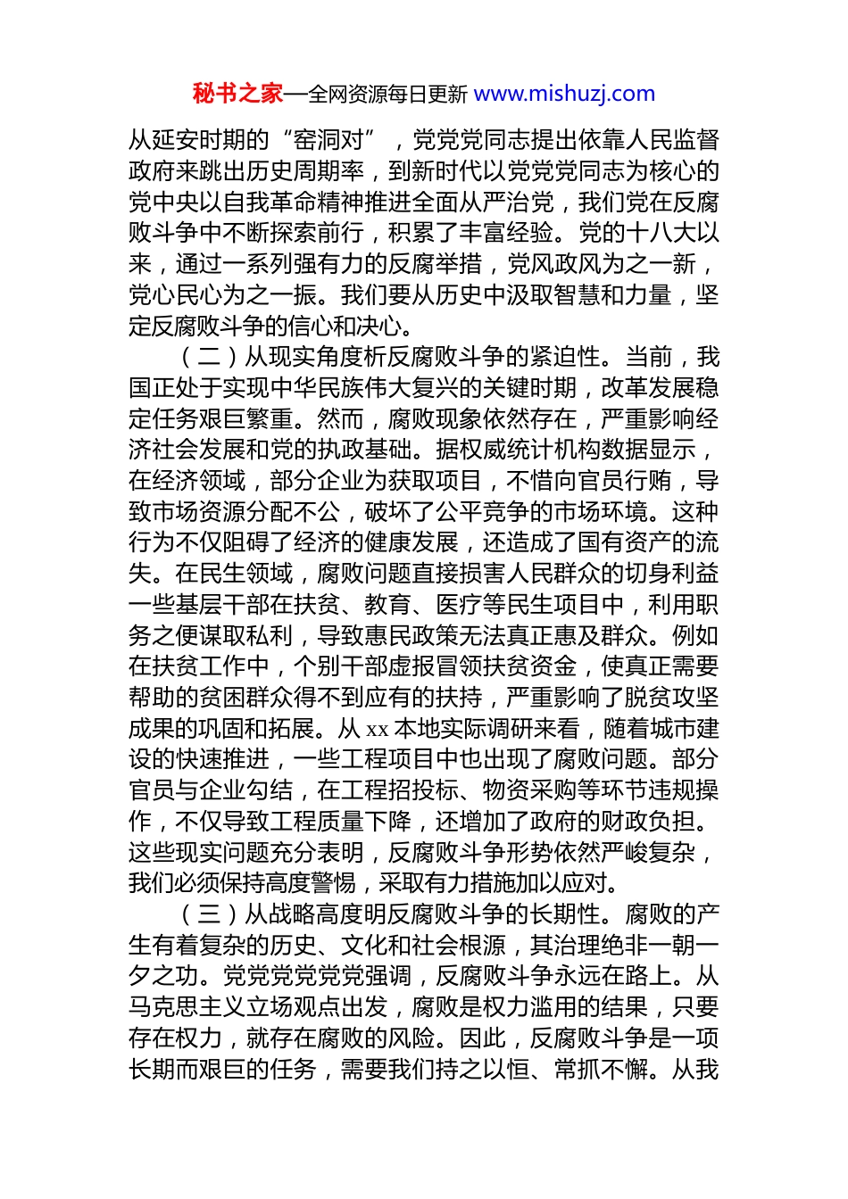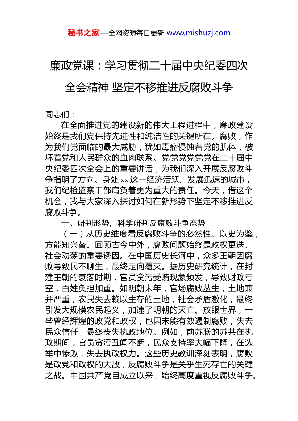 秘书之家—全网资源每日更新 www.mishuzj.com廉政党课:学习贯彻二十届中央纪委四次全会精神 坚定不移推进反腐败斗争同志们:在全面推进党的建设新的伟大工程进程中,廉政建设始终是我们党保持先进性和纯洁性的关键所在。腐败,作为我们党面临的最大威胁,犹如毒瘤侵蚀着党的肌体,破坏着党和人民群众的血肉联系。党党党党党党在二十届中央纪委四次全会上的重要讲话,为我们深入开展反腐败斗争指明了方向。身处 xx 这一经济活跃、发展迅速的城市,我们纪检监察干部肩负着更为重大的责任。今天,借这个机会,我与大家深入探讨如何在新形势下坚定不移推进反腐败斗争。一、研判形势,科学研判反腐败斗争态势(一)从历史维度看反腐败斗争的必然性。以史为鉴,方能知兴替。回顾古今中外,腐败问题始终是政权更迭、社会动荡的重要诱因。在中国历史长河中,众多王朝因腐败导致民不聊生,最终走向覆灭。据历史研究统计,在封建王朝的衰落时期,官员贪污受贿现象频发,导致财政亏空,百姓负担加重。如明朝末年,官场腐败丛生,土地兼并严重,农民失去赖以生存的土地,社会矛盾激化,最终引发大规模农民起义,加速了明朝的灭亡。放眼世界,一些曾经辉煌的政党和政权,也因未能有效遏制腐败,失去民众信任,最终丧失执政地位。例如,前苏联的苏共在执政期间,官员贪污丑闻不断,民众支持率大幅下降,在选举中惨败,失去执政权力。这些历史教训深刻表明,腐败是政党和政权的大敌,反腐败斗争是关乎生死存亡的关键之战。中国共产党自成立以来,始终高度重视反腐败斗争。秘书之家—全网资源每日更新 www.mishuzj.com从延安时期的“窑洞对”,党党党同志提出依靠人民监督政府来跳出历史周期率,到新时代以党党党同志为核心的党中央以自我革命精神推进全面从严治党,我们党在反腐败斗争中不断探索前行,积累了丰富经验。党的十八大以来,通过一系列强有力的反腐举措,党风政风为之一新,党心民心为之一振。我们要从历史中汲取智慧和力量,坚定反腐败斗争的信心和决心。(二)从现实角度析反腐败斗争的紧迫性。当前,我国正处于实现中华民族伟大复兴的关键时期,改革发展稳定任务艰巨繁重。然而,腐败现象依然存在,严重影响经济社会发展和党的执政基础。据权威统计机构数据显示,在经济领域,部分企业为获取项目,不惜向官员行贿,导致市场资源分配不公,破坏了公平竞争的市场环境。这种行为不仅阻碍了经济的健康发展,还造成了国有资产的流失。在民生领域,腐败问题直接损害人民群众的切身利益一些基层干部在扶贫、教育、医疗等民生项目中,利用职务之便谋取私利,导致惠民政策无法真正惠及群众。例如在扶贫工作中,个别干部虚报冒领扶贫资金,使真正需要帮助的贫困群众得不到应有的扶持,严重影响了脱贫攻坚成果的巩固和拓展。从 xx 本地实际调研来看,随着城市建设的快速推进,一些工程项目中也出现了腐败问题。部分官员与企业勾结,在工程招投标、物资采购等环节违规操作,不仅导致工程质量下降,还增加了政府的财政负担。这些现实问题充分表明,反腐败斗争形势依然严峻复杂,我们必须保持高度警惕,采取有力措施加以应对。(三)从战略高度明反腐败斗争的长期性。腐败的产生有着复杂的历史、文化和社会根源,其治理绝非一朝一夕之功。党党党党党党强调,反腐败斗争永远在路上。从马克思主义立场观点出发,腐败是权力滥用的结果,只要存在权力,就存在腐败的风险。因此,反腐败斗争是一项长期而艰巨的任务,需要我们持之以恒、常抓不懈。从我秘书之家—全网资源每日更新 www.mishuzj.com国的反腐败实践来看,虽然取得了显著成效,但腐败存量尚未完全清除,增量仍时有发生。一些腐败分子在高压态势下,依然心存侥幸,变换手法进行腐败活动。如一些官员通过“影子公司”“期权腐败”等新型腐败方式,试图逃避法律制裁。这些新情况、新问题表明,反腐败斗争的复杂性和艰巨性。我们要树立长期作战的思想,克服急躁情绪和短期行为。不能因为取得了阶段性成果就沾沾自喜放松警惕,也不能因为面临困难和挑战就畏缩不前、半途而废。要以坚如磐石的决心和毅力,持续推进反腐败斗争不断巩固和拓...