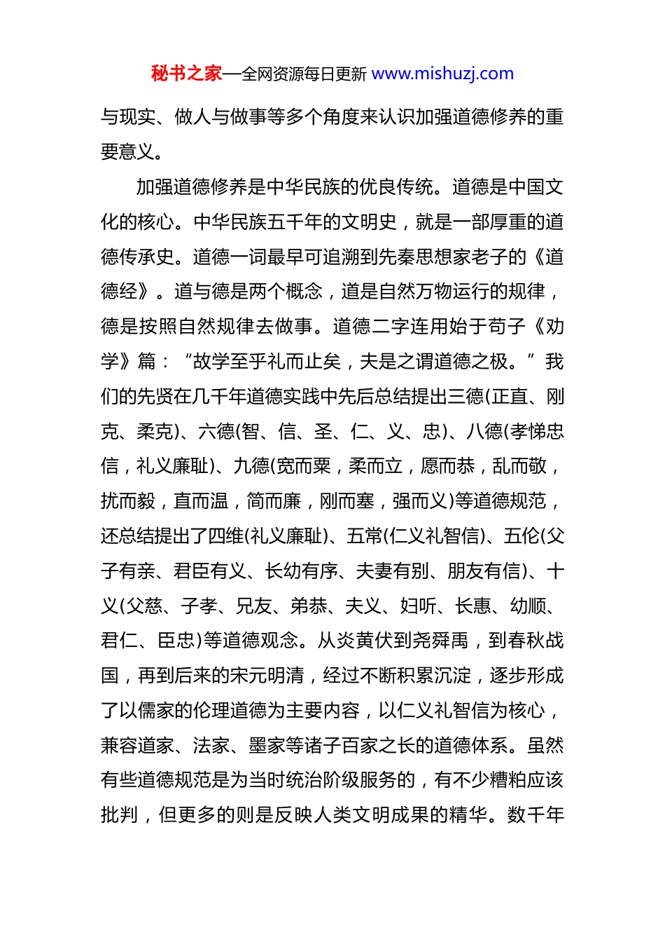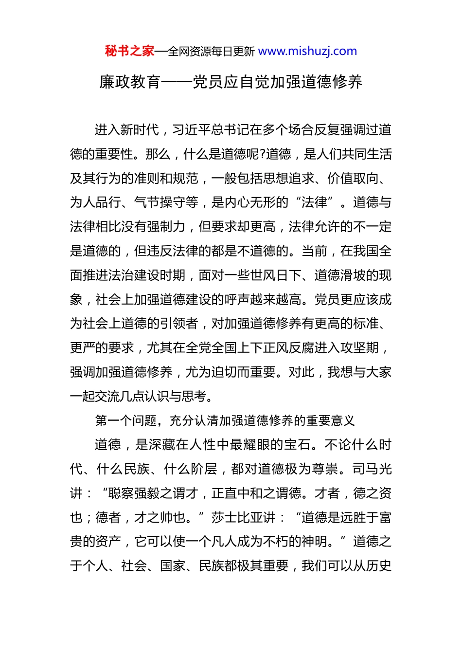 秘书之家—全网资源每日更新 www.mishuzj.com廉政教育——党员应自觉加强道德修养 进入新时代,习近平总书记在多个场合反复强调过道德的重要性。那么,什么是道德呢?道德,是人们共同生活及其行为的准则和规范,一般包括思想追求、价值取向、为人品行、气节操守等,是内心无形的“法律”。道德与法律相比没有强制力,但要求却更高,法律允许的不一定是道德的,但违反法律的都是不道德的。当前,在我国全面推进法治建设时期,面对一些世风日下、道德滑坡的现象,社会上加强道德建设的呼声越来越高。党员更应该成为社会上道德的引领者,对加强道德修养有更高的标准、更严的要求,尤其在全党全国上下正风反腐进入攻坚期,强调加强道德修养,尤为迫切而重要。对此,我想与大家一起交流几点认识与思考。第一个问题,充分认清加强道德修养的重要意义道德,是深藏在人性中最耀眼的宝石。不论什么时代、什么民族、什么阶层,都对道德极为尊崇。司马光讲:“聪察强毅之谓才,正直中和之谓德。才者,德之资也;德者,才之帅也。”莎士比亚讲:“道德是远胜于富贵的资产,它可以使一个凡人成为不朽的神明。”道德之于个人、社会、国家、民族都极其重要,我们可以从历史秘书之家—全网资源每日更新 www.mishuzj.com与现实、做人与做事等多个角度来认识加强道德修养的重要意义。加强道德修养是中华民族的优良传统。道德是中国文化的核心。中华民族五千年的文明史,就是一部厚重的道德传承史。道德一词最早可追溯到先秦思想家老子的《道德经》。道与德是两个概念,道是自然万物运行的规律,德是按照自然规律去做事。道德二字连用始于苟子《劝学》篇:“故学至乎礼而止矣,夫是之谓道德之极。”我们的先贤在几千年道德实践中先后总结提出三德(正直、刚克、柔克)、六德(智、信、圣、仁、义、忠)、八德(孝悌忠信,礼义廉耻)、九德(宽而粟,柔而立,愿而恭,乱而敬,扰而毅,直而温,简而廉,刚而塞,强而义)等道德规范,还总结提出了四维(礼义廉耻)、五常(仁义礼智信)、五伦(父子有亲、君臣有义、长幼有序、夫妻有别、朋友有信)、十义(父慈、子孝、兄友、弟恭、夫义、妇听、长惠、幼顺、君仁、臣忠)等道德观念。从炎黄伏到尧舜禹,到春秋战国,再到后来的宋元明清,经过不断积累沉淀,逐步形成了以儒家的伦理道德为主要内容,以仁义礼智信为核心,兼容道家、法家、墨家等诸子百家之长的道德体系。虽然有些道德规范是为当时统治阶级服务的,有不少糟粕应该批判,但更多的则是反映人类文明成果的精华。数千年秘书之家—全网资源每日更新 www.mishuzj.com来,上至君王圣贤,下到黎民百姓,都传承着厚德载物、克己自省的修身之德,天下兴亡、匹夫有责的爱国之德,敬业乐群、公而忘私的奉献之德,自强不息、艰苦朴素的奋斗之德,己所不欲、勿施于人的律己之德,等等。这些道德观念与行为规范蕴含着丰富的人生哲理,体现对真善美的共同呼唤和追求,虽历尽千秋仍不衰,世世代代影响着人们的思想和行为,成为中华民族自强不息的精神力量。中国共产党诞生后,不论是在革命年代还是和平建设时期,都继承和发扬中华民族的传统美德,并随着时代的发展丰富形成了以“全心全意为人民服务”为核心的共产党人道德观。从“五讲四美”“四有新人”,到“八荣八耻”,再到“社会主义核心价值观”,可以说中华民族传统美德的基因一直流淌在我们的血液里,并注入了新的时代内涵。我们有责任有义务把它传承好、发扬好,决不能让祖先的精神衣钵在我们手里淡漠遗失。加强道德修养是立身做人的根本前提。每个人都是社会上的人,遵守道德是个人立足于社会的根基,也是维系人与人交往关系的无形“契约”。刘备临终时留给儿子的遗训是“惟贤惟德,能服于人”,汉代科学家张衡把“德之不崇”视作人生最大的不幸,古希腊一位哲学家把美德比作人生的“第二个太阳”。德为人之帅,立人先立德,秘书之家—全网资源每日更新 www.mishuzj.com一个无德之人即使再有才能也会被历史所唾弃。春秋时期晋国大将智申,喜爱仪表堂堂、武功高强、能言善辩的儿子智瑶,而不喜欢仁心宅厚的儿子智宵,决定传位给智瑶。当时族人智果反对,认为智...