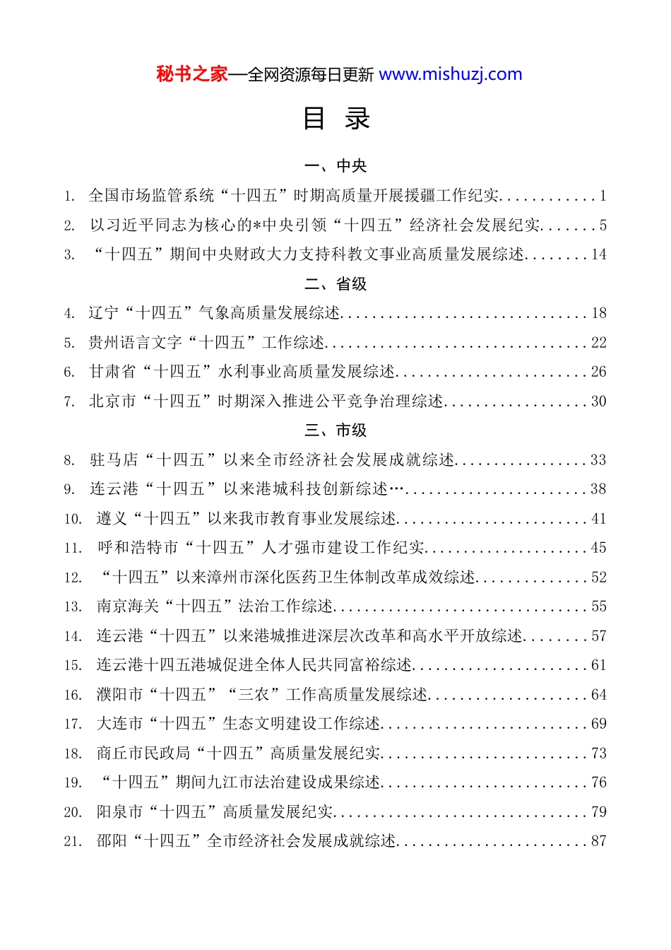 秘书之家—全网资源每日更新 www.mishuzj.com目 录一、中央1. 全国市场监管系统“十四五”时期高质量开展援疆工作纪实............1 2. 以习近平同志为核心的*中央引领“十四五”经济社会发展纪实.......5 3. “十四五”期间中央财政大力支持科教文事业高质量发展综述........14 二、省级4. 辽宁“十四五”气象高质量发展综述...............................18 5. 贵州语言文字“十四五”工作综述.................................22 6. 甘肃省“十四五”水利事业高质量发展综述........................26 7. 北京市“十四五”时期深入推进公平竞争治理综述..................30 三、市级8. 驻马店“十四五”以来全市经济社会发展成就综述.................33 9. 连云港“十四五”以来港城科技创新综述….......................38 10. 遵义“十四五”以来我市教育事业发展综述........................41 11. 呼和浩特市“十四五”人才强市建设工作纪实.....................45 12. “十四五”以来漳州市深化医药卫生体制改革成效综述..............52 13. 南京海关“十四五”法治工作综述................................55 14. 连云港“十四五”以来港城推进深层次改革和高水平开放综述........57 15. 连云港十四五港城促进全体人民共同富裕综述......................61 16. 濮阳市“十四五”“三农”工作高质量发展综述....................64 17. 大连市“十四五”生态文明建设工作综述..........................69 18. 商丘市民政局“十四五”高质量发展纪实..........................73 19. “十四五”期间九江市法治建设成果综述..........................76 20. 阳泉市“十四五”高质量发展纪实................................79 21. 邵阳“十四五”全市经济社会发展成就综述........................87 秘书之家—全网资源每日更新 www.mishuzj.com四、县级22. 陈仓区“十四五”高质量发展纪实................................91 23. 扶风县“十四五”高质量发展综述................................96 24. 宝鸡金台区“十四五”高质量发展综述...........................101 25. 宝鸡凤翔区“十四五”高质量发展综述...........................106 26. 宝鸡麟游县“十四五”高质量发展综述...........................111 27. 宝鸡高新区“十四五”高质量发展综述...........................116 五、企业28. 中信银行商丘分行“十四五”期间深耕地方经济纪实...............121 29. 中国铁建“十四五”跨越式发展综述.............................125 30. 国网兰州供电公司“十四五”发展纪实...........................132 31. 国网商丘供电公司“十四五”高质量发展纪实.....................134 32. 国家金融监督管理总局商丘监管分局“十四五”服务实体经济高质量 发展纪实.....................................................138 33. 中国农业发展银行商丘市分行“十四五”履职担当服务地方发展纪实…142 34. 山东黄金集团实现“十四五”战略目标纪实.......................145 35. 郑州银行商丘分行“十四五”期间助力经济发展纪实...............149 36. “十四五”期间航天科技集团全面支撑深空探测发展综述...........153 37. “十四五”期间航天科技集团全面支撑载人航天事业发展综述.......157 秘书之家—全网资源每日更新 www.mishuzj.com潮涌天山“共绘 疆”来“”全国市场监管系统 十四五 时期高质量开展援疆工作纪实(2025 年 9 月 26 日)曾经满眼戈壁沙漠的新疆,如今已经成为西部大粮仓,粮食单产跃居全国第一;曾经电力短缺的新疆,如今是全国规模最大的新能源外送基地,全国22 “”个省份用上了 新疆电 ;曾经身处开放末梢的新疆,如今一半以上中欧班列从这里出境,架起连通亚欧的黄金通道奋斗在中国式现代化征程上的新疆维吾尔自治区,以勃勃生机迎来成立 70 周年的荣光时刻。“新疆的发展,离不开全国人民的支持。 做好新疆...