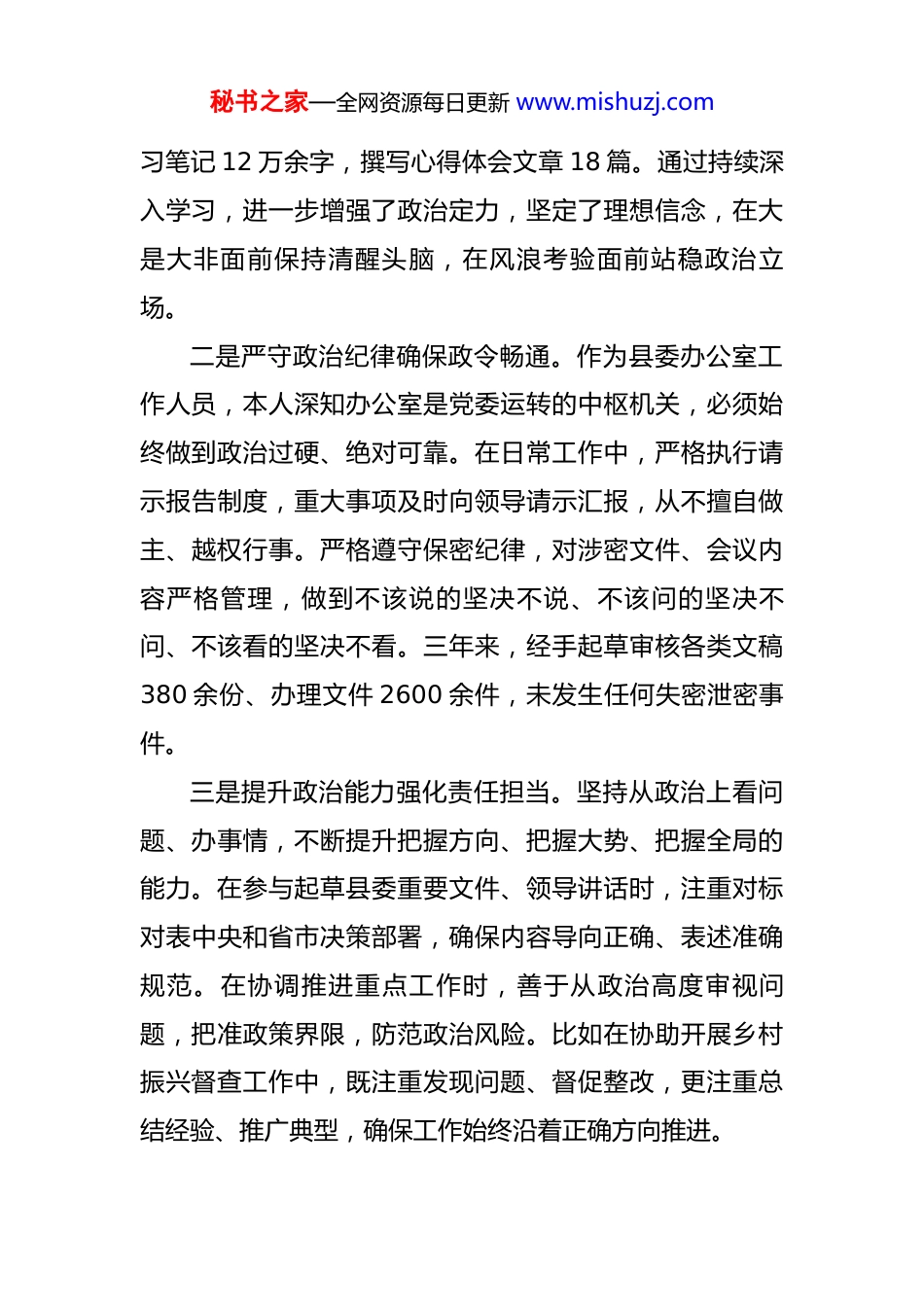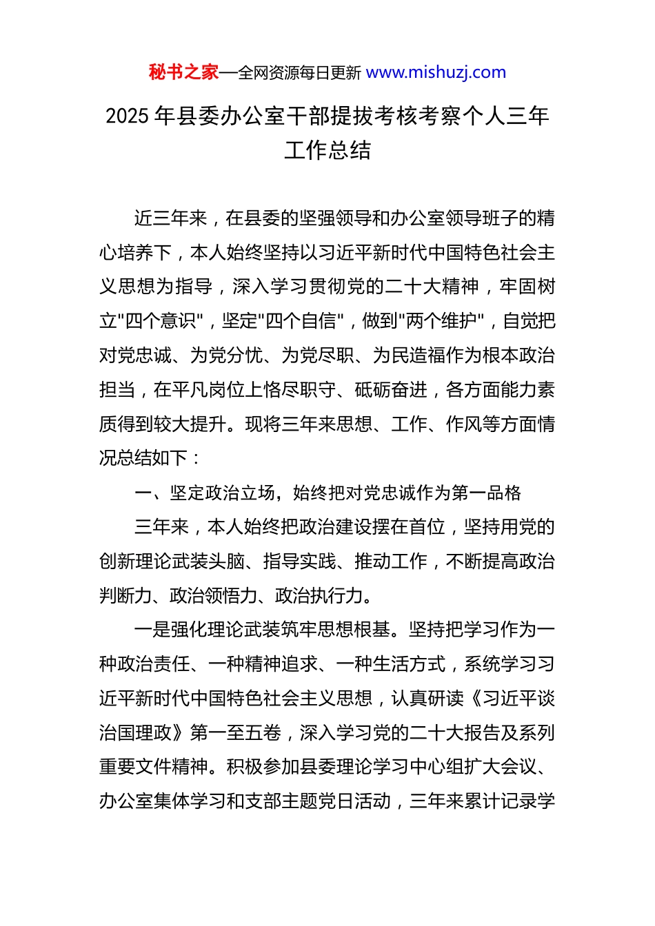 秘书之家—全网资源每日更新 www.mishuzj.com2025 年县委办公室干部提拔考核考察个人三年工作总结 近三年来,在县委的坚强领导和办公室领导班子的精心培养下,本人始终坚持以习近平新时代中国特色社会主义思想为指导,深入学习贯彻党的二十大精神,牢固树立"四个意识",坚定"四个自信",做到"两个维护",自觉把对党忠诚、为党分忧、为党尽职、为民造福作为根本政治担当,在平凡岗位上恪尽职守、砥砺奋进,各方面能力素质得到较大提升。现将三年来思想、工作、作风等方面情况总结如下:一、坚定政治立场,始终把对党忠诚作为第一品格三年来,本人始终把政治建设摆在首位,坚持用党的创新理论武装头脑、指导实践、推动工作,不断提高政治判断力、政治领悟力、政治执行力。一是强化理论武装筑牢思想根基。坚持把学习作为一种政治责任、一种精神追求、一种生活方式,系统学习习近平新时代中国特色社会主义思想,认真研读《习近平谈治国理政》第一至五卷,深入学习党的二十大报告及系列重要文件精神。积极参加县委理论学习中心组扩大会议、办公室集体学习和支部主题党日活动,三年来累计记录学秘书之家—全网资源每日更新 www.mishuzj.com习笔记 12 万余字,撰写心得体会文章 18 篇。通过持续深入学习,进一步增强了政治定力,坚定了理想信念,在大是大非面前保持清醒头脑,在风浪考验面前站稳政治立场。二是严守政治纪律确保政令畅通。作为县委办公室工作人员,本人深知办公室是党委运转的中枢机关,必须始终做到政治过硬、绝对可靠。在日常工作中,严格执行请示报告制度,重大事项及时向领导请示汇报,从不擅自做主、越权行事。严格遵守保密纪律,对涉密文件、会议内容严格管理,做到不该说的坚决不说、不该问的坚决不问、不该看的坚决不看。三年来,经手起草审核各类文稿380 余份、办理文件 2600 余件,未发生任何失密泄密事件。三是提升政治能力强化责任担当。坚持从政治上看问题、办事情,不断提升把握方向、把握大势、把握全局的能力。在参与起草县委重要文件、领导讲话时,注重对标对表中央和省市决策部署,确保内容导向正确、表述准确规范。在协调推进重点工作时,善于从政治高度审视问题,把准政策界限,防范政治风险。比如在协助开展乡村振兴督查工作中,既注重发现问题、督促整改,更注重总结经验、推广典型,确保工作始终沿着正确方向推进。秘书之家—全网资源每日更新 www.mishuzj.com二、聚焦主责主业,始终把履职尽责作为第一要务县委办公室工作政治性、政策性、服务性都很强,要求高、节奏快、压力大。三年来,本人始终保持奋发有为的精神状态,恪尽职守、主动作为,高质量完成各项工作任务。一是精心做好文稿起草工作。文稿起草是办公室的核心工作之一,直接关系到县委决策部署的贯彻落实。三年来,本人参与起草县委全会报告、县委常委会会议纪要、县委主要领导讲话稿等重要文稿 120 余篇,累计文字量达50 余万字。在起草过程中,坚持做到深入调研、吃透精神、精心打磨。比如在起草县委经济工作会议报告时,提前一个月深入园区企业、项目工地、田间地头调研,收集第一手资料,与发改、工信、农业等部门反复沟通,前后修改 15 稿,最终形成的报告得到县委领导充分肯定,为全县经济工作指明了方向。二是扎实做好综合协调工作。作为办公室综合协调岗位工作人员,本人承担着统筹协调、沟通联络的重要职责。三年来,协助完成县委重要会议筹备 80 余次,协调各类重大活动 40 余场。在工作中,注重加强与各部门的沟通联系,及时了解工作进展,协调解决困难问题,确保各项工作高效运转。2023 年上半年,县里承办全市乡村振兴现秘书之家—全网资源每日更新 www.mishuzj.com场推进会,本人全程参与会议筹备,从方案制定、点位选择、材料准备到现场布置,每个环节都精心安排、严格把关,会议取得圆满成功,得到市委领导和与会同志一致好评。三是认真做好督查督办工作。督查督办是推动工作落实的重要抓手。三年来,本人参与开展各类督查 100 余次,编发督查通报 60 余期,推动一批重点工作、重大项目加快落地见效。在督查中,坚持实事求是、客观公正,...