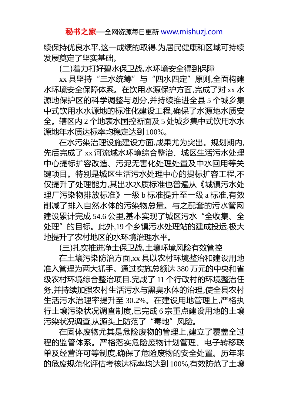 秘书之家—全网资源每日更新 www.mishuzj.comxx 县“十四五”时期生态环境保护工作成效评估报告“十四五”规划期是我国开启全面建设社会主义现代化国家新征程、向第二个百年奋斗目标进军的第一个五年,亦是生态文明建设以降碳为重点战略方向、推动减污降碳协同增效、促进经济社会发展全面绿色转型的关键时期。在此背景下,xx 县深入贯彻国家生态文明战略思想,聚焦 xx 流域生态保护与高质量发展核心任务,以空前的决心与力度,系统性推进污染防治、结构优化与治理能力现代化建设,取得了显著成效。本报告旨在对 xx 县“十四五”期间生态环境保护工作进行全面、客观的梳理与评估。一、聚焦污染防治攻坚持续改善生态环境质量“十四五”期间,xx 县坚持精准治污、科学治污、依法治污的原则,深入推进污染防治攻坚战,生态环境各项指标均呈现稳中向好的发展态势。(一)坚决打赢蓝天保卫战,空气质量显著提升xx 县以 pm2.5 和臭氧(o3)协同控制为主线,深入实施大气污染防治“六大标志性战役”。具体措施涵盖了从工业源、移动源到生活源的全方位管控。在工业领域,严格推进燃煤锅炉综合治理,强化涉气企业的常态化监管与挥发性有机物治理。在城市管理方面,严格落实建筑工地扬尘管控“六个百分百”措施,扎实开展餐饮油烟专项整治。同时,统筹加强物料运输车辆、烟花爆竹燃放及农村地区“四烧”等面源污染的管控力度。得益于上述综合性措施,“十四五”期间,xx 县城区空气质量优良率、pm2.5、pm10 平均浓度均圆满完成 xx 市下达的年度指标任务。截至 2025 年第三季度初,全县空气质量继秘书之家—全网资源每日更新 www.mishuzj.com续保持优良水平,这一成绩的取得,为居民健康和区域可持续发展奠定了坚实基础。(二)着力打好碧水保卫战,水环境安全得到保障xx 县坚持“三水统筹”与“四水四定”原则,全面构建水环境安全保障体系。在饮用水源保护方面,完成了对 xx 水源地保护区的科学调整与划分,并持续推进全县 5 个城乡集中式饮用水水源地的标准化建设工程,确保了水源地水质安全。辖区内 2 个地表水国控断面及 5 处城乡集中式饮用水水源地年水质达标率均稳定达到 100%。在水污染治理设施建设方面,成果尤为突出。规划期内,先后完成了 xx 河流域水环境综合整治、城区生活污水处理中心提标扩容改造、污泥无害化处理处置及中水回用等关键项目。特别是城区生活污水处理中心的提标扩容工程,不仅提升了处理能力,其出水水质标准也普遍从《城镇污水处理厂污染物排放标准》一级 b 标准提升至一级 a 标准,有效削减了排入自然水体的污染物总量。与之配套的污水管网建设累计完成 54.6 公里,基本实现了城区污水“全收集、全处理”的目标。此外,19 个乡镇污水处理站的建成投运,极大地提升了农村地区的水环境治理水平。(三)扎实推进净土保卫战,土壤环境风险有效管控在土壤污染防治方面,xx 县以农村环境整治和建设用地准入管理为两大抓手。通过实施总额达 380 万元的中央和省级农村环境综合整治项目,完成了 11 个行政村的环境整治任务,并持续加强农村生活污水与黑臭水体的治理,使全县农村生活污水治理率提升至 30.2%。在建设用地管理上,严格执行土壤污染状况调查制度,已完成 6 宗重点建设用地的土壤污染状况调查,从源头上防范了“毒地”风险。在固体废物尤其是危险废物的管理上,建立了覆盖全过程的监管体系。严格落实危险废物计划管理、电子转移联单及经营许可等制度,确保了危险废物的安全处置。历年来的危废规范化评估考核达标率均达到 100%,有效防范了土壤秘书之家—全网资源每日更新 www.mishuzj.com和地下水污染风险。二、优化区域发展格局加快推进绿色转型xx 县将生态环境保护理念深度融入经济社会发展的各领域与全过程,通过优化产业结构、补齐设施短板,成功推动了区域经济向绿色、循环、低碳模式转型。(一)强化生态系统建设,筑牢绿色安全屏障xx 县大力实施生态系统保护与修复工程。在林业建设方面,通过荒山造林、退化林修复、森林抚育及封山育林等措施,五年间累计完成人工造林 4.92 万亩、退化林修复 15.81万亩。全县森林覆盖率已达到 47.25%,成功创建了 5 个省级森...