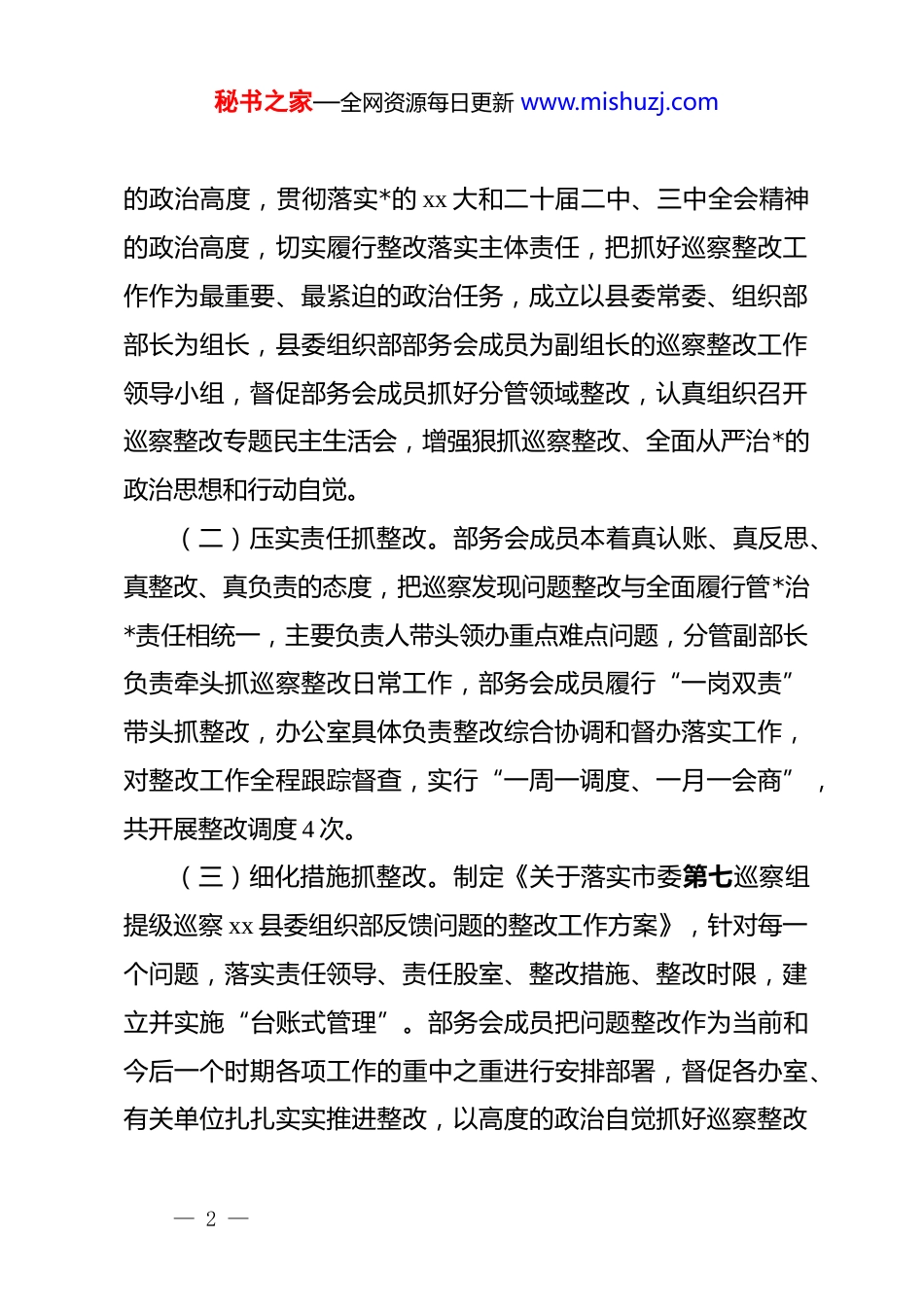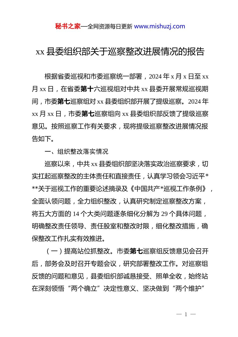 秘书之家—全网资源每日更新 www.mishuzj.comxx 县委组织部关于巡察整改进展情况的报告根据省委巡视和市委巡察统一部署,2024 年 x 月 x 日至 xx月 xx 日,在省委第十六巡视组对中共 xx 县委开展常规巡视期间,市委第七巡察组对 xx 县委组织部开展了提级巡察。2024 年xx 月 xx 日,市委第七巡察组向 xx 县委组织部反馈了提级巡察意见。按照巡察工作有关要求,现将提级巡察整改进展情况报告如下。一、组织整改落实情况巡察以来,中共 xx 县委组织部坚决落实政治巡察要求,切实扛起巡察整改的主体责任和直接责任,认真学习领会习近平***关于巡视工作的重要论述摘录及《中国共产*巡视工作条例》,全面认领问题,全力组织整改,认真研究制定巡察整改方案,将五大方面的 14 个大类问题逐条细化分解为 29 个具体问题,明确整改责任领导、责任股室和整改时限,细化整改措施,确保整改工作扎实有效推进。(一)提高站位抓整改。市委第七巡察组反馈意见会召开后,部务会及时召开专题会议,研究部署整改工作。对巡察组反馈的问题和意见,县委组织部诚恳接受、照单全收,始终站在深刻领悟“两个确立”决定性意义、坚决做到“两个维护”— 1 —秘书之家—全网资源每日更新 www.mishuzj.com的政治高度,贯彻落实*的 xx 大和二十届二中、三中全会精神的政治高度,切实履行整改落实主体责任,把抓好巡察整改工作作为最重要、最紧迫的政治任务,成立以县委常委、组织部部长为组长,县委组织部部务会成员为副组长的巡察整改工作领导小组,督促部务会成员抓好分管领域整改,认真组织召开巡察整改专题民主生活会,增强狠抓巡察整改、全面从严治*的政治思想和行动自觉。(二)压实责任抓整改。部务会成员本着真认账、真反思、真整改、真负责的态度,把巡察发现问题整改与全面履行管*治*责任相统一,主要负责人带头领办重点难点问题,分管副部长负责牵头抓巡察整改日常工作,部务会成员履行“一岗双责”带头抓整改,办公室具体负责整改综合协调和督办落实工作,对整改工作全程跟踪督查,实行“一周一调度、一月一会商”,共开展整改调度 4 次。(三)细化措施抓整改。制定《关于落实市委第七巡察组提级巡察 xx 县委组织部反馈问题的整改工作方案》,针对每一个问题,落实责任领导、责任股室、整改措施、整改时限,建立并实施“台账式管理”。部务会成员把问题整改作为当前和今后一个时期各项工作的重中之重进行安排部署,督促各办室、有关单位扎扎实实推进整改,以高度的政治自觉抓好巡察整改— 2 —秘书之家—全网资源每日更新 www.mishuzj.com“后半篇文章”。在整改过程中,始终把调查研究、举一反三、检查督办贯穿始终,先后 4 次召开部务会,听取整改进度,研究相关问题。对能迅速解决的问题,立行立改,确保第一时间整改到位,对于情况较为复杂的问题,深度研究,限期完成,做到问题不解决不松手、整改不到位不罢休。截至目前,巡察反馈的 5 个方面 14 个大类问题 29 个具体问题,已完成整改 25 个,阶段性完成整改 4 个;巡察交办的立行立改问题 6 件,已办结 6 件。二、集中整改期内整改进展情况(一)反馈问题:选人用人和领导干部队伍建设工作还有差距。问题 1:少数干部在晋职晋级时审核把关不够严整改情况:一是坚持把政治标准放在选人用人工作的首位,坚持“德才兼备、以德为先、注重实绩、群众公认”的原则,坚持好干部标准,坚持“凡提四必”制度;二是加强干部教育培训,提升干部*性修养。将选人用人方面的课程纳入到*校主体班学习内容,由县委组织部相应干部授课,不断提升领导干部的业务知识和*性修养;三是对涉嫌违纪违规的相关人员依程序进行追责问责。下一步将加强对干部多维度考察,全面了解干部工作作风、工作状态、工作能力,同时,坚持“凡提四— 3 —秘书之家—全网资源每日更新 www.mishuzj.com必”制度,强化部机关工作人员组工业务培训,提升业务水平。问题 2:对领导干部队伍建设缺乏整体长远规划--年轻干部储备不足整改情况:一是认真落实《中共湖南省委组织部关于贯彻落实《全国*政领导班子建设规划纲要...