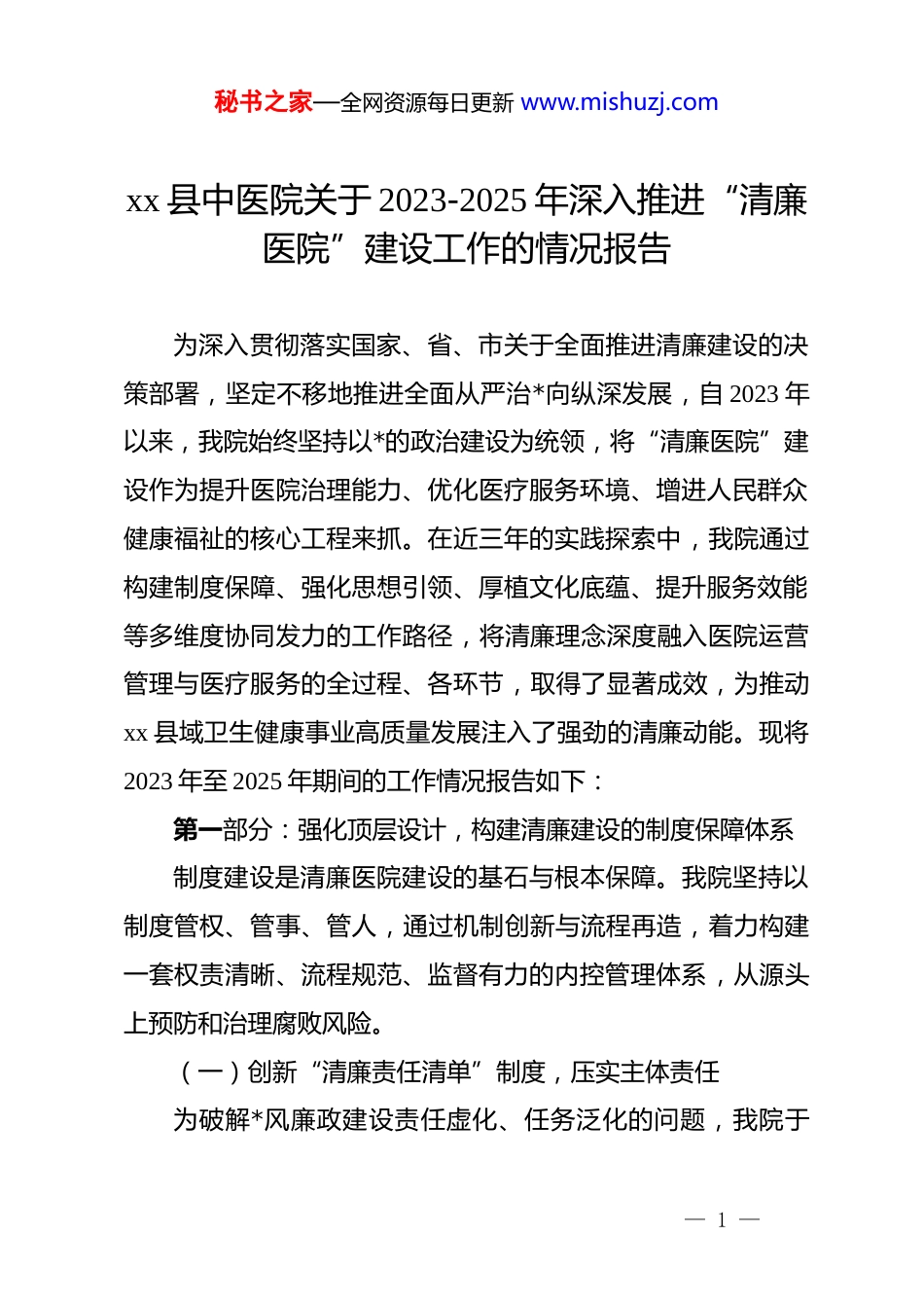 秘书之家—全网资源每日更新 www.mishuzj.comxx 县中医院关于 2023-2025 年深入推进“清廉医院”建设工作的情况报告为深入贯彻落实国家、省、市关于全面推进清廉建设的决策部署,坚定不移地推进全面从严治*向纵深发展,自 2023 年以来,我院始终坚持以*的政治建设为统领,将“清廉医院”建设作为提升医院治理能力、优化医疗服务环境、增进人民群众健康福祉的核心工程来抓。在近三年的实践探索中,我院通过构建制度保障、强化思想引领、厚植文化底蕴、提升服务效能等多维度协同发力的工作路径,将清廉理念深度融入医院运营管理与医疗服务的全过程、各环节,取得了显著成效,为推动xx 县域卫生健康事业高质量发展注入了强劲的清廉动能。现将2023 年至 2025 年期间的工作情况报告如下:第一部分:强化顶层设计,构建清廉建设的制度保障体系制度建设是清廉医院建设的基石与根本保障。我院坚持以制度管权、管事、管人,通过机制创新与流程再造,着力构建一套权责清晰、流程规范、监督有力的内控管理体系,从源头上预防和治理腐败风险。(一)创新“清廉责任清单”制度,压实主体责任为破解*风廉政建设责任虚化、任务泛化的问题,我院于— 1 —秘书之家—全网资源每日更新 www.mishuzj.com2023 年初创新推行“清廉责任清单”制度。该制度将清廉医院建设的总体目标细化分解为涵盖*风廉政、行风建设、采购管理、财务监督、医德医风等 5 大领域、共计 48 项具体任务。清单明确了每项任务的责任主体、具体措施、完成时限和评价标准,形成了“横向到边、纵向到底”的责任网络。为确保清单制度落到实处,我院建立“清廉工作回头看”月度督查机制,由院纪委牵头,每月对各科室清单任务的完成进度进行跟踪问效,形成督查通报。督查结果直接与科室及个人的年度绩效考核、评优评先、职称晋升等关键利益挂钩,对未按时完成或完成质量不高的责任主体进行约谈提醒,对问题严重者予以严肃问责,从而有效传导了压力,激发了全员参与清廉建设的内生动力。(二)完善“三重一大”决策机制,提升治理透明度“三重一大”事项是廉政风险高度集中的领域。我院严格执行*委会前置研究讨论程序,不断完善决策监督机制。自 2024年起,我院在处理预算超过 500 万元的重大工程项目和超过 100万元的大型医疗设备采购时,创新性地引入第三方专业评估机构。这些机构,如具备甲级资质的工程造价咨询公司和医疗设备评估事务所,对项目的可行性、预算的合理性、采购流程的合规性以及潜在风险进行独立、客观的评估,并出具专业报告— 2 —秘书之家—全网资源每日更新 www.mishuzj.com作为*委会决策的重要参考依据。此举措不仅提升了决策的科学性和专业性,更通过外部监督的力量,有效防止了“一言堂”和暗箱操作,使权力运行更加公开透明。2023 年 6 月,我院作为 xx 市清廉医院创建行动的示范单位,接受了全市卫生健康系统与会人员的现场观摩,该决策监督机制获得了上级领导和兄弟单位的高度评价。第二部分:深化思想教育,筑牢拒腐防变的思想道德防线思想是行动的先导。我院始终把思想政治建设摆在首位,坚持教育先行,通过构建常态化、多层次、全覆盖的廉洁教育体系,引导全院干部职工坚定理想信念,恪守职业道德,从思想深处筑牢抵御腐蚀的坚固防线。(一)构建分层分类学习体系,实现廉洁教育全覆盖在院*委和*办的主导下,我院构建了覆盖全员的分层分类学习体系。针对院领导班子和中层干部,以*委理论学习中心组为平台,重点学习 dj 法规和上级关于*风廉政建设的****精神。针对普通*员和职工,则以*支部“三会一课”和科室周会为载体,开展形式多样的廉洁教育。我院精心打造了“三个一”廉洁教育品牌活动,即每季度组织观看一部红色教育视频、每月开展一次清廉主题座谈会、每年签订一份个人廉政承诺书。通过这些活动,将廉洁教育融— 3 —秘书之家—全网资源每日更新 www.mishuzj.com入日常,化为习惯。同时,大力推行“老带新”廉洁传帮带模式,由科室主任、护士长、业务骨干担任新入职员工的“廉洁导师”,在业务指导的同时,言传身教,引导他们扣好职业生涯的“第一粒扣子”,确...