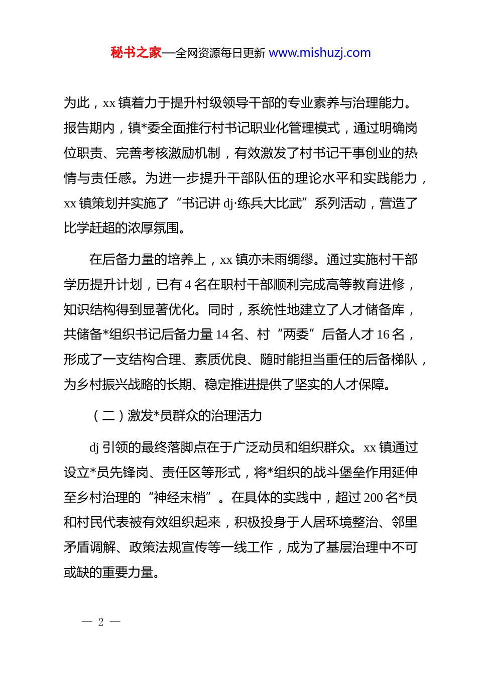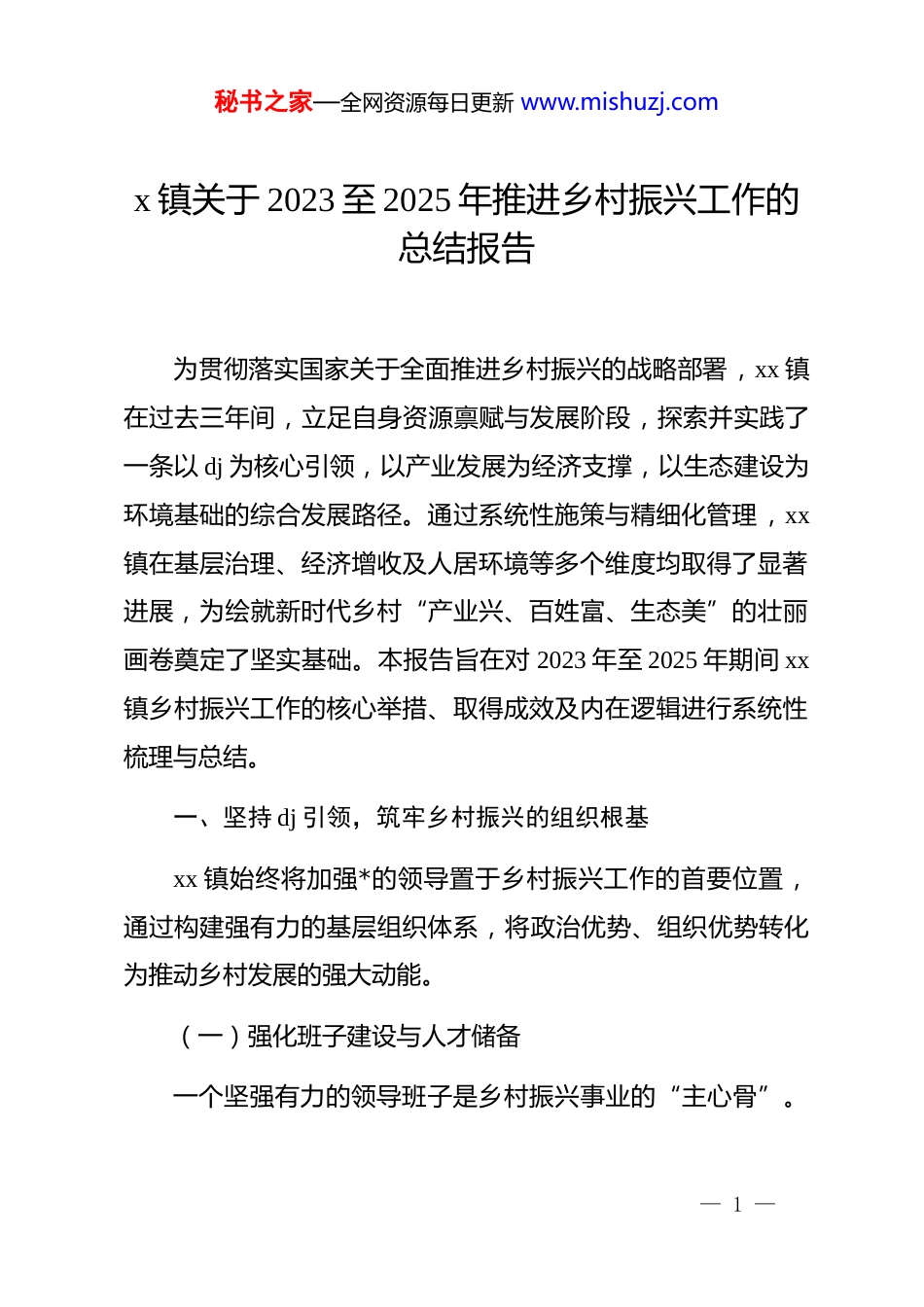 秘书之家—全网资源每日更新 www.mishuzj.comx 镇关于 2023 至 2025 年推进乡村振兴工作的总结报告为贯彻落实国家关于全面推进乡村振兴的战略部署,xx 镇在过去三年间,立足自身资源禀赋与发展阶段,探索并实践了一条以 dj 为核心引领,以产业发展为经济支撑,以生态建设为环境基础的综合发展路径。通过系统性施策与精细化管理,xx镇在基层治理、经济增收及人居环境等多个维度均取得了显著进展,为绘就新时代乡村“产业兴、百姓富、生态美”的壮丽画卷奠定了坚实基础。本报告旨在对 2023 年至 2025 年期间 xx镇乡村振兴工作的核心举措、取得成效及内在逻辑进行系统性梳理与总结。一、坚持 dj 引领,筑牢乡村振兴的组织根基xx 镇始终将加强*的领导置于乡村振兴工作的首要位置,通过构建强有力的基层组织体系,将政治优势、组织优势转化为推动乡村发展的强大动能。(一)强化班子建设与人才储备一个坚强有力的领导班子是乡村振兴事业的“主心骨”。— 1 —秘书之家—全网资源每日更新 www.mishuzj.com为此,xx 镇着力于提升村级领导干部的专业素养与治理能力。报告期内,镇*委全面推行村书记职业化管理模式,通过明确岗位职责、完善考核激励机制,有效激发了村书记干事创业的热情与责任感。为进一步提升干部队伍的理论水平和实践能力,xx 镇策划并实施了“书记讲 dj·练兵大比武”系列活动,营造了比学赶超的浓厚氛围。在后备力量的培养上,xx 镇亦未雨绸缪。通过实施村干部学历提升计划,已有 4 名在职村干部顺利完成高等教育进修,知识结构得到显著优化。同时,系统性地建立了人才储备库,共储备*组织书记后备力量 14 名、村“两委”后备人才 16 名,形成了一支结构合理、素质优良、随时能担当重任的后备梯队,为乡村振兴战略的长期、稳定推进提供了坚实的人才保障。(二)激发*员群众的治理活力dj 引领的最终落脚点在于广泛动员和组织群众。xx 镇通过设立*员先锋岗、责任区等形式,将*组织的战斗堡垒作用延伸至乡村治理的“神经末梢”。在具体的实践中,超过 200 名*员和村民代表被有效组织起来,积极投身于人居环境整治、邻里矛盾调解、政策法规宣传等一线工作,成为了基层治理中不可或缺的重要力量。— 2 —秘书之家—全网资源每日更新 www.mishuzj.com这些举措的背后,是一套系统化的制度设计。尽管公开信息中未能检索到 xx 镇具体的 dj 引领政策文件名称,但参照 xx地区其他乡镇发布的《坚持 dj 引领践行“432”工作法推进宜居宜业美丽 xx 建设再上新台阶——xx 镇 2023 年度工作要点》及《xx 镇 2023 年 dj 工作要点》等文件,可以合理推断 xx 镇的 dj工作同样建立在周密的年度规划与清晰的工作要点之上。这种将宏观政策导向细化为具体行动指南的做法,确保了 dj 引领工作有章可循、有据可依,从而将组织的政治引领力、思想凝聚力、群众组织力和社会号召力,切实转化为了推进乡村全面振兴的强大合力。二、聚焦特色产业,夯实乡村振兴的经济基础产业兴旺是解决农村一切问题的前提。xx 镇紧密结合地域特色,以市场需求为导向,围绕“一碗面”经济,构建了从田间到餐桌的全产业链条,有效拓宽了农民增收渠道,为乡村振兴注入了持续的经济动力。(一)围绕“一碗面”经济构建全产业链xx 镇的产业发展策略,核心在于深度挖掘本地传统饮食文化的经济价值。以知名的 xx 臊子面为牵引,xx 镇着力打造了以— 3 —秘书之家—全网资源每日更新 www.mishuzj.com“一碗面”为主题的特色经济体系。产业链的源头,是规划建设的千亩优质专用小麦种植基地。此举旨在从根本上保证原材料的品质与供应稳定。尽管关于 2023 年至 2025 年期间该镇小麦具体的种植面积、总产量及单产变化的精确统计数据在公开渠道未能获取,但千亩规模化基地的建立,本身就标志着当地农业生产从传统、分散的模式向标准化、集约化的现代农业模式转型,为后续产业化发展奠定了坚实的物质基础。在产业链的中游,xx 镇大力扶持本地面食加工龙头企业,鼓励其进行技术改造与产品创新。通过研发推广臊子面速食产品等多元化、便捷化的消费品,成功将...