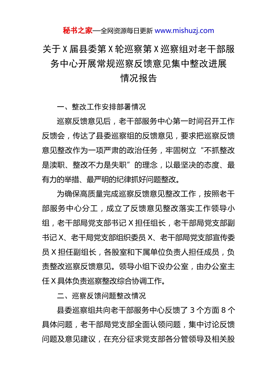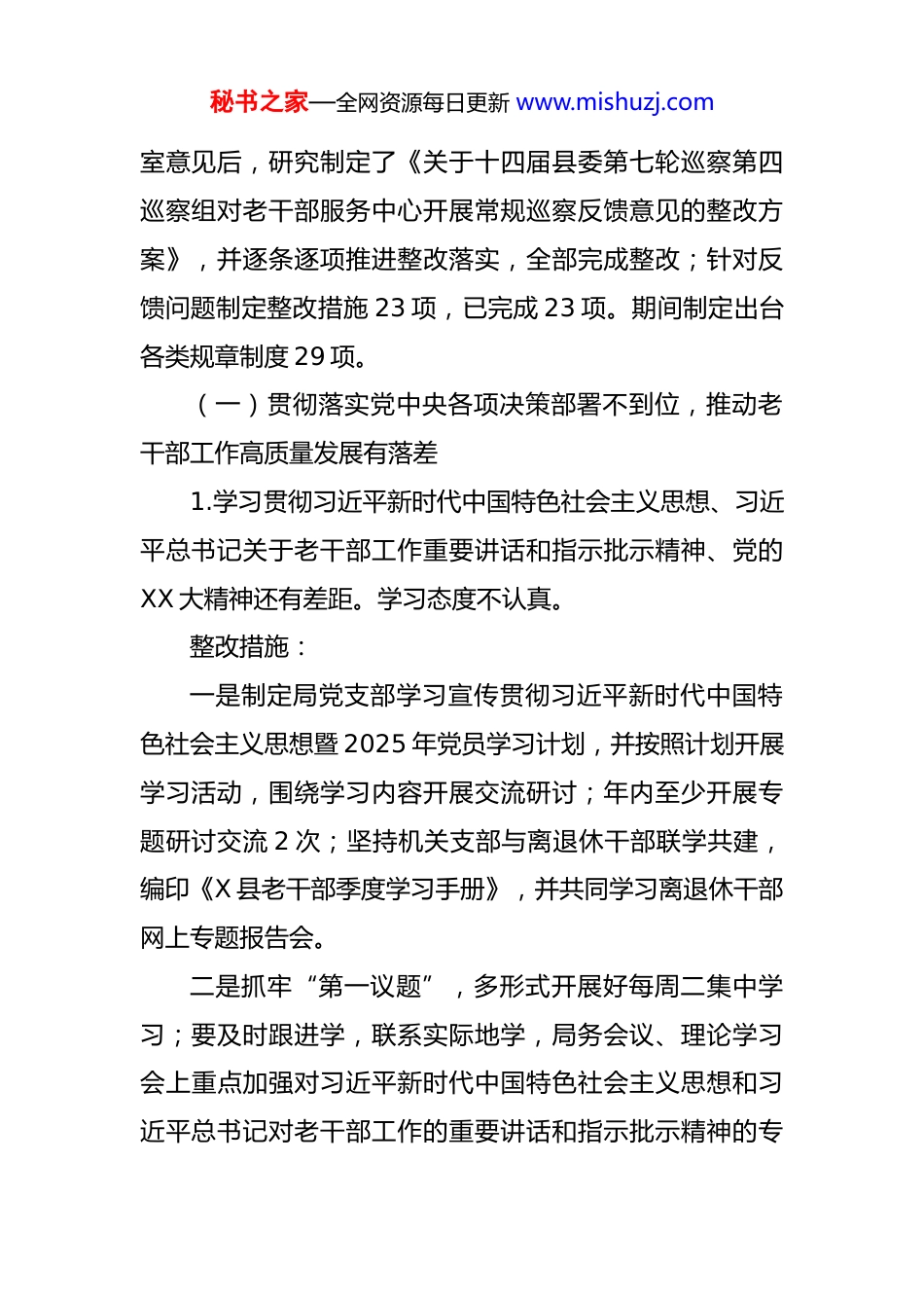 秘书之家—全网资源每日更新 www.mishuzj.com关于 X 届县委第 X 轮巡察第 X 巡察组对老干部服务中心开展常规巡察反馈意见集中整改进展情况报告 一、整改工作安排部署情况巡察反馈意见后,老干部服务中心第一时间召开工作反馈会,传达了县委巡察组的反馈意见,要求把巡察反馈意见整改作为一项严肃的政治任务,牢固树立“不抓整改是渎职、整改不力是失职”的理念,以最坚决的态度、最有力的举措、最严明的纪律抓好问题整改。为确保高质量完成巡察反馈意见整改工作,按照老干部服务中心分工,成立了反馈意见整改落实工作领导小组,老干部局党支部书记 X 担任组长,老干部局党支部副书记 X、老干局党支部组织委员 X、老干部局党支部宣传委员 X 担任副组长,各股室和下属单位负责人担任成员,负责整改巡察反馈意见。领导小组下设办公室,由办公室主任 X 具体负责巡察整改综合协调工作。二、巡察反馈问题整改情况县委巡察组共向老干部服务中心反馈了 3 个方面 8 个具体问题,老干部局党支部全面认领问题,集中讨论反馈问题及意见建议,在充分征求党支部各分管领导及相关股秘书之家—全网资源每日更新 www.mishuzj.com室意见后,研究制定了《关于十四届县委第七轮巡察第四巡察组对老干部服务中心开展常规巡察反馈意见的整改方案》,并逐条逐项推进整改落实,全部完成整改;针对反馈问题制定整改措施 23 项,已完成 23 项。期间制定出台各类规章制度 29 项。(一)贯彻落实党中央各项决策部署不到位,推动老干部工作高质量发展有落差1.学习贯彻习近平新时代中国特色社会主义思想、习近平总书记关于老干部工作重要讲话和指示批示精神、党的XX 大精神还有差距。学习态度不认真。整改措施:一是制定局党支部学习宣传贯彻习近平新时代中国特色社会主义思想暨 2025 年党员学习计划,并按照计划开展学习活动,围绕学习内容开展交流研讨;年内至少开展专题研讨交流 2 次;坚持机关支部与离退休干部联学共建,编印《X 县老干部季度学习手册》,并共同学习离退休干部网上专题报告会。二是抓牢“第一议题”,多形式开展好每周二集中学习;要及时跟进学,联系实际地学,局务会议、理论学习会上重点加强对习近平新时代中国特色社会主义思想和习近平总书记对老干部工作的重要讲话和指示批示精神的专秘书之家—全网资源每日更新 www.mishuzj.com题学习;争取每月在公众号上发布一期政治理论学习内容。三是加强政治学习督查,不定期督促检查党员的学习情况,及时纠正其学习态度,原则上要求党员做好学习笔记。整改进展:一是修订《X 县老干部局党员教育培训制度》(2025年 4 月 8 日经党支委扩大会讨论通过实施),明确学习内容、学习方式等,并严格按照制度开展学习,围绕深入贯彻中央八项规定精神学习内容开展交流研讨 1 次;按季度为老同志编印学习手册,向干部和离退休干部党支部赠送了第一、二季度《X 县老干部季度学习手册》,对提升学习教育成效起到了积极的促进作用;跟进开展线上共学创新理论活动:3 月 20 日—3 月 31 日,5 月 21 日,老干部服务中心联动全县各离退休干部党支部和老年大学,组织离退休干部收听了第 27 场、28 场全国离退休干部网上专题报告会,深入学习贯彻习近平总书记关于科技创新的重要论述、关于加强党的作风建设的重要论述,并开展了线上热议。二是出台《老干部服务中心落实“第一议题”学习制度实施办法》(2025 年 4 月 8 日党支部扩大会集体讨论通秘书之家—全网资源每日更新 www.mishuzj.com过实施),配套修订《党支部主题党日及每周二集中学习制度》(2025 年 5 月 12 日党支部扩大会集体讨论通过实施),目前共开展集中学习 19 次;线上发布“第一议题”导学资料 5 期,班子会和集中学习会共学习了 29 个“第一议题”内容,其中:集中学习习近平总书记关于老干部工作的重要论述 3 次、习近平关于加强党的作风建设论述摘编 6 次。三是统一下发学习笔记本,党支部书记逢学习会必提醒“好记性不如烂笔头”,提倡支部党员和列学人员做好学习笔记。完成情况:已完成。长期坚持。2.履行主责...