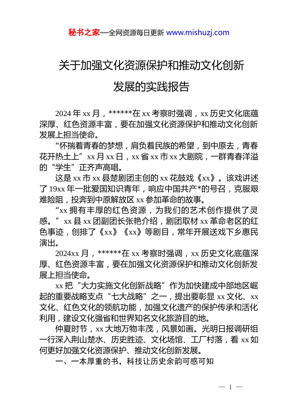 秘书之家—全网资源每日更新 www.mishuzj.com关于加强文化资源保护和推动文化创新发展的实践报告2024 年 xx 月,******在 xx 考察时强调,xx 历史文化底蕴深厚、红色资源丰富,要在加强文化资源保护和推动文化创新发展上担当使命。“怀揣着青春的梦想,肩负着民族的希望,到中原去,青春花开热土上”xx 月 xx 日,xx 省 xx 市 xx 大剧院,一群青春洋溢的“学生”正齐声高唱。这是 xx 市 xx 县楚剧团主创的 xx 花鼓戏《xx》。该戏讲述了 19xx 年一批爱国知识青年,响应中国共产*的号召,克服艰难险阻,投奔到中原解放区 xx 参加革命的故事。“xx 拥有丰厚的红色资源,为我们的艺术创作提供了灵感。”xx 县 xx 团副团长张艳介绍,剧团取材 xx 革命老区的红色事迹,创排了《xx》《xx》等剧目,常年开展送戏下乡惠民演出。2024xx 月,******在 xx 考察时强调,xx 历史文化底蕴深厚、红色资源丰富,要在加强文化资源保护和推动文化创新发展上担当使命。xx 把“大力实施文化创新战略”作为加快建成中部地区崛起的重要战略支点“七大战略”之一,提出要彰显 xx 文化、xx文化、红色文化的领航功能,加强文化遗产的保护传承和活化利用,建设文化强省和世界知名文化旅游目的地。仲夏时节,xx 大地万物丰茂,风景如画。光明日报调研组一行深入荆山楚水、历史胜迹、文化场馆、工厂村落,看 xx 如何更好加强文化资源保护、推动文化创新发展。一、一本厚重的书,科技让历史余韵可感可知— 1 —秘书之家—全网资源每日更新 www.mishuzj.com在 xx 文物保护中心的实验室里,浸泡着千年简牍的方形容器在灯光下泛着微光。荆州文物保护中心主任 xxx 正俯身观察一枚刚清洗完毕的楚墓简牍:“简牍保护是‘慢工出细活’,每一枚都得像照顾婴儿般精心。”xxx 告诉调研组,因地处南方潮湿地带,xx 出土简牍含水率极高。这种“饱水简牍”刚出土的时候大多散成一堆、色黑如炭,全然失去竹木本态,散乱如煮熟的面条,轻轻一碰就可能碎成齑粉。饱水简牍修复,一度是世界性技术难题。为此,xxx 团队迎难而上,独创“连二亚硫酸钠脱色法”,还原简牍出土后因氧化改变的化学基团,将发黑简面还原为米黄色,在不损伤竹简纤维和墨迹的前提下,解决了简牍文字信息提取难题。同时,团队还研发出“十六醇脱水加固法”,利用高级醇不溶于水、易溶于乙醇的特性,置换简牍中的水分子并从内部充填,使糟朽简牍定形,便于长期保存及利用。这两项技术相继荣获国家文物局文物保护科学和技术创新奖一等奖、xx 省科技进步奖二等奖。眼下,荆州文物保护中心正开展简牍信息提取仪器的国产化攻关。“自主研发不仅能提升读取能力,更关系到考古的未来,核心技术必须攥在自己手里。”xxx 语气坚定。截至目前,xx 出土简牍近百批次、x.x 万余枚。今年,xx将省级文物保护专项资金增加到 x 亿元,重点支持推进简牍保护修复、整理研究、综合利用等工作。在 xx 简牍的传承保护与活化利用座谈会上,中国社会科学院学部委员、中国秦汉史研究会会长卜宪群说:“xx 简牍时间跨度长、独特性明显,在全国简牍版图中地位十分重要。”当一枚枚简牍从模糊走向清晰,那些关于先秦的律法、汉代的书信、楚地的歌谣,正通过科技之力掀开历史的重重帷幕,重新走进人们的视野。xx 的历史,宛如“一本厚重的书”。而科技,不仅让曾在— 2 —秘书之家—全网资源每日更新 www.mishuzj.com地下“沉睡”的文字重新“开口说话”,也为地上的文物披上了抵御岁月侵蚀的“铠甲”。“郡邑浮前浦,波澜动远空。”站在 xx 古城上游目骋怀,“一座 xx 城,半部华夏史”的历史厚重感油然而生。与此同时,一套被比作城墙“电子体温计”的系统,正 xx 小时不间断地守护着古城墙。20xx 年,xx 市在城墙上布设数字化自动监测系统,对城墙的歪闪、裂缝、位移、湿度等进行全天候监测,所有数据及时传送至监测库汇总,当墙体出现鼓胀、沉降等超出临界值的情况,系统便会即时报警。“过去靠肉眼巡检,现在有了不闭眼的‘火眼金睛’。”xx市文物管理处主任 xxx 打开监测平台,各监测点正实时回传着裂缝...