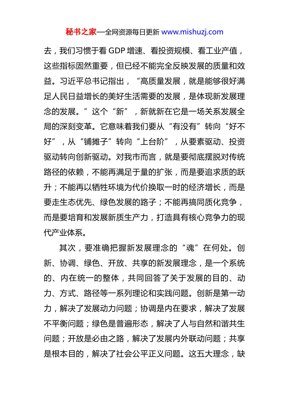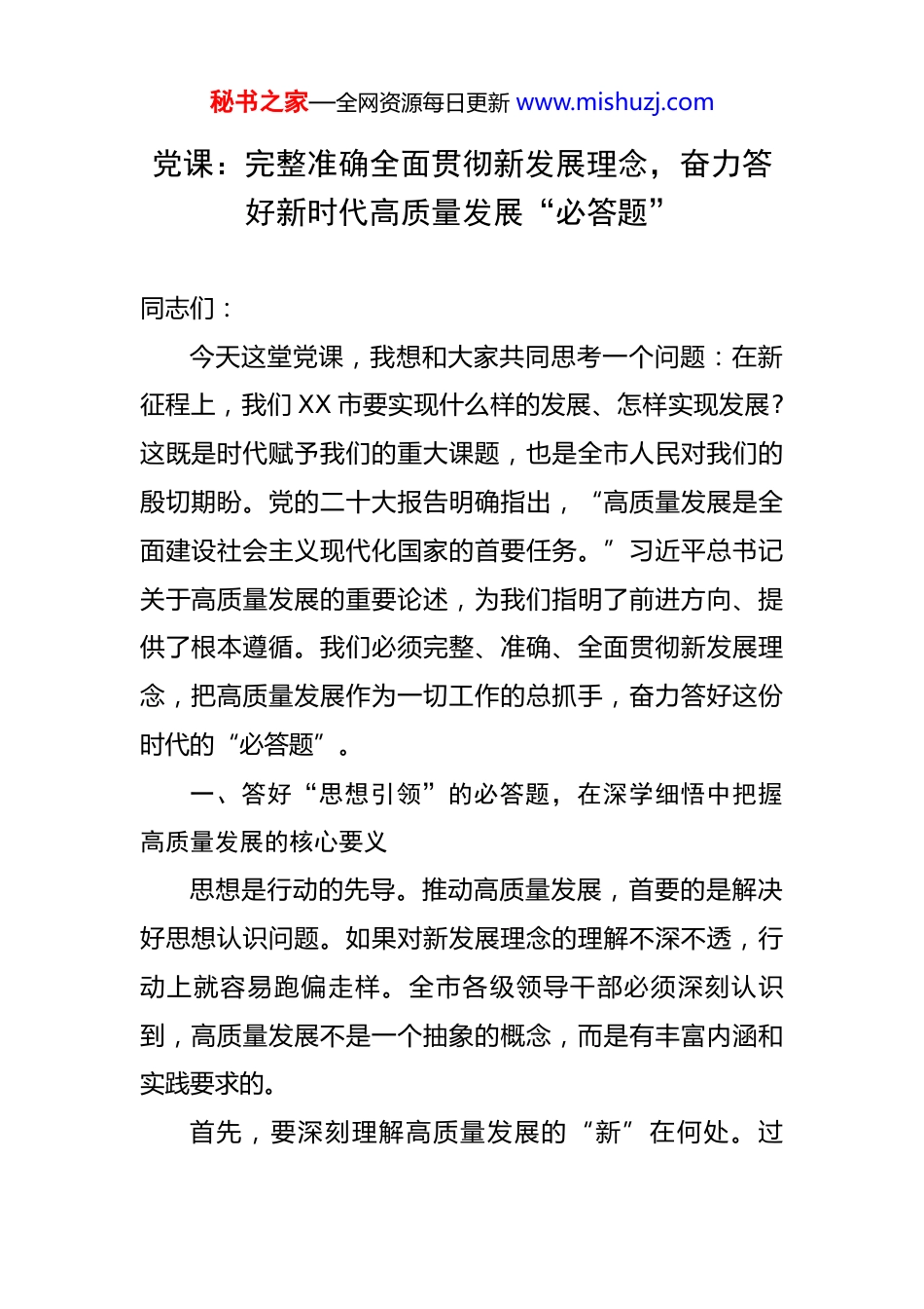 秘书之家—全网资源每日更新 www.mishuzj.com党课:完整准确全面贯彻新发展理念,奋力答好新时代高质量发展“必答题” 同志们:今天这堂党课,我想和大家共同思考一个问题:在新征程上,我们 XX 市要实现什么样的发展、怎样实现发展?这既是时代赋予我们的重大课题,也是全市人民对我们的殷切期盼。党的二十大报告明确指出,“高质量发展是全面建设社会主义现代化国家的首要任务。”习近平总书记关于高质量发展的重要论述,为我们指明了前进方向、提供了根本遵循。我们必须完整、准确、全面贯彻新发展理念,把高质量发展作为一切工作的总抓手,奋力答好这份时代的“必答题”。一、答好“思想引领”的必答题,在深学细悟中把握高质量发展的核心要义思想是行动的先导。推动高质量发展,首要的是解决好思想认识问题。如果对新发展理念的理解不深不透,行动上就容易跑偏走样。全市各级领导干部必须深刻认识到,高质量发展不是一个抽象的概念,而是有丰富内涵和实践要求的。首先,要深刻理解高质量发展的“新”在何处。过秘书之家—全网资源每日更新 www.mishuzj.com去,我们习惯于看 GDP 增速、看投资规模、看工业产值,这些指标固然重要,但已经不能完全反映发展的质量和效益。习近平总书记指出,“高质量发展,就是能够很好满足人民日益增长的美好生活需要的发展,是体现新发展理念的发展。”这个“新”,新就新在它是一场关系发展全局的深刻变革。它意味着我们要从“有没有”转向“好不好”,从“铺摊子”转向“上台阶”,从要素驱动、投资驱动转向创新驱动。对我市而言,就是要彻底摆脱对传统路径的依赖,不能再满足于量的扩张,而是要追求质的跃升;不能再以牺牲环境为代价换取一时的经济增长,而是要走生态优先、绿色发展的路子;不能再搞同质化竞争,而是要培育和发展新质生产力,打造具有核心竞争力的现代产业体系。其次,要准确把握新发展理念的“魂”在何处。创新、协调、绿色、开放、共享的新发展理念,是一个系统的、内在统一的整体,共同回答了关于发展的目的、动力、方式、路径等一系列理论和实践问题。创新是第一动力,解决了发展动力问题;协调是内在要求,解决了发展不平衡问题;绿色是普遍形态,解决了人与自然和谐共生问题;开放是必由之路,解决了发展内外联动问题;共享是根本目的,解决了社会公平正义问题。这五大理念,缺秘书之家—全网资源每日更新 www.mishuzj.com一不可,必须一体坚持、一体落实。我们不能搞单打一,不能用协调否定创新,也不能用绿色否定发展。比如,在推进产业转型升级中,既要大力发展战略性新兴产业和未来产业,又要运用新技术改造提升传统产业,实现“有中生新”;在推进城乡建设中,既要建好现代化新城,又要保留好城市文脉和乡村风貌,实现协调共生;在招商引资中,既要敞开大门,又要守住环保和安全的底线,实现高质量“引进来”。最后,要全面贯彻高质量发展的“根”在何处。发展的根基在于人民。习近平总书记反复强调,“人民对美好生活的向往,就是我们的奋斗目标。”高质量发展的出发点和落脚点,就是要不断增强人民群众的获得感、幸福感、安全感。我们谋划的每一项改革、推出的每一项政策、建设的每一个项目,都要问一问群众需不需要、满不满意、高不高兴。检验我们发展成效的最终标准,不是报表上的数字有多亮眼,而是老百姓的腰包是不是更鼓了,孩子的教育是不是更好了,看病就医是不是更方便了,生态环境是不是更优美了。忘记了“为了谁”,发展就会迷失方向。全市党员干部必须站稳人民立场,把高质量发展的过程变成造福人民的过程。二、答好“实践路径”的必答题,在精准发力中破解秘书之家—全网资源每日更新 www.mishuzj.com高质量发展的瓶颈制约推动高质量发展,不能“脚踩西瓜皮,滑到哪里是哪里”,必须找准主攻方向和关键抓手,破解长期制约我市发展的瓶颈问题。第一,以科技创新为引擎,破解“动力不足”的瓶颈。创新是引领发展的第一动力。我市产业结构偏传统,创新能力不强,是制约高质量发展的最大短板。必须把创新摆在发展的核心位置。一要建强创新平台。要集中资源支持 XX 高新区创建国家级高新区,...