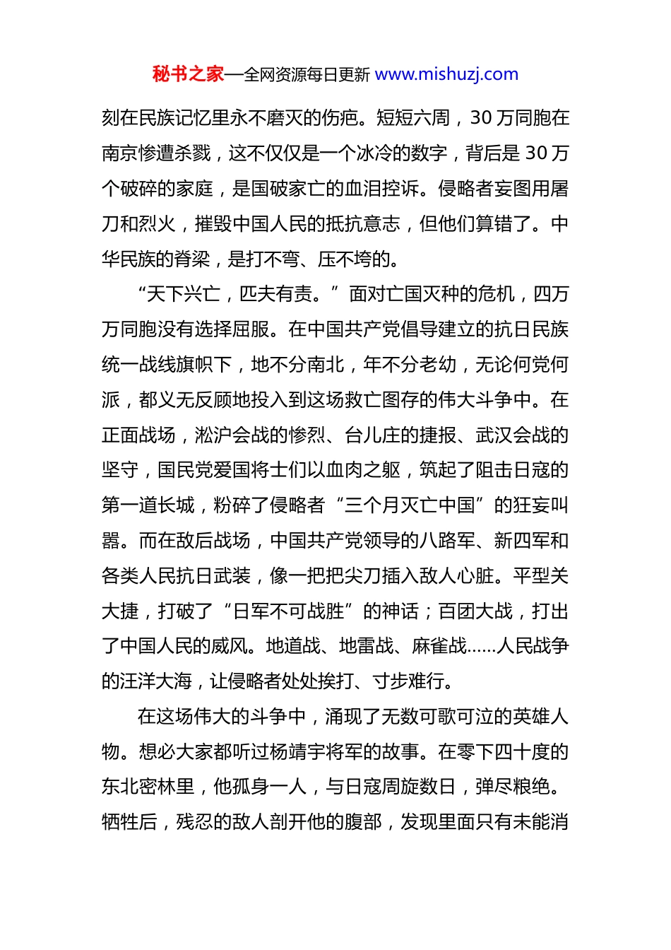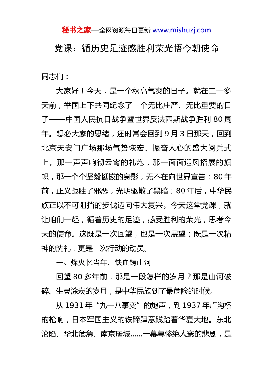 秘书之家—全网资源每日更新 www.mishuzj.com党课:循历史足迹感胜利荣光悟今朝使命 同志们:大家好!今天,是一个秋高气爽的日子。就在二十多天前,举国上下共同纪念了一个无比庄严、无比重要的日子——中国人民抗日战争暨世界反法西斯战争胜利 80 周年。想必大家的思绪,还时常会回到 9 月 3 日那天,回到北京天安门广场那场气势恢宏、振奋人心的盛大阅兵式上。那一声声响彻云霄的礼炮,那一面面迎风招展的旗帜,那一个个坚毅挺拔的身影,无不在向世界宣告:80 年前,正义战胜了邪恶,光明驱散了黑暗;80 年后,中华民族正以不可阻挡的步伐迈向伟大复兴。今天这堂党课,就让咱们一起,循着历史的足迹,感受胜利的荣光,思考今天的使命。这既是一次回望,也是一次展望;既是一次精神的洗礼,更是一次行动的动员。一、烽火忆当年,铁血铸山河回望 80 多年前,那是一段怎样的岁月?那是山河破碎、生灵涂炭的岁月,是中华民族到了最危险的时候。从 1931 年“九一八事变”的炮声,到 1937 年卢沟桥的枪响,日本军国主义的铁蹄肆意践踏着华夏大地。东北沦陷、华北危急、南京屠城……一幕幕惨绝人寰的悲剧,是秘书之家—全网资源每日更新 www.mishuzj.com刻在民族记忆里永不磨灭的伤疤。短短六周,30 万同胞在南京惨遭杀戮,这不仅仅是一个冰冷的数字,背后是 30 万个破碎的家庭,是国破家亡的血泪控诉。侵略者妄图用屠刀和烈火,摧毁中国人民的抵抗意志,但他们算错了。中华民族的脊梁,是打不弯、压不垮的。“天下兴亡,匹夫有责。”面对亡国灭种的危机,四万万同胞没有选择屈服。在中国共产党倡导建立的抗日民族统一战线旗帜下,地不分南北,年不分老幼,无论何党何派,都义无反顾地投入到这场救亡图存的伟大斗争中。在正面战场,淞沪会战的惨烈、台儿庄的捷报、武汉会战的坚守,国民党爱国将士们以血肉之躯,筑起了阻击日寇的第一道长城,粉碎了侵略者“三个月灭亡中国”的狂妄叫嚣。而在敌后战场,中国共产党领导的八路军、新四军和各类人民抗日武装,像一把把尖刀插入敌人心脏。平型关大捷,打破了“日军不可战胜”的神话;百团大战,打出了中国人民的威风。地道战、地雷战、麻雀战……人民战争的汪洋大海,让侵略者处处挨打、寸步难行。在这场伟大的斗争中,涌现了无数可歌可泣的英雄人物。想必大家都听过杨靖宇将军的故事。在零下四十度的东北密林里,他孤身一人,与日寇周旋数日,弹尽粮绝。牺牲后,残忍的敌人剖开他的腹部,发现里面只有未能消秘书之家—全网资源每日更新 www.mishuzj.com化的树皮、草根和棉絮。还有巾帼英雄赵一曼,面对日军的酷刑,她坚贞不屈,在给儿子的遗信中写道:“母亲不用千言万语来教育你,就用行动来教育你。”这些英雄的名字,以及更多无名的烈士,他们用生命和热血,谱写了惊天地、泣鬼神的壮丽史诗。他们是中华民族的脊梁,是永远的精神丰碑。经过长达 14 年的浴血奋战,中国人民以伤亡 3500 万人的巨大民族牺牲为代价,终于在 1945 年迎来了最后的胜利。这一胜利,是近代以来中国反抗外敌入侵的第一次完全胜利,它彻底扭转了中华民族的命运,为实现民族独立和人民解放奠定了坚实的基础。同时,作为世界反法西斯战争的东方主战场,中国的持久抗战,牵制和消灭了日本军国主义的主要兵力,为世界反法西斯战争的最终胜利作出了不可磨灭的巨大贡献。二、雄师展新貌,强国启新程历史的硝烟虽已散去,但铭记历史、捍卫和平的脚步从未停歇。今年 9 月 3 日,在天安门广场举行的胜利 80 周年纪念大会和盛大阅兵式,就是对历史最好的纪念,对未来最郑重的宣示。那天的场景,我相信在座的每一位同志都通过电视或网络直播看到了,那种震撼和自豪,是发自内心的。整个仪式流程严谨而庄重,充满了深刻的象征意义。秘书之家—全网资源每日更新 www.mishuzj.com首先,是“铭记”与“传承”。阅兵式不仅仅是武器装备的展示,更是一堂生动的历史课。当礼炮鸣响 80 声,寓意着胜利 80 周年;当仪仗队护卫着国旗走过,每一步都仿佛踏在历史的节点上。此次阅兵的一大亮点,是首次设置了“抗战老兵方阵”。当那些满头银发、胸...