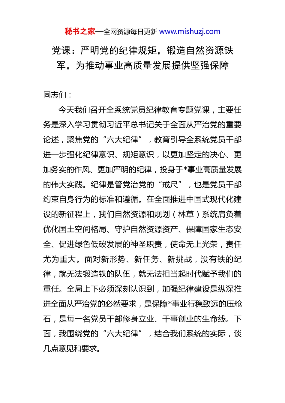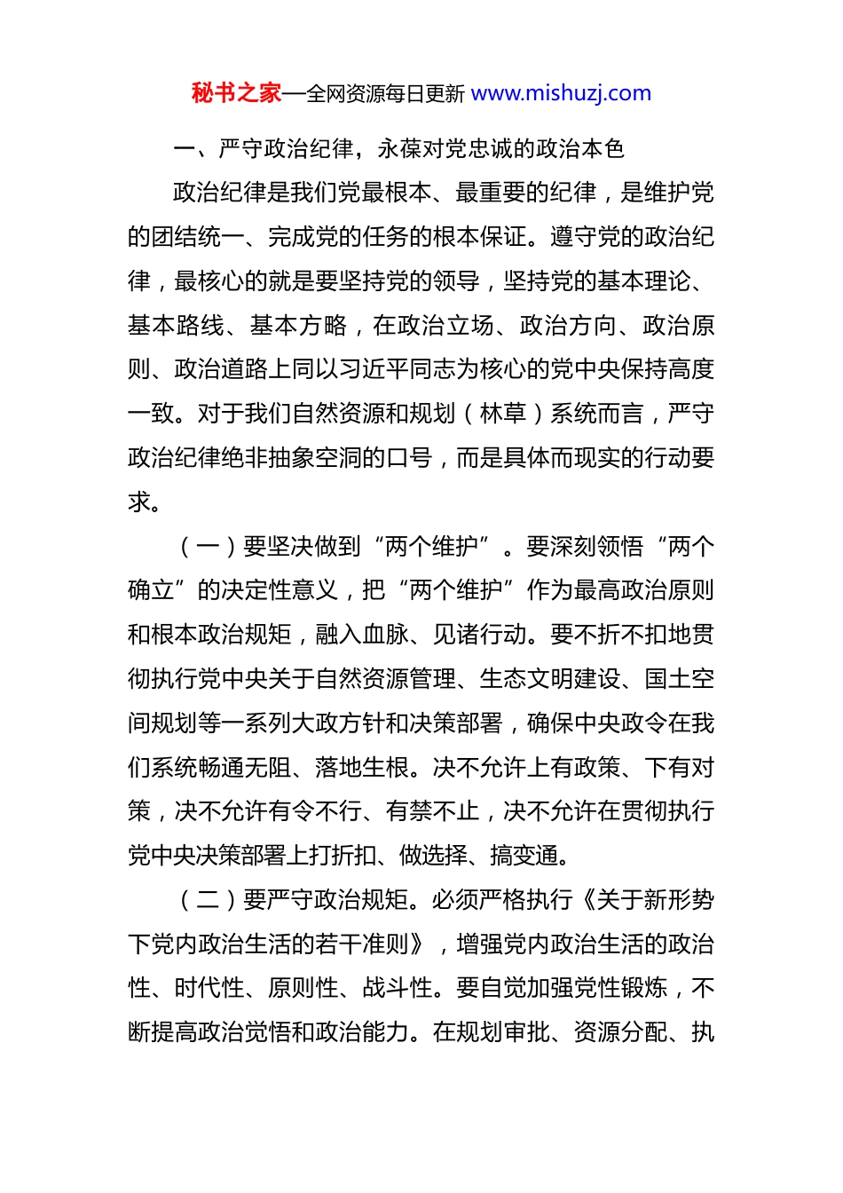 秘书之家—全网资源每日更新 www.mishuzj.com党课:严明党的纪律规矩,锻造自然资源铁军,为推动事业高质量发展提供坚强保障 同志们:今天我们召开全系统党员纪律教育专题党课,主要任务是深入学习贯彻习近平总书记关于全面从严治党的重要论述,聚焦党的“六大纪律”,教育引导全系统党员干部进一步强化纪律意识、规矩意识,以更加坚定的决心、更加务实的作风、更加严明的纪律,投身于*事业高质量发展的伟大实践。纪律是管党治党的“戒尺”,也是党员干部约束自身行为的标准和遵循。在全面推进中国式现代化建设的新征程上,我们自然资源和规划(林草)系统肩负着优化国土空间格局、守护自然资源资产、保障国家生态安全、促进绿色低碳发展的神圣职责,使命无上光荣,责任尤为重大。面对新形势、新任务、新挑战,没有铁的纪律,就无法锻造铁的队伍,就无法担当起时代赋予我们的重任。全局上下必须深刻认识到,加强纪律建设是纵深推进全面从严治党的必然要求,是保障*事业行稳致远的压舱石,是每一名党员干部修身立业、干事创业的生命线。下面,我围绕党的“六大纪律”,结合我们系统的实际,谈几点意见和要求。秘书之家—全网资源每日更新 www.mishuzj.com一、严守政治纪律,永葆对党忠诚的政治本色政治纪律是我们党最根本、最重要的纪律,是维护党的团结统一、完成党的任务的根本保证。遵守党的政治纪律,最核心的就是要坚持党的领导,坚持党的基本理论、基本路线、基本方略,在政治立场、政治方向、政治原则、政治道路上同以习近平同志为核心的党中央保持高度一致。对于我们自然资源和规划(林草)系统而言,严守政治纪律绝非抽象空洞的口号,而是具体而现实的行动要求。(一)要坚决做到“两个维护”。要深刻领悟“两个确立”的决定性意义,把“两个维护”作为最高政治原则和根本政治规矩,融入血脉、见诸行动。要不折不扣地贯彻执行党中央关于自然资源管理、生态文明建设、国土空间规划等一系列大政方针和决策部署,确保中央政令在我们系统畅通无阻、落地生根。决不允许上有政策、下有对策,决不允许有令不行、有禁不止,决不允许在贯彻执行党中央决策部署上打折扣、做选择、搞变通。(二)要严守政治规矩。必须严格执行《关于新形势下党内政治生活的若干准则》,增强党内政治生活的政治性、时代性、原则性、战斗性。要自觉加强党性锻炼,不断提高政治觉悟和政治能力。在规划审批、资源分配、执秘书之家—全网资源每日更新 www.mishuzj.com法监察、生态修复等各项业务工作中,必须首先从政治上看问题、想问题、办事情,善于把握政治因素、防范政治风险,确保我们承担的每一项工作都符合党的政治要求,都经得起历史和人民的检验。(三)要筑牢理想信念。政治上的坚定源于理论上的清醒。要持续深入学习习近平新时代中国特色社会主义思想,特别是习近平生态文明思想和习近平总书记关于自然资源管理的重要论述,做到学思用贯通、知信行统一。要自觉抵制各种错误思潮和负面言论,不在各种场合发表与党的路线方针政策相违背的言论,不传播政治谣言,不泄露党和国家秘密,坚定维护党的形象和权威。二、严守组织纪律,强化令行禁止的规矩意识党的力量来自组织。组织纪律是处理党组织和党员、党员和党员、党员和组织之间关系的行为规范,是维护党的集中统一、保持党的战斗力的重要保证。自然资源管理工作涉及面广、系统性强,尤其需要强大的组织力和执行力。(一)要严格执行民主集中制。这是我们党的根本组织原则。各级领导班子要坚持集体领导和个人分工负责相结合,凡属重大决策、重要干部任免、重大项目安排和大额度资金使用等“三重一大”事项,必须集体讨论、科学秘书之家—全网资源每日更新 www.mishuzj.com决策,防止个人专断和各自为政。班子成员要带头维护班子团结,相互尊重、相互支持、相互补台,形成干事创业的强大合力。党员干部要自觉服从组织决定,决不允许搞非组织活动,决不允许跟组织讨价还价,决不允许违背组织决定。(二)要自觉接受组织管理。每一名党员都是组织的人,必须强化党的意识,牢记自己的第一身份是共产党员,第一职责是为党工作。要严格执行请示报告...