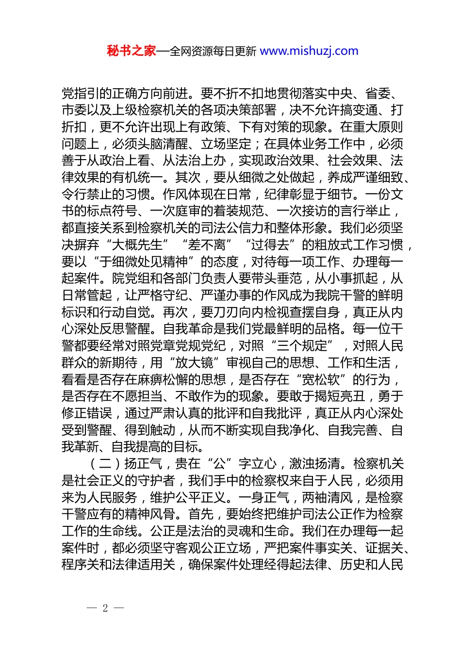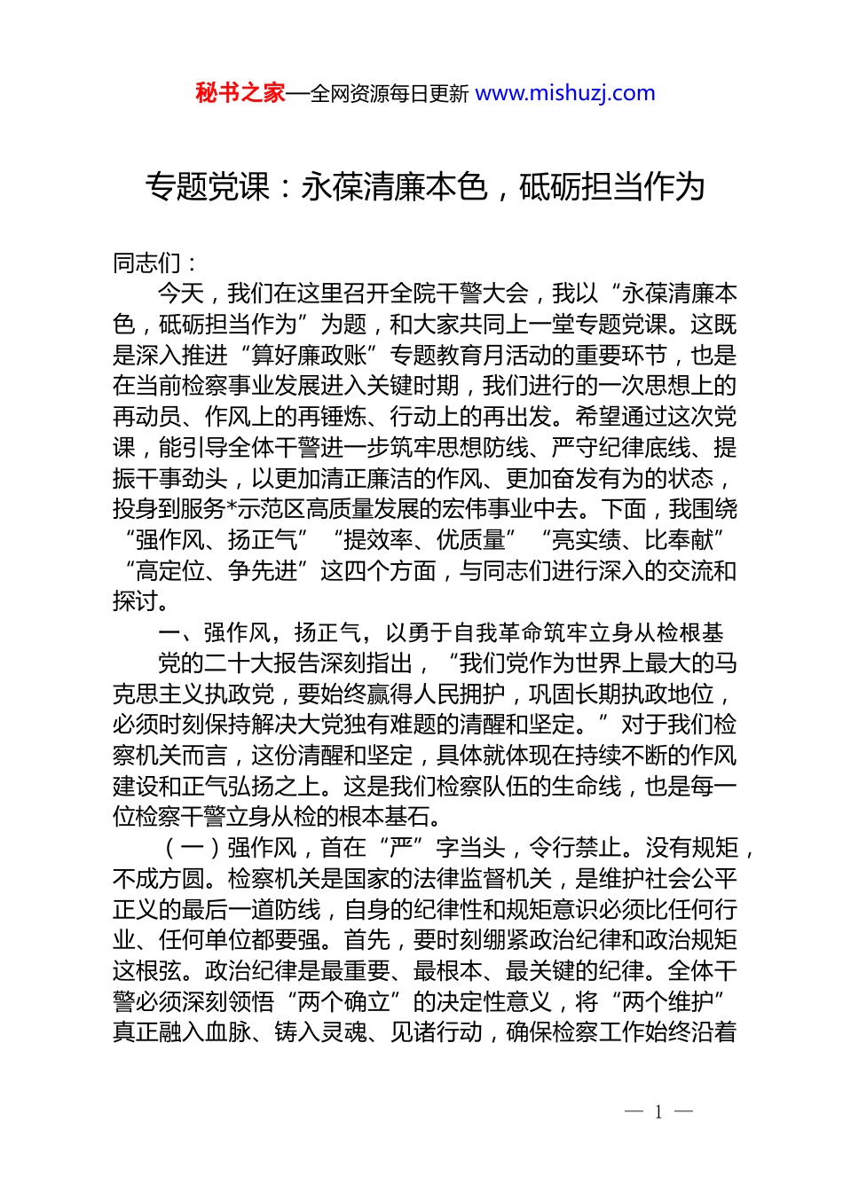 秘书之家—全网资源每日更新 www.mishuzj.com专题党课:永葆清廉本色,砥砺担当作为同志们:今天,我们在这里召开全院干警大会,我以“永葆清廉本色,砥砺担当作为”为题,和大家共同上一堂专题党课。这既是深入推进“算好廉政账”专题教育月活动的重要环节,也是在当前检察事业发展进入关键时期,我们进行的一次思想上的再动员、作风上的再锤炼、行动上的再出发。希望通过这次党课,能引导全体干警进一步筑牢思想防线、严守纪律底线、提振干事劲头,以更加清正廉洁的作风、更加奋发有为的状态,投身到服务*示范区高质量发展的宏伟事业中去。下面,我围绕“强作风、扬正气”“提效率、优质量”“亮实绩、比奉献”“高定位、争先进”这四个方面,与同志们进行深入的交流和探讨。一、强作风,扬正气,以勇于自我革命筑牢立身从检根基党的二十大报告深刻指出,“我们党作为世界上最大的马克思主义执政党,要始终赢得人民拥护,巩固长期执政地位,必须时刻保持解决大党独有难题的清醒和坚定。”对于我们检察机关而言,这份清醒和坚定,具体就体现在持续不断的作风建设和正气弘扬之上。这是我们检察队伍的生命线,也是每一位检察干警立身从检的根本基石。(一)强作风,首在“严”字当头,令行禁止。没有规矩,不成方圆。检察机关是国家的法律监督机关,是维护社会公平正义的最后一道防线,自身的纪律性和规矩意识必须比任何行业、任何单位都要强。首先,要时刻绷紧政治纪律和政治规矩这根弦。政治纪律是最重要、最根本、最关键的纪律。全体干警必须深刻领悟“两个确立”的决定性意义,将“两个维护”真正融入血脉、铸入灵魂、见诸行动,确保检察工作始终沿着— 1 —秘书之家—全网资源每日更新 www.mishuzj.com党指引的正确方向前进。要不折不扣地贯彻落实中央、省委、市委以及上级检察机关的各项决策部署,决不允许搞变通、打折扣,更不允许出现上有政策、下有对策的现象。在重大原则问题上,必须头脑清醒、立场坚定;在具体业务工作中,必须善于从政治上看、从法治上办,实现政治效果、社会效果、法律效果的有机统一。其次,要从细微之处做起,养成严谨细致、令行禁止的习惯。作风体现在日常,纪律彰显于细节。一份文书的标点符号、一次庭审的着装规范、一次接访的言行举止,都直接关系到检察机关的司法公信力和整体形象。我们必须坚决摒弃“大概先生”“差不离”“过得去”的粗放式工作习惯,要以“于细微处见精神”的态度,对待每一项工作、办理每一起案件。院党组和各部门负责人要带头垂范,从小事抓起,从日常管起,让严格守纪、严谨办事的作风成为我院干警的鲜明标识和行动自觉。再次,要刀刃向内检视查摆自身,真正从内心深处反思警醒。自我革命是我们党最鲜明的品格。每一位干警都要经常对照党章党规党纪,对照“三个规定”,对照人民群众的新期待,用“放大镜”审视自己的思想、工作和生活,看看是否存在麻痹松懈的思想,是否存在“宽松软”的行为,是否存在不愿担当、不敢作为的现象。要敢于揭短亮丑,勇于修正错误,通过严肃认真的批评和自我批评,真正从内心深处受到警醒、得到触动,从而不断实现自我净化、自我完善、自我革新、自我提高的目标。(二)扬正气,贵在“公”字立心,激浊扬清。检察机关是社会正义的守护者,我们手中的检察权来自于人民,必须用来为人民服务,维护公平正义。一身正气,两袖清风,是检察干警应有的精神风骨。首先,要始终把维护司法公正作为检察工作的生命线。公正是法治的灵魂和生命。我们在办理每一起案件时,都必须坚守客观公正立场,严把案件事实关、证据关、程序关和法律适用关,确保案件处理经得起法律、历史和人民— 2 —秘书之家—全网资源每日更新 www.mishuzj.com的检验。要坚决杜绝关系案、人情案、金钱案,坚决防止以权谋私、徇私枉法。在面对不法行为时,要敢于斗争、善于斗争,真正做到“法不能向不法让步”,让人民群众在每一个司法案件中都感受到公平正义。其次,要坚决杜绝选择性司法、随意司法。法律的生命力在于实施,法律的权威也在于实施。我们要坚持实体公正与程序公正并重,既要追求办案的法律效果,也要注重办...