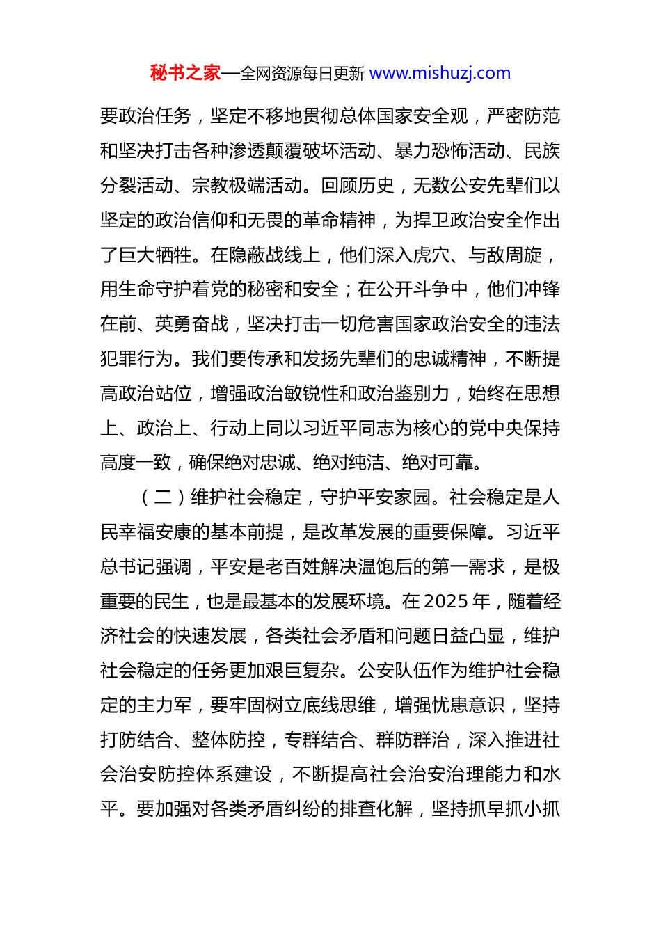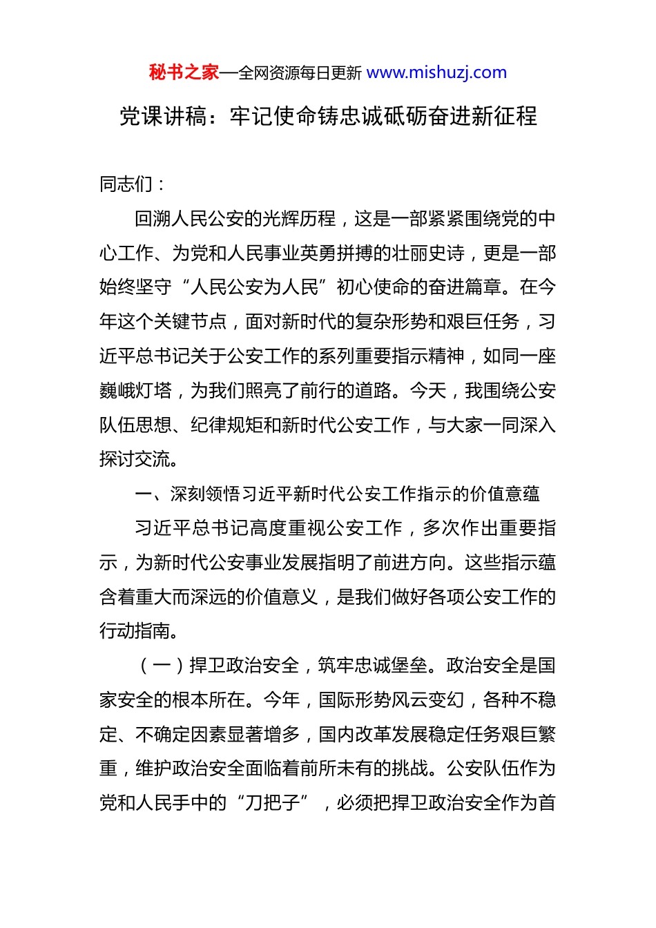 秘书之家—全网资源每日更新 www.mishuzj.com党课讲稿:牢记使命铸忠诚砥砺奋进新征程 同志们:回溯人民公安的光辉历程,这是一部紧紧围绕党的中心工作、为党和人民事业英勇拼搏的壮丽史诗,更是一部始终坚守“人民公安为人民”初心使命的奋进篇章。在今年这个关键节点,面对新时代的复杂形势和艰巨任务,习近平总书记关于公安工作的系列重要指示精神,如同一座巍峨灯塔,为我们照亮了前行的道路。今天,我围绕公安队伍思想、纪律规矩和新时代公安工作,与大家一同深入探讨交流。一、深刻领悟习近平新时代公安工作指示的价值意蕴习近平总书记高度重视公安工作,多次作出重要指示,为新时代公安事业发展指明了前进方向。这些指示蕴含着重大而深远的价值意义,是我们做好各项公安工作的行动指南。(一)捍卫政治安全,筑牢忠诚堡垒。政治安全是国家安全的根本所在。今年,国际形势风云变幻,各种不稳定、不确定因素显著增多,国内改革发展稳定任务艰巨繁重,维护政治安全面临着前所未有的挑战。公安队伍作为党和人民手中的“刀把子”,必须把捍卫政治安全作为首秘书之家—全网资源每日更新 www.mishuzj.com要政治任务,坚定不移地贯彻总体国家安全观,严密防范和坚决打击各种渗透颠覆破坏活动、暴力恐怖活动、民族分裂活动、宗教极端活动。回顾历史,无数公安先辈们以坚定的政治信仰和无畏的革命精神,为捍卫政治安全作出了巨大牺牲。在隐蔽战线上,他们深入虎穴、与敌周旋,用生命守护着党的秘密和安全;在公开斗争中,他们冲锋在前、英勇奋战,坚决打击一切危害国家政治安全的违法犯罪行为。我们要传承和发扬先辈们的忠诚精神,不断提高政治站位,增强政治敏锐性和政治鉴别力,始终在思想上、政治上、行动上同以习近平同志为核心的党中央保持高度一致,确保绝对忠诚、绝对纯洁、绝对可靠。(二)维护社会稳定,守护平安家园。社会稳定是人民幸福安康的基本前提,是改革发展的重要保障。习近平总书记强调,平安是老百姓解决温饱后的第一需求,是极重要的民生,也是最基本的发展环境。在 2025 年,随着经济社会的快速发展,各类社会矛盾和问题日益凸显,维护社会稳定的任务更加艰巨复杂。公安队伍作为维护社会稳定的主力军,要牢固树立底线思维,增强忧患意识,坚持打防结合、整体防控,专群结合、群防群治,深入推进社会治安防控体系建设,不断提高社会治安治理能力和水平。要加强对各类矛盾纠纷的排查化解,坚持抓早抓小抓秘书之家—全网资源每日更新 www.mishuzj.com苗头,努力将矛盾纠纷化解在基层、化解在萌芽状态。要严厉打击各类违法犯罪活动,始终保持对严重暴力犯罪、多发性侵财犯罪、新型网络犯罪等的严打高压态势,切实增强人民群众的安全感。(三)保障人民安宁,践行服务宗旨。人民公安为人民,这是公安工作的根本宗旨和出发点、落脚点。人民群众对美好生活的向往更加强烈,对公安工作提出了更高的要求和期待。我们要始终坚持以人民为中心的发展思想,把人民群众的安全感和满意度作为衡量公安工作的根本标准,不断改进工作作风,提高服务质量和水平,切实增强人民群众的获得感、幸福感、安全感。要紧密结合“我为群众办实事”实践活动,深入了解人民群众的所需所盼,积极回应人民群众的新要求新期待,着力解决人民群众反映强烈的突出问题。要深化公安“放管服”改革,进一步简化办事流程、提高办事效率,推出更多便民利民惠民举措,让人民群众办事更便捷、更高效。要加强与人民群众的沟通交流,广泛听取人民群众的意见和建议,不断改进工作方法和工作方式,赢得人民群众的理解、支持和信任。二、深入挖掘习近平新时代公安工作指示的丰富内涵习近平总书记关于新时代公安工作的重要指示,涵盖秘书之家—全网资源每日更新 www.mishuzj.com了公安工作的各个方面,蕴含着丰富的思想内涵和实践要求。我们要深入学习领会,准确把握其精神实质。(一)对党忠诚:公安队伍的政治灵魂。对党忠诚是公安队伍的建警之魂,是公安民警的根本政治品格。习近平总书记强调,公安队伍必须旗帜鲜明讲政治,坚持党对公安工作的绝对领导,坚持政治建警方针,增强“四个意识”、坚定“四...