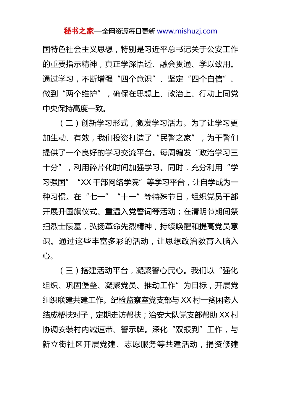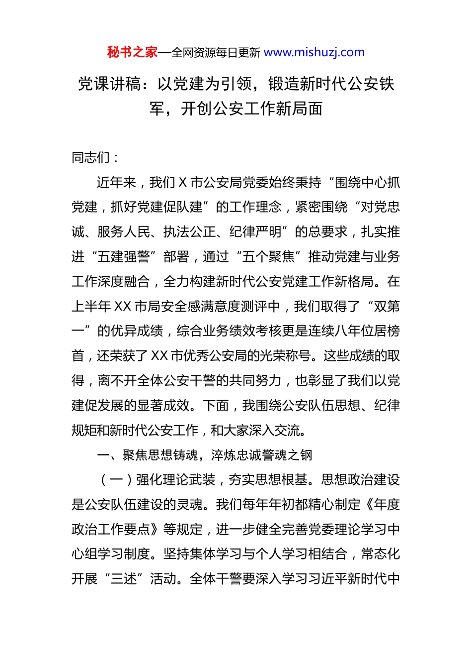 秘书之家—全网资源每日更新 www.mishuzj.com党课讲稿:以党建为引领,锻造新时代公安铁军,开创公安工作新局面 同志们:近年来,我们 X 市公安局党委始终秉持“围绕中心抓党建,抓好党建促队建”的工作理念,紧密围绕“对党忠诚、服务人民、执法公正、纪律严明”的总要求,扎实推进“五建强警”部署,通过“五个聚焦”推动党建与业务工作深度融合,全力构建新时代公安党建工作新格局。在上半年 XX 市局安全感满意度测评中,我们取得了“双第一”的优异成绩,综合业务绩效考核更是连续八年位居榜首,还荣获了 XX 市优秀公安局的光荣称号。这些成绩的取得,离不开全体公安干警的共同努力,也彰显了我们以党建促发展的显著成效。下面,我围绕公安队伍思想、纪律规矩和新时代公安工作,和大家深入交流。一、聚焦思想铸魂,淬炼忠诚警魂之钢(一)强化理论武装,夯实思想根基。思想政治建设是公安队伍建设的灵魂。我们每年年初都精心制定《年度政治工作要点》等规定,进一步健全完善党委理论学习中心组学习制度。坚持集体学习与个人学习相结合,常态化开展“三述”活动。全体干警要深入学习习近平新时代中秘书之家—全网资源每日更新 www.mishuzj.com国特色社会主义思想,特别是习近平总书记关于公安工作的重要指示精神,真正学深悟透、融会贯通、学以致用。通过学习,不断增强“四个意识”、坚定“四个自信”、做到“两个维护”,确保在思想上、政治上、行动上同党中央保持高度一致。(二)创新学习形式,激发学习活力。为了让学习更加生动、有效,我们投资打造了“民警之家”,为干警们提供了一个良好的学习交流平台。每周编发“政治学习三十分”,利用碎片化时间加强学习。同时,充分利用“学习强国”“XX 干部网络学院”等学习平台,让自学成为一种习惯。在“七一”“十一”等特殊节日,组织党员干部开展升国旗仪式、重温入党誓词等活动;在清明节期间祭扫烈士陵墓,弘扬革命先烈精神,持续唤醒和提高党员意识。通过这些丰富多彩的活动,让思想政治教育入脑入心。(三)搭建活动平台,凝聚警心民心。我们以“强化组织、巩固堡垒、凝聚党员、推动工作”为目标,开展党组织联建共建工作。纪检监察室党支部与 XX 村一贫困老人结成帮扶对子,定期走访帮扶;治安大队党支部帮助 XX 村协调安装村内减速带、警示牌。深化“双报到”工作,与新立街社区开展党建、志愿服务等共建活动,捐资修建秘书之家—全网资源每日更新 www.mishuzj.com“党建广场”,派员积极参与社区疫情防控。通过这些活动,不仅帮助群众解决了实际困难,也进一步增强了警民关系,让我们的队伍更加紧密地与人民群众联系在一起。二、聚焦组织强基,筑牢党建战斗堡垒(一)优化组织体系,提升工作效能。组织建设是党建工作的基础。我们理顺了机关党组织管理体制,推动机关党建工作责任有力有效落实。按照规定成立了局机关委员会、机关纪委,将老干部党支部调整成为党总支,将党员数量多的支部划分不同数量的党小组,进一步优化理顺了工作体系。通过这些举措,确保党组织的各项工作能够高效运转,为公安工作提供坚强的组织保障。(二)规范组织工作,严格党内生活。我们依托“灯塔—党建”平台,进一步强化党建基础工作,对局属基层党组织人员及组织关系实行动态管理。认真做好“XX—党建为民在线”党建考核工作,以网上积分考核推动线下业务工作。严格规范党内政治生活,进一步健全完善民主生活会、组织生活会等制度,每月制定下发党建工作计划,指导各党总支(支部)开展党内政治活动,使党建工作有章可循。通过规范组织工作,确保党组织的凝聚力和战斗力不断提升。(三)选优配强干部,加强督察考核。我们牢固树立秘书之家—全网资源每日更新 www.mishuzj.com“党的一切工作到支部”的鲜明导向,切实选好用好干部,匡正选人用人风气。及时对党总支、支部班子成员进行调整换届,配齐配强班子特别是带头人,组织基础得到巩固和加强。党委选派 X 名业务精干、政治素质过硬的副科级领导干部担任党建指导员,协助党委参与指导、督导各党(总支)支部组织生活会、主题党日+活动、发展党员等工作,有效提升...