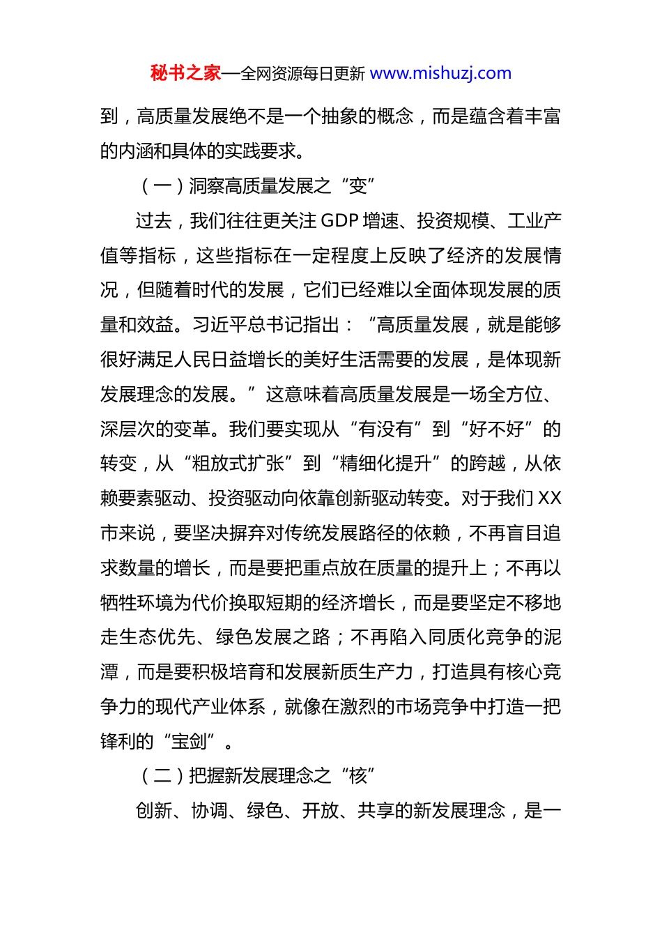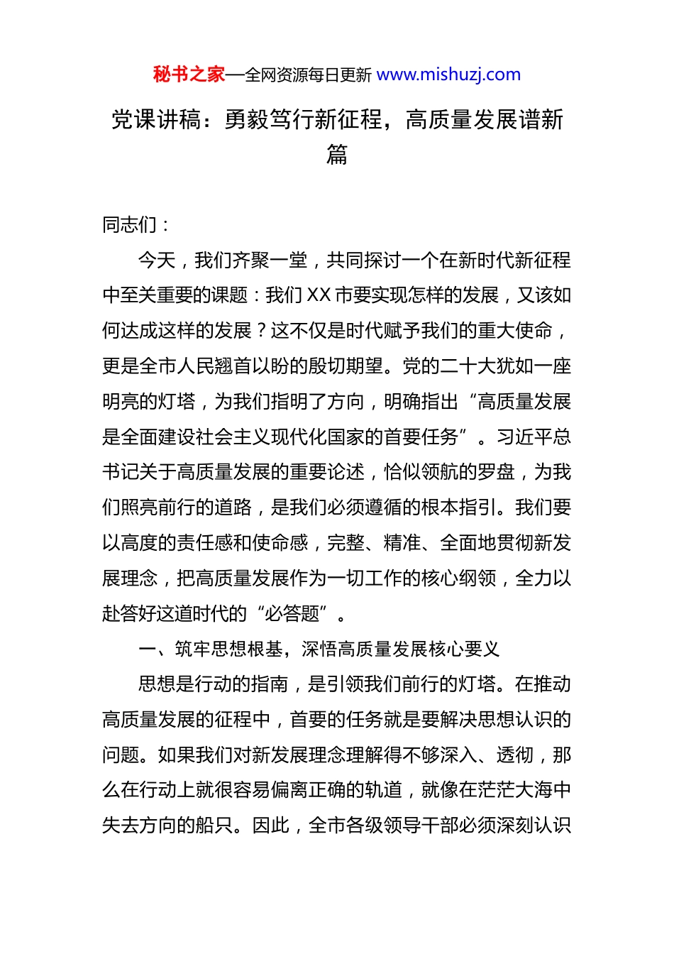 秘书之家—全网资源每日更新 www.mishuzj.com党课讲稿:勇毅笃行新征程,高质量发展谱新篇 同志们:今天,我们齐聚一堂,共同探讨一个在新时代新征程中至关重要的课题:我们 XX 市要实现怎样的发展,又该如何达成这样的发展?这不仅是时代赋予我们的重大使命,更是全市人民翘首以盼的殷切期望。党的二十大犹如一座明亮的灯塔,为我们指明了方向,明确指出“高质量发展是全面建设社会主义现代化国家的首要任务”。习近平总书记关于高质量发展的重要论述,恰似领航的罗盘,为我们照亮前行的道路,是我们必须遵循的根本指引。我们要以高度的责任感和使命感,完整、精准、全面地贯彻新发展理念,把高质量发展作为一切工作的核心纲领,全力以赴答好这道时代的“必答题”。一、筑牢思想根基,深悟高质量发展核心要义思想是行动的指南,是引领我们前行的灯塔。在推动高质量发展的征程中,首要的任务就是要解决思想认识的问题。如果我们对新发展理念理解得不够深入、透彻,那么在行动上就很容易偏离正确的轨道,就像在茫茫大海中失去方向的船只。因此,全市各级领导干部必须深刻认识秘书之家—全网资源每日更新 www.mishuzj.com到,高质量发展绝不是一个抽象的概念,而是蕴含着丰富的内涵和具体的实践要求。(一)洞察高质量发展之“变”过去,我们往往更关注 GDP 增速、投资规模、工业产值等指标,这些指标在一定程度上反映了经济的发展情况,但随着时代的发展,它们已经难以全面体现发展的质量和效益。习近平总书记指出:“高质量发展,就是能够很好满足人民日益增长的美好生活需要的发展,是体现新发展理念的发展。”这意味着高质量发展是一场全方位、深层次的变革。我们要实现从“有没有”到“好不好”的转变,从“粗放式扩张”到“精细化提升”的跨越,从依赖要素驱动、投资驱动向依靠创新驱动转变。对于我们 XX市来说,要坚决摒弃对传统发展路径的依赖,不再盲目追求数量的增长,而是要把重点放在质量的提升上;不再以牺牲环境为代价换取短期的经济增长,而是要坚定不移地走生态优先、绿色发展之路;不再陷入同质化竞争的泥潭,而是要积极培育和发展新质生产力,打造具有核心竞争力的现代产业体系,就像在激烈的市场竞争中打造一把锋利的“宝剑”。(二)把握新发展理念之“核”创新、协调、绿色、开放、共享的新发展理念,是一秘书之家—全网资源每日更新 www.mishuzj.com个紧密相连、相互依存的有机整体,它们共同解答了关于发展的目的、动力、方式、路径等一系列重大的理论和实践问题。创新是推动发展的第一动力,它就像发动机一样,为发展注入源源不断的活力,解决发展动力不足的问题;协调是发展的内在要求,如同人体的各个器官需要协调运作一样,解决发展不平衡的问题;绿色是发展的普遍形态,是我们实现可持续发展的必然选择,解决人与自然和谐共生的问题;开放是发展的必由之路,就像打开窗户让新鲜空气进来一样,解决发展内外联动的问题;共享是发展的根本目的,体现了社会主义的本质要求,解决社会公平正义的问题。这五大理念相辅相成、缺一不可,我们必须全面、系统地贯彻落实,不能片面地强调某一个方面而忽视其他方面。例如,在推动产业转型升级的过程中,我们既要大力发展战略性新兴产业和未来产业,抢占科技发展的制高点,又要运用新技术改造提升传统产业,实现“老树发新芽”;在推进城乡建设中,既要打造现代化的城市风貌,又要注重保留城市的历史文化底蕴和乡村的田园风光,实现城乡协调发展;在招商引资中,既要积极引进外部的资金、技术和人才,又要严格坚守环保和安全底线,实现高质量的“引进来”。(三)坚守高质量发展之“本”秘书之家—全网资源每日更新 www.mishuzj.com发展的根本目的在于人民。习近平总书记反复强调:“人民对美好生活的向往,就是我们的奋斗目标。”高质量发展的出发点和落脚点就是要不断提升人民群众的获得感、幸福感和安全感。我们制定的每一项改革措施、出台的每一项政策、推进的每一个项目,都要以人民的需求为导向,以人民的满意度为标准。检验发展成效的最终标准,不是看报表上的数字有多么华丽,而是要看老百姓的生活...