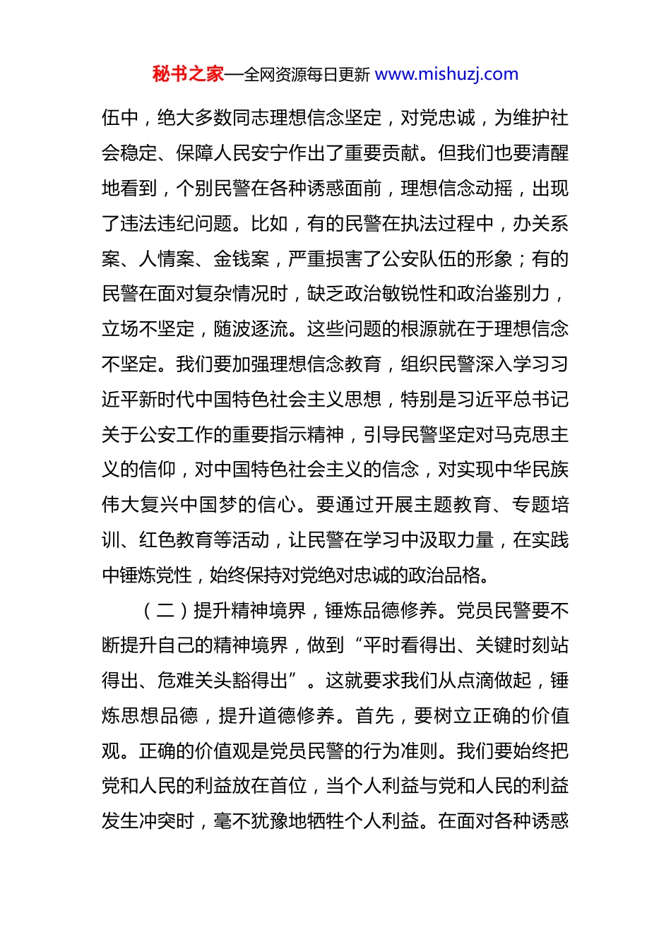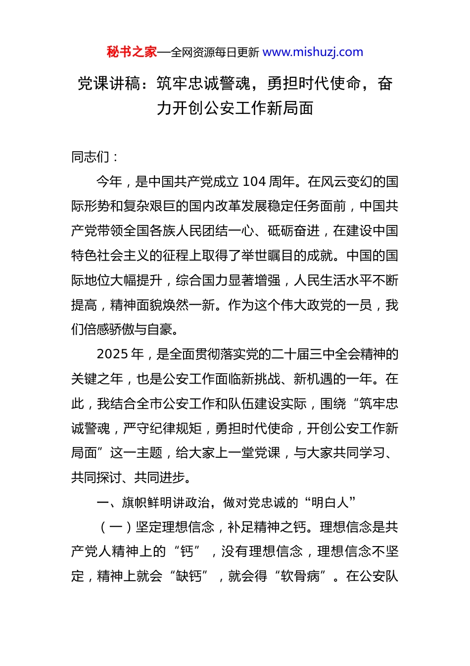 秘书之家—全网资源每日更新 www.mishuzj.com党课讲稿:筑牢忠诚警魂,勇担时代使命,奋力开创公安工作新局面 同志们:今年,是中国共产党成立 104 周年。在风云变幻的国际形势和复杂艰巨的国内改革发展稳定任务面前,中国共产党带领全国各族人民团结一心、砥砺奋进,在建设中国特色社会主义的征程上取得了举世瞩目的成就。中国的国际地位大幅提升,综合国力显著增强,人民生活水平不断提高,精神面貌焕然一新。作为这个伟大政党的一员,我们倍感骄傲与自豪。2025 年,是全面贯彻落实党的二十届三中全会精神的关键之年,也是公安工作面临新挑战、新机遇的一年。在此,我结合全市公安工作和队伍建设实际,围绕“筑牢忠诚警魂,严守纪律规矩,勇担时代使命,开创公安工作新局面”这一主题,给大家上一堂党课,与大家共同学习、共同探讨、共同进步。一、旗帜鲜明讲政治,做对党忠诚的“明白人”(一)坚定理想信念,补足精神之钙。理想信念是共产党人精神上的“钙”,没有理想信念,理想信念不坚定,精神上就会“缺钙”,就会得“软骨病”。在公安队秘书之家—全网资源每日更新 www.mishuzj.com伍中,绝大多数同志理想信念坚定,对党忠诚,为维护社会稳定、保障人民安宁作出了重要贡献。但我们也要清醒地看到,个别民警在各种诱惑面前,理想信念动摇,出现了违法违纪问题。比如,有的民警在执法过程中,办关系案、人情案、金钱案,严重损害了公安队伍的形象;有的民警在面对复杂情况时,缺乏政治敏锐性和政治鉴别力,立场不坚定,随波逐流。这些问题的根源就在于理想信念不坚定。我们要加强理想信念教育,组织民警深入学习习近平新时代中国特色社会主义思想,特别是习近平总书记关于公安工作的重要指示精神,引导民警坚定对马克思主义的信仰,对中国特色社会主义的信念,对实现中华民族伟大复兴中国梦的信心。要通过开展主题教育、专题培训、红色教育等活动,让民警在学习中汲取力量,在实践中锤炼党性,始终保持对党绝对忠诚的政治品格。(二)提升精神境界,锤炼品德修养。党员民警要不断提升自己的精神境界,做到“平时看得出、关键时刻站得出、危难关头豁得出”。这就要求我们从点滴做起,锤炼思想品德,提升道德修养。首先,要树立正确的价值观。正确的价值观是党员民警的行为准则。我们要始终把党和人民的利益放在首位,当个人利益与党和人民的利益发生冲突时,毫不犹豫地牺牲个人利益。在面对各种诱惑秘书之家—全网资源每日更新 www.mishuzj.com时,要保持清醒的头脑,坚守道德底线,不被金钱、权力、美色所诱惑。其次,要加强党内生活锻炼。积极参加党内组织生活,认真开展批评与自我批评,不断提高自身的政治素质和党性修养。要严格遵守党的纪律和规矩,自觉接受党组织的监督和管理。最后,要做践行社会公德、职业道德、家庭美德的模范。在社会上,要遵守社会公德,爱护公共环境,维护社会秩序;在工作中,要遵守职业道德,做到爱岗敬业、公正执法、服务群众;在家庭中,要遵守家庭美德,做到尊老爱幼、夫妻和睦、勤俭持家。(三)保持良好作风,树立良好形象。作风建设永远在路上。良好的作风是公安队伍的生命线,是赢得人民群众信任和支持的关键。我们要坚决反对形式主义、官僚主义,树立真抓实干、勇于担当的工作作风。要深入基层、深入群众,了解群众的需求和疾苦,为群众办实事、解难题。要严格依法办事,公正执法,文明执法,坚决杜绝执法不公、执法不严等问题。要加强廉洁自律,严格遵守廉洁从政的各项规定,做到清正廉洁、不徇私情。在当前开展的“下基层、解民忧、办实事、促发展”活动中,全体党员民警要积极响应,身体力行,切实为群众解决实际问题。要把群众的满意度作为衡量工作成效的标准,不断提秘书之家—全网资源每日更新 www.mishuzj.com高公安工作的质量和水平。二、勤于学习练内功,做本领过硬的“实干家”(一)适应时代发展,增强学习紧迫感。当今时代,科技进步日新月异,社会发展一日千里。公安工作面临着前所未有的挑战和机遇。我们要适应时代发展的要求,增强学习的紧迫感和责任感。随着互联网、大数据、人工智能等新技术的广泛应用,犯...