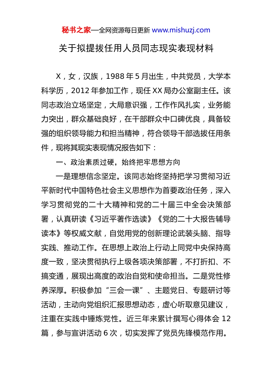 秘书之家—全网资源每日更新 www.mishuzj.com关于拟提拔任用人员同志现实表现材料 X,女,汉族,1988 年 5 月出生,中共党员,大学本科学历,2012 年参加工作,现任 XX 局办公室副主任。该同志政治立场坚定,大局意识强,工作作风扎实,业务能力突出,群众基础良好,在干部群众中口碑优良,具备较强的组织领导能力和担当精神,符合领导干部选拔任用条件,现将其现实表现情况报告如下:一、政治素质过硬,始终把牢思想方向一是理想信念坚定。该同志始终坚持把学习贯彻习近平新时代中国特色社会主义思想作为首要政治任务,深入学习贯彻党的二十大精神和党的二十届三中全会决策部署,认真研读《习近平著作选读》《党的二十大报告辅导读本》等权威文献,自觉用党的创新理论武装头脑、指导实践、推动工作。在思想上政治上行动上同党中央保持高度一致,坚决贯彻执行上级各项决策部署,不打折扣、不搞变通,展现出高度的政治自觉和使命担当。二是党性修养深厚。积极参加“三会一课”、主题党日、专题研讨等活动,主动向党组织汇报思想动态,虚心听取意见建议,注重在实践中锤炼党性。近三年来累计撰写心得体会 12篇,参与宣讲活动 6 次,切实发挥了党员先锋模范作用。秘书之家—全网资源每日更新 www.mishuzj.com三是大局观念强。能够自觉站在全局高度思考问题、谋划工作,善于从政治角度分析形势、把握政策,对中央关于全面深化改革、推进国家治理体系和治理能力现代化的战略部署理解深刻、落实有力。在涉及机构调整、人事变动等敏感事项中,始终保持清醒头脑,做到服从安排、顾全大局,体现了良好的政治定力和组织纪律性。二、履职能力突出,展现卓越综合素养一是统筹协调能力强。作为办公室副主任,牵头负责文稿起草、会议组织、督办落实、信息报送等多项重点工作,年均牵头完成综合性报告、讲话稿等重要材料 40 余篇,内容质量高、逻辑严密、语言规范,多次获领导肯定。特别是在筹备全市系统工作会议期间,统筹协调 12 个科室、3 个区县单位,高质量完成方案制定、议程安排、材料汇编等工作,确保会议圆满顺利召开。二是文字功底扎实。长期从事政策研究与公文写作,熟悉各类文体格式要求,善于提炼核心观点、凝练工作亮点。其撰写的《关于推进基层治理数字化转型的调研报告》被市委办公厅采纳并转发至各区县学习参考;《加强新时代机关作风建设的意见建议》获分管领导批示并在全局推广实施。三是业务精通高效。深耕行政管理领域十余年,对政策法规、制度流程掌握全面,处理复杂事务沉着冷静、条理清晰。在推秘书之家—全网资源每日更新 www.mishuzj.com进“放管服”改革过程中,牵头梳理行政审批事项清单,提出优化流程建议 17 项,推动实现“一网通办”事项占比提升至 92%,群众办事满意度达 97.6%。四是应急处突果断有力。面对突发舆情或重大突发事件,能够迅速响应、精准研判、妥善处置。2025 年 6 月某区因政策解读偏差引发群众聚集事件,该同志第一时间赶赴现场,协助制定回应口径,组织媒体发布权威信息,有效化解矛盾风险,赢得广泛好评。三、工作作风务实,树立良好公仆形象一是坚持求真务实。工作中重实际、讲实话、办实事、求实效,坚决反对形式主义、官僚主义。在开展专项督查时,坚持深入一线查实情、听真话,全年累计实地走访企业、社区、村居 30 余次,形成调研报告 5 份,提出的“简化申报材料”“设立便民服务专窗”等建议均被采纳并落地见效。二是密切联系群众。始终把群众利益放在首位,主动倾听基层呼声,帮助解决实际困难。三季度以来共接待来访群众 23 人次,协调解决就业帮扶、子女入学、社保补缴等问题 11 件,群众回访满意率达 100%。有群众评价:“她不是来‘走过场’的,是真的想帮我们解决问题。”三是甘于奉献担当。常年加班加点完成急难险重任务,从未计较个人得失。每逢重大节庆、重要会议保障期秘书之家—全网资源每日更新 www.mishuzj.com间,总是主动请缨、坚守岗位,连续多日奋战在一线,展现了强烈的责任感和使命感。四、廉洁自律严格,筑牢拒腐防变防线一是严守纪律规矩。认真贯彻落实纪律规定,严格执行公务...