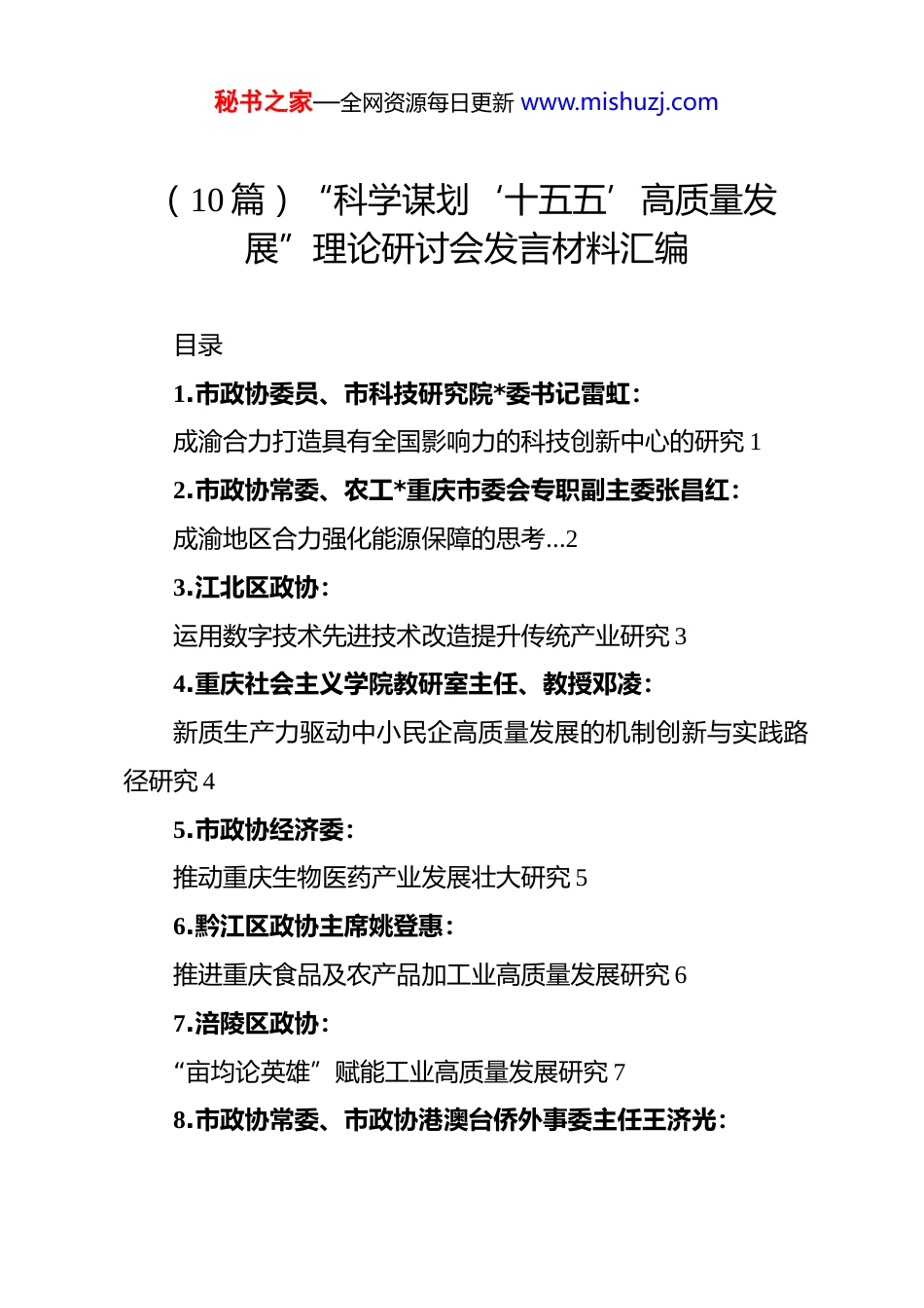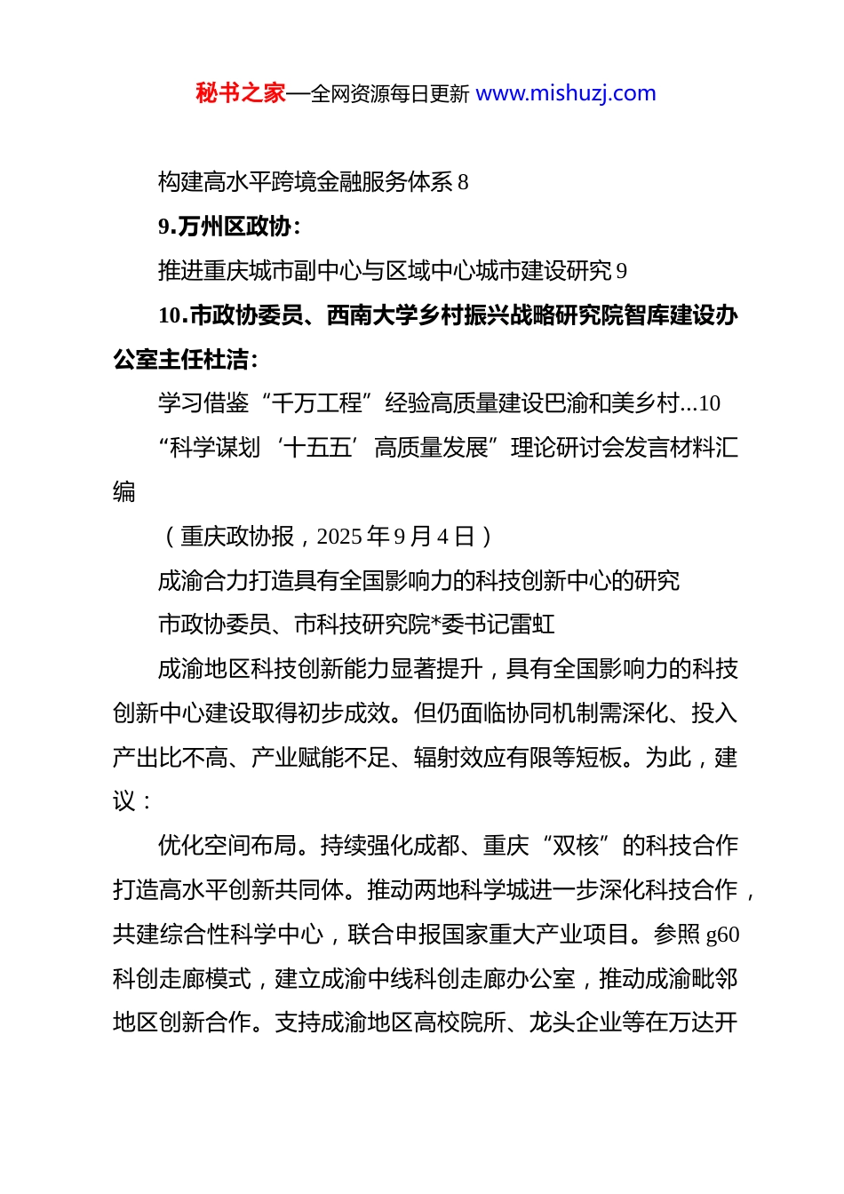 秘书之家—全网资源每日更新 www.mishuzj.com(10 篇)“科学谋划‘十五五’高质量发展”理论研讨会发言材料汇编目录1.市政协委员、市科技研究院*委书记雷虹:成渝合力打造具有全国影响力的科技创新中心的研究 12.市政协常委、农工*重庆市委会专职副主委张昌红:成渝地区合力强化能源保障的思考…23.江北区政协:运用数字技术先进技术改造提升传统产业研究 34.重庆社会主义学院教研室主任、教授邓凌:新质生产力驱动中小民企高质量发展的机制创新与实践路径研究 45.市政协经济委:推动重庆生物医药产业发展壮大研究 56.黔江区政协主席姚登惠:推进重庆食品及农产品加工业高质量发展研究 67.涪陵区政协:“亩均论英雄”赋能工业高质量发展研究 78.市政协常委、市政协港澳台侨外事委主任王济光:秘书之家—全网资源每日更新 www.mishuzj.com构建高水平跨境金融服务体系 89.万州区政协:推进重庆城市副中心与区域中心城市建设研究 910.市政协委员、西南大学乡村振兴战略研究院智库建设办公室主任杜洁:学习借鉴“千万工程”经验高质量建设巴渝和美乡村…10“科学谋划‘十五五’高质量发展”理论研讨会发言材料汇编(重庆政协报,2025 年 9 月 4 日)成渝合力打造具有全国影响力的科技创新中心的研究市政协委员、市科技研究院*委书记雷虹成渝地区科技创新能力显著提升,具有全国影响力的科技创新中心建设取得初步成效。但仍面临协同机制需深化、投入产出比不高、产业赋能不足、辐射效应有限等短板。为此,建议:优化空间布局。持续强化成都、重庆“双核”的科技合作打造高水平创新共同体。推动两地科学城进一步深化科技合作,共建综合性科学中心,联合申报国家重大产业项目。参照 g60科创走廊模式,建立成渝中线科创走廊办公室,推动成渝毗邻地区创新合作。支持成渝地区高校院所、龙头企业等在万达开秘书之家—全网资源每日更新 www.mishuzj.com等川渝毗邻地区设立分支机构,高水平布局建设联合实验室。推动跨区域创新创业孵化。突破关键技术。联合承接载人航天、核能技术等国家任务建设国家级创新策源地。建设干细胞、遗传资源等科技资源国家级备份基地。协同做强装备制造等万亿级产业集群,前瞻布局新材料、无人机和通航技术战略性新兴产业。加速成果转化。加快构建成渝统一的科技大市场,探索成渝技术要素市场化改革。推行成渝中线科创走廊“算力券”,共建概念验证中心,推动成果快转平台在成渝地区应用。合力建设先进制造业集聚区。打造成渝氢走廊、电走廊、智行走廊等应用场景。构建“研发—转化—产业”闭环,打造世界级智能网联新能源汽车产业集群。强化区域辐射。建设“一带一路”科技创新合作区和国际技术转移中心。加强与“一带一路”国家的交流合作。建设西部陆海新通道科技合作网络。构建“科技赋能+资源互补”的跨域协同范式,将物流通道建设成为科技资源流动的高速路。强化与西南其他省域的科技创新联动。推进与贵州、云南、广西等省区多元合作,打造创新共同体。成渝地区合力强化能源保障的思考市政协常委、农工*重庆市委会专职副主委张昌红秘书之家—全网资源每日更新 www.mishuzj.com近年来,成渝地区逐步成为天然气页岩气重要产储运枢纽川气东送、西电东送汇集外输区,同时重庆也是我国西部的制造业重镇,还要为产业的不断发展提供能源保障。但成渝地区在合力强化能源保障方面仍存在政策规划待支持、统筹协调待加强、设施建设待提升、链条建设待畅通等问题。为此,建议:聚焦节点定位支持,争取国家政策和项目支持。一是明确具体功能定位。争取纳入国家“十五五”能源发展规划,明确其作为国家能源安全保障重要节点的功能定位。二是争取先行先试。三是争取设立国家机构和平台。聚焦区域协作共建,推动强化统筹协调。一是强化区域协同政策。推动成渝地区能源规划一体化,建立跨区域能源协同机制,推动区域能源市场互联,签订能源互助协议,实现能源资源优化配置。二是推动能源与产业深度耦合。争取建设国家级新能源装备制造基地,打造成渝综合能源智慧走廊,加强两地在能源领域的合作。三是完善政策支持与保障机制。聚焦基础设施建设,谋划布局相...