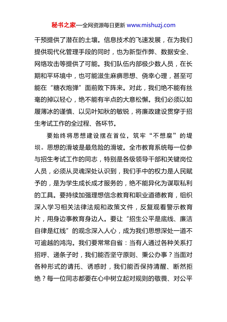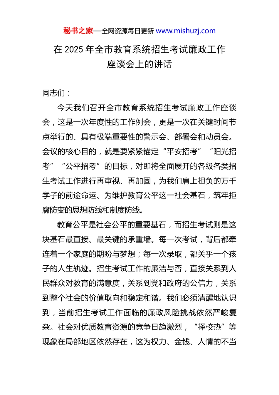 秘书之家—全网资源每日更新 www.mishuzj.com在 2025 年全市教育系统招生考试廉政工作座谈会上的讲话 同志们:今天我们召开全市教育系统招生考试廉政工作座谈会,这是一次年度性的工作例会,更是一次在关键时间节点举行的、具有极端重要性的警示会、部署会和动员会。会议的核心目的,就是要紧紧锚定“平安招考”“阳光招考”“公平招考”的目标,对即将全面展开的各级各类招生考试工作进行再审视、再加固,为我们肩上担负的万千学子的前途命运、为维护教育公平这一社会基石,筑牢拒腐防变的思想防线和制度防线。教育公平是社会公平的重要基石,而招生考试则是这块基石最直接、最关键的承重墙。每一次考试,背后都牵连着一个家庭的期盼与梦想;每一次录取,都关乎一个孩子的人生轨迹。招生考试工作的廉洁与否,直接关系到人民群众对教育的满意度,关系到党和政府的公信力,关系到整个社会的价值取向和稳定和谐。我们必须清醒地认识到,当前招生考试工作面临的廉政风险挑战依然严峻复杂。社会对优质教育资源的竞争日趋激烈,“择校热”等现象在局部地区依然存在,这为权力、金钱、人情的不当秘书之家—全网资源每日更新 www.mishuzj.com干预提供了潜在的土壤。信息技术的飞速发展,在为我们提供现代化管理手段的同时,也为新型作弊、数据安全、网络攻击等提供了可能。我们队伍内部极少数人员,在长期和平环境中,也可能滋生麻痹思想、侥幸心理,甚至可能在“糖衣炮弹”面前败下阵来。对此,我们绝不能有丝毫的掉以轻心,绝不能有半点的大意松懈。我们必须以如履薄冰的谨慎、以见叶知秋的敏锐,将廉政建设贯穿于招生考试工作的全过程、各环节。要始终将思想建设摆在首位,筑牢“不想腐”的堤坝。思想的滑坡是最危险的滑坡。全市教育系统每一位参与招生考试工作的同志,特别是各级领导干部和关键岗位人员,必须从灵魂深处认识到,我们手中的权力是人民赋予的,是为学生成长成才服务的,绝不能异化为谋取私利的工具。要持续加强理想信念教育和职业道德教育,组织深入学习相关法律法规和政策文件,反复观看警示教育片,用身边事教育身边人。要让“招生公平是底线、廉洁自律是红线”的观念深入人心,成为我们思想深处一道不可逾越的鸿沟。我们要常常自省:当有人通过各种关系打招呼、递条子时,我们能否坚守原则、秉公办事?当面对各种形式的请托、诱惑时,我们能否保持清醒、断然拒绝?每一位同志都要在心中树立起对规则的敬畏、对公平秘书之家—全网资源每日更新 www.mishuzj.com的信仰,将维护招生考试的公正廉洁,内化为一种职业本能和价值追求。各级党组织要切实履行好主体责任,主要负责人要承担起第一责任人的职责,常态化开展谈心谈话,及时掌握干部思想动态,做好思想引导和心理疏导,确保我们的队伍在思想上纯洁、在政治上坚定。要着力织密制度的笼子,扎紧“不能腐”的藩篱。制度带有根本性、全局性、稳定性和长期性。依靠个人的觉悟是必要的,但更可靠的是严密有效的制度体系。我们要对现有的招生考试制度进行全面的梳理和评估,查找存在的漏洞和短板。重点要在以下几个方面持续发力:一是要进一步优化考试组织流程。从命题、制卷、运送、保管到施考、评卷、核分,每一个环节都要有明确的标准、严格的程序和清晰的权责。要大力推行标准化考点建设,全面使用人脸识别、无线信号屏蔽等技防手段,严防内部操作空间和外部作弊风险。二是要进一步完善招生录取规则。阳光是最好的防腐剂。要坚定不移地深化“阳光招生”政策,招生政策、招生计划、录取程序、录取结果等信息,只要不涉及国家秘密和个人隐私的,都必须第一时间、毫无保留地向社会公开,主动接受全社会的监督。要积极探索利用大数据、区块链等技术,对招生录取过程进行全流程记录和监控,实现可追溯、可查询,让任何违规操作都秘书之家—全网资源每日更新 www.mishuzj.com无处遁形。三是要进一步健全权力运行的制约机制。对招生考试工作中的关键岗位,要实行定期轮岗制度,避免形成“独立王国”和利益固化。要严格实行回避制度,凡是与考生有亲属关系或其他利害关系的人员,一律不得参与其考试、评卷、录取等相关...