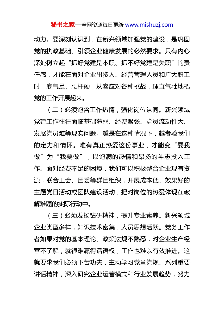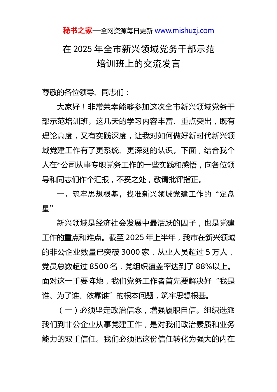 秘书之家—全网资源每日更新 www.mishuzj.com在 2025 年全市新兴领域党务干部示范培训班上的交流发言 尊敬的各位领导、同志们:大家好!非常荣幸能够参加这次全市新兴领域党务干部示范培训班。这几天的学习内容丰富、重点突出,既有理论高度,又有实践深度,让我对如何做好新时代新兴领域党建工作有了更系统、更深刻的认识。下面,结合我个人在*公司从事专职党务工作的一些实践和感悟,向各位领导和同志们作个汇报,不妥之处,敬请批评指正。一、筑牢思想根基,找准新兴领域党建工作的“定盘星”新兴领域是经济社会发展中最活跃的因子,也是党建工作的重点和难点。截至 2025 年上半年,我市在新兴领域的非公企业数量已突破 3000 家,从业人员超过 5 万人,党员总数超过 8500 名,党组织覆盖率达到了 88%以上。面对这一重要阵地,我们党务工作者首先要解决好“我是谁、为了谁、依靠谁”的根本问题,筑牢思想根基。(一)必须坚定政治信念,增强履职自信。组织选派我们到非公企业从事党建工作,是对我们政治素质和业务能力的双重信任。我们必须把这份信任转化为强大的内在秘书之家—全网资源每日更新 www.mishuzj.com动力。要深刻认识到,在新兴领域加强党的建设,是巩固党的执政基础、引领企业健康发展的必然要求。只有内心深处树立起“抓好党建是本职、抓不好党建是失职”的责任感,才能在面对企业出资人、经营管理人员和广大职工时,底气足、腰杆硬,从容应对各种挑战,理直气壮地把党的工作开展起来。(二)必须饱含工作热情,强化岗位认同。新兴领域党建工作往往面临基础薄弱、经费紧张、党员流动性大、发展党员难等现实问题。越是在这种情况下,越考验我们的定力和情怀。唯有真正热爱这份事业,才能变“要我做”为“我要做”,以饱满的热情和昂扬的斗志投入工作。面对经费不足的困境,我们可以积极整合企业现有资源,联合工会、团委等群团组织,开展成本低、效果好的主题党日活动或团队建设活动,把对岗位的热爱体现在破解难题的实际行动中。(三)必须发扬钻研精神,提升专业素养。新兴领域企业类型多样,知识技术密集,人员思想活跃。党务工作者如果对党的基本理论、政策法规不熟悉,对企业生产经营不了解,就很难赢得话语权,工作也难以有效推进。这就要求我们必须下苦功夫,主动学习党章党规、系列重要讲话精神,深入研究企业运营模式和行业发展趋势,努力秘书之家—全网资源每日更新 www.mishuzj.com从党建“门外汉”变成“内行人”,做到既懂党务又懂业务,成为推动党建工作与企业发展同频共振的复合型人才。二、把握关键环节,打好党建与业务融合的“组合拳”做好新兴领域党建工作,关键在于找准党建工作与企业发展的结合点,推动二者深度融合、互促共进。这需要我们用好沟通协调的艺术,打好精准施策的“组合拳”。(一)强化政治引领,争取最大支持。在非公企业开展党建工作,绝不能搞行政命令,更不能与企业经营“两张皮”。核心在于赢得企业出资人和管理层的理解与支持。这就需要我们拿出“滴水穿石”的韧劲,主动、反复地与企业负责人沟通。要善于算大账、算长远账,用鲜活的案例和翔实的数据,向他们阐明党建工作在塑造企业文化、凝聚员工人心、激发创新活力、提升品牌形象等方面的独特价值,让他们真正认识到“党建做实了就是生产力,做强了就是竞争力,做细了就是凝聚力”。通过真诚有效的沟通,把企业负责人转化为党建工作的支持者、参与者,为工作开展创造良好条件。(二)创新方式方法,打造特色品牌。新兴领域党建工作不能满足于“建起来”,更要追求“强起来”“活起秘书之家—全网资源每日更新 www.mishuzj.com来”。我们必须用心谋划,结合企业特点和党员需求,创新活动载体。在互联网企业,可以开展“红色键盘侠”行动,组织党员在网络空间弘扬主旋律、传播正能量;在科技研发型企业,可以设立“党员技术攻关小组”,围绕企业技术瓶颈开展项目攻坚,把党员先锋模范作用体现在推动技术创新的第一线;在文化创意企业,可以打造“红色创意工坊”,将党建元素融入产品设计与品牌故事,实现党建价值与商业价值的有机统一。(三)坚持以身作...