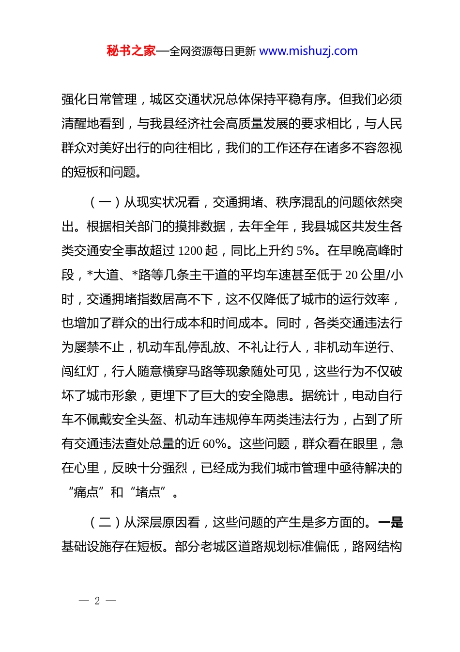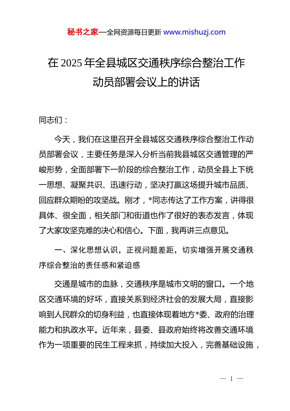 秘书之家—全网资源每日更新 www.mishuzj.com在 2025 年全县城区交通秩序综合整治工作动员部署会议上的讲话同志们:今天,我们在这里召开全县城区交通秩序综合整治工作动员部署会议,主要任务是深入分析当前我县城区交通管理的严峻形势,全面部署下一阶段的综合整治工作,动员全县上下统一思想、凝聚共识、迅速行动,坚决打赢这场提升城市品质、回应群众期盼的攻坚战。刚才,*同志传达了工作方案,讲得很具体、很全面,相关部门和街道也作了很好的表态发言,体现了大家攻坚克难的决心和信心。下面,我再讲三点意见。一、深化思想认识,正视问题差距,切实增强开展交通秩序综合整治的责任感和紧迫感交通是城市的血脉,交通秩序是城市文明的窗口。一个地区交通环境的好坏,直接关系到经济社会的发展大局,直接影响到人民群众的切身利益,也直接体现着地方*委、政府的治理能力和执政水平。近年来,县委、县政府始终将改善交通环境作为一项重要的民生工程来抓,持续加大投入,完善基础设施,— 1 —秘书之家—全网资源每日更新 www.mishuzj.com强化日常管理,城区交通状况总体保持平稳有序。但我们必须清醒地看到,与我县经济社会高质量发展的要求相比,与人民群众对美好出行的向往相比,我们的工作还存在诸多不容忽视的短板和问题。(一)从现实状况看,交通拥堵、秩序混乱的问题依然突出。根据相关部门的摸排数据,去年全年,我县城区共发生各类交通安全事故超过 1200 起,同比上升约 5%。在早晚高峰时段,*大道、*路等几条主干道的平均车速甚至低于 20 公里/小时,交通拥堵指数居高不下,这不仅降低了城市的运行效率,也增加了群众的出行成本和时间成本。同时,各类交通违法行为屡禁不止,机动车乱停乱放、不礼让行人,非机动车逆行、闯红灯,行人随意横穿马路等现象随处可见,这些行为不仅破坏了城市形象,更埋下了巨大的安全隐患。据统计,电动自行车不佩戴安全头盔、机动车违规停车两类违法行为,占到了所有交通违法查处总量的近 60%。这些问题,群众看在眼里,急在心里,反映十分强烈,已经成为我们城市管理中亟待解决的“痛点”和“堵点”。(二)从深层原因看,这些问题的产生是多方面的。一是基础设施存在短板。部分老城区道路规划标准偏低,路网结构— 2 —秘书之家—全网资源每日更新 www.mishuzj.com不尽合理,“断头路”现象依然存在;公共停车位供给严重不足,全县城区停车位缺口高达 40%以上,导致“停车难、停车乱”问题愈演愈烈;部分路段的交通信号灯、隔离护栏、标志标线等设施老化、缺失或设置不科学,无法适应当前日益增长的交通流量需求。二是管理执法存在薄弱环节。多部门联合执法的协同机制尚不健全,存在“各吹各的号、各唱各的调”现象,未能形成齐抓共管的强大合力。部分执法工作存在时紧时松、标准不一的问题,常态化、长效化的管理机制尚未完全建立,导致整治效果容易反弹。三是文明交通意识有待提升。部分市民的交通安全意识和法治观念淡薄,“人情大于法规”的错误思想依然存在,文明出行尚未成为全体市民的自觉行动和行为习惯,宣传教育的深度和广度仍需加强。(三)从影响层面看,交通秩序问题带来的负面影响不容小觑。交通拥堵和秩序混乱,严重制约了我县经济的进一步发展。外地客商来我县考察时,因交通不畅而对投资环境产生质疑,影响了招商引资工作的推进。在旅游旺季,混乱的交通秩序也给游客带来了极差的体验,不利于我县旅游产业的持续发展。同时,对于居民日常生活而言,频繁的交通事故和拥堵状况,让居民在出行时提心吊胆,增加了心理压力。而且,因交— 3 —秘书之家—全网资源每日更新 www.mishuzj.com通问题导致的医疗救援、消防救援等紧急任务延误的情况也时有发生,给人民群众的生命财产安全带来了严重威胁。这些问题若不加以解决,将会对我县的长远发展造成难以估量的损失。同志们,交通问题表现在路上,根子在思想上、在管理上在责任上。开展此次城区交通秩序综合整治,绝非一时兴起,更不是权宜之计。这是推动我县高质量发展的迫切需要。一个安全、畅通、有序的交通环境是优化营商环境、吸引投资、集聚人才的重...