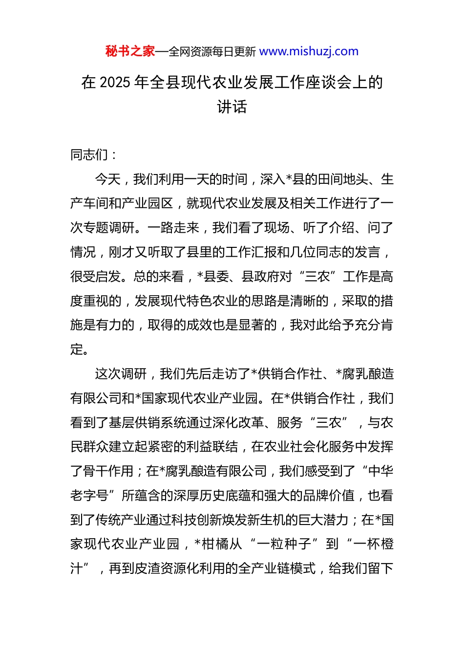 秘书之家—全网资源每日更新 www.mishuzj.com在 2025 年全县现代农业发展工作座谈会上的讲话 同志们:今天,我们利用一天的时间,深入*县的田间地头、生产车间和产业园区,就现代农业发展及相关工作进行了一次专题调研。一路走来,我们看了现场、听了介绍、问了情况,刚才又听取了县里的工作汇报和几位同志的发言,很受启发。总的来看,*县委、县政府对“三农”工作是高度重视的,发展现代特色农业的思路是清晰的,采取的措施是有力的,取得的成效也是显著的,我对此给予充分肯定。这次调研,我们先后走访了*供销合作社、*腐乳酿造有限公司和*国家现代农业产业园。在*供销合作社,我们看到了基层供销系统通过深化改革、服务“三农”,与农民群众建立起紧密的利益联结,在农业社会化服务中发挥了骨干作用;在*腐乳酿造有限公司,我们感受到了“中华老字号”所蕴含的深厚历史底蕴和强大的品牌价值,也看到了传统产业通过科技创新焕发新生机的巨大潜力;在*国家现代农业产业园,*柑橘从“一粒种子”到“一杯橙汁”,再到皮渣资源化利用的全产业链模式,给我们留下秘书之家—全网资源每日更新 www.mishuzj.com了深刻印象,这充分展示了*县在产业集群发展和新质生产力培育上的远见卓识和扎实成效。这些亮点,是*县近年来大力推进农业现代化、促进乡村全面振兴的生动缩影。可以说,*县立足资源禀赋、发挥比较优势,走出了一条具有自身特色的农业高质量发展之路。借此机会,我代表*市政府,向辛勤工作在全县“三农”战线的广大干部群众,致以诚挚的问候!下面,结合今天的调研情况和大家的发言,我再讲三点意见。一、肯定成绩,总结经验,坚定推动现代农业高质量发展的信心和决心近年来,*县坚决贯彻落实习近平总书记关于“三农”工作的重要论述和视察*市时的重要讲话精神,认真落实市委、市政府的决策部署,牢牢把握高质量发展这一根本要求,在推动传统农业向现代农业转型升级的道路上,取得了令人瞩目的成绩。一是产业体系建设实现了新突破。*县最为亮眼的成绩,就是成功构建了以柑橘为主导的现代农业产业体系。特别是*国家现代农业产业园,总投资达到 20 亿元,规划科学、布局合理,集柑橘分拣、精深加工、交易集散、冷链物流于一体,真正打通了产业链、提升了价值链、完善了利益链。产业园全面建成达产后,预计可实现年产值 50秘书之家—全网资源每日更新 www.mishuzj.com亿元,提供就业岗位超过 1000 个,带动上万农民增收致富。这种“接二连三”的全产业链发展模式,不仅提升了农业的整体效益和竞争力,也为我们全市的现代农业产业园建设树立了标杆、提供了样板。二是品牌培育和市场开拓取得了新成效。农产品“种得好”,更要“卖得好”,品牌是关键。*县在这方面下了很大功夫。*豆腐乳这块“中华老字号”金字招牌,通过严控产品质量、加大科技创新、强化品牌宣传,市场影响力不断扩大,成为*县农产品加工业的一张靓丽名片。这启示我们,挖掘和传承好地方特色农产品的历史文化价值,并与现代市场营销手段相结合,是提升农产品附加值、拓宽市场的有效路径。三是为农服务体系改革迈出了新步伐。农业现代化的过程,也是农业社会化服务体系不断健全的过程。*县持续深化基层供销社改革,推动其回归为农服务的根本宗旨,这一点在*供销合作社得到了充分体现。通过完善服务机制,拓展服务领域,强化与农民的利益联结,供销社在农资供应、技术推广、产品销售等方面发挥了不可替代的作用,有效帮助农户节本增效,破解了“谁来种地、怎么种好地”的部分难题。这种模式,对于构建新型农业经营体系、发展多种形式的适度规模经营具有重要的探索意义。秘书之家—全网资源每日更新 www.mishuzj.com这些成绩的取得,是*县委、县政府团结带领全县人民锐意进取、扎实工作的结果。在肯定成绩的同时,我们更要善于总结经验,把这些行之有效的做法固化下来、坚持下去,并不断发扬光大,从而进一步坚定我们走好现代特色农业发展之路的信心与决心。二、认清形势,抢抓机遇,准确把握新发展阶段现代农业的使命和要求当前,我们正处在全面推进乡村振兴、加快建设农业强国的关键时期。“三农”工作...