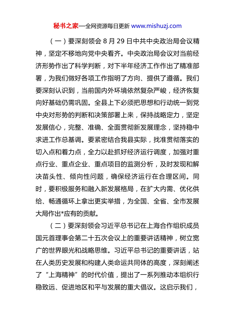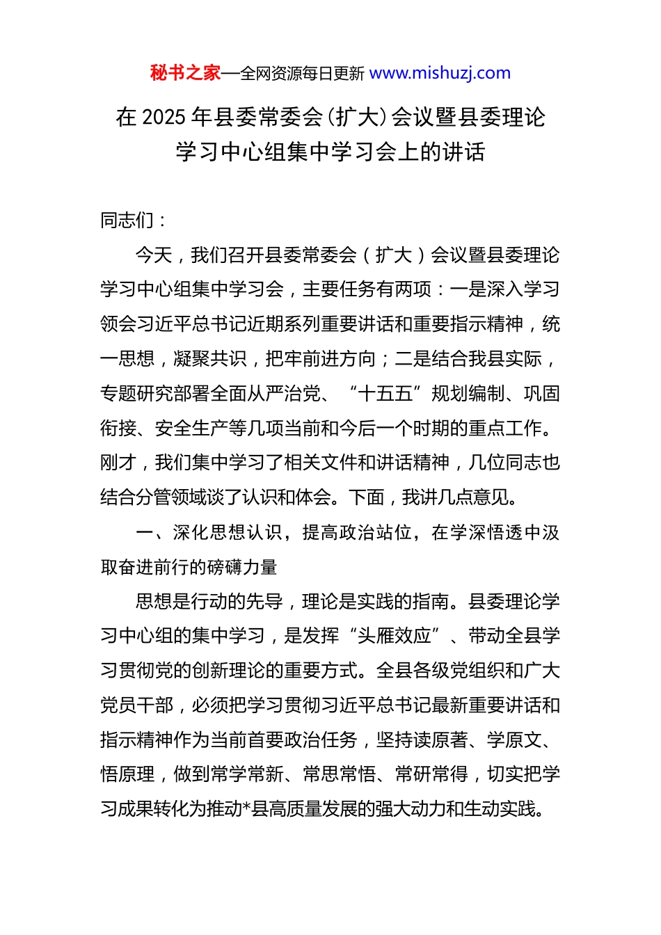 秘书之家—全网资源每日更新 www.mishuzj.com在 2025 年县委常委会(扩大)会议暨县委理论学习中心组集中学习会上的讲话 同志们:今天,我们召开县委常委会(扩大)会议暨县委理论学习中心组集中学习会,主要任务有两项:一是深入学习领会习近平总书记近期系列重要讲话和重要指示精神,统一思想,凝聚共识,把牢前进方向;二是结合我县实际,专题研究部署全面从严治党、“十五五”规划编制、巩固衔接、安全生产等几项当前和今后一个时期的重点工作。刚才,我们集中学习了相关文件和讲话精神,几位同志也结合分管领域谈了认识和体会。下面,我讲几点意见。一、深化思想认识,提高政治站位,在学深悟透中汲取奋进前行的磅礴力量思想是行动的先导,理论是实践的指南。县委理论学习中心组的集中学习,是发挥“头雁效应”、带动全县学习贯彻党的创新理论的重要方式。全县各级党组织和广大党员干部,必须把学习贯彻习近平总书记最新重要讲话和指示精神作为当前首要政治任务,坚持读原著、学原文、悟原理,做到常学常新、常思常悟、常研常得,切实把学习成果转化为推动*县高质量发展的强大动力和生动实践。秘书之家—全网资源每日更新 www.mishuzj.com(一)要深刻领会 8 月 29 日中共中央政治局会议精神,坚定不移地向党中央看齐。中央政治局会议对当前经济形势作出了科学判断,对下半年经济工作作出了精准部署,为我们做好各项工作指明了方向、提供了遵循。我们要深刻认识到,当前国内外环境依然复杂严峻,经济恢复向好基础仍需巩固。全县上下必须把思想和行动统一到党中央对形势的判断和决策部署上来,保持战略定力,坚定发展信心,完整、准确、全面贯彻新发展理念,坚持稳中求进工作总基调。要紧密结合我县实际,找准贯彻落实的切入点和着力点,全力以赴抓好经济运行调度,加强对重点行业、重点企业、重点项目的监测分析,及时发现和解决苗头性、倾向性问题,确保经济运行在合理区间。同时,要积极服务和融入新发展格局,在扩大内需、优化供给、畅通循环上拿出更实举措,为全国、全省、全市发展大局作出*应有的贡献。(二)要深刻领会习近平总书记在上海合作组织成员国元首理事会第二十五次会议上的重要讲话精神,树立宽广的世界眼光和战略思维。习近平总书记的重要讲话,站在人类历史发展和构建人类命运共同体的高度,深刻阐述了“上海精神”的时代价值,提出了一系列推动本组织行稳致远、促进地区和平与发展的重大倡议。这启示我们,秘书之家—全网资源每日更新 www.mishuzj.com无论是谋划一个地区的发展,还是处理复杂的内外关系,都必须胸怀“国之大者”,具备宽广的国际视野。我们要教育引导全县干部群众,深刻理解坚持对外开放、推动合作共赢的重大意义。在具体工作中,要积极抢抓国家对外开放战略机遇,优化营商环境,主动承接产业转移,吸引更多优质资本、技术和人才汇聚*。同时,也要增强风险意识和底线思维,有效防范化解各类风险挑战,为*的发展营造安全稳定的外部环境。(三)要深刻领会习近平总书记在纪念中国人民抗日战争暨世界反法西斯战争胜利 80 周年大会上的重要讲话精神,大力弘扬伟大抗战精神。历史是最好的教科书,也是最好的清醒剂。80 年前那场伟大的胜利,是中华民族由衰败走向复兴的重大转折点。*县是一片具有光荣革命传统的红色热土,无数革命先辈在这里抛头颅、洒热血,留下了宝贵的精神财富。我们有责任、有义务把这些红色资源保护好、管理好、运用好。宣传部门、党史研究部门要牵头,系统梳理我县的红色家底,深入挖掘革命文物和遗址遗迹背后的感人故事和历史内涵。要创新宣传宣讲方式,通过编撰红色书籍、制作专题片、组织巡回报告等形式,把红色故事讲得更生动、更深入人心。要把红色教育纳入干部教育培训的必修课,融入中小学思想政治教育的全过秘书之家—全网资源每日更新 www.mishuzj.com程,引导全县人民特别是青少年,从伟大抗战精神中汲取信仰的力量,不断增强对伟大祖国、中华民族、中华文化、中国共产党、中国特色社会主义的认同,筑牢全县人民团结奋斗的共同思想基础,坚定不移听党话、跟党走。二、坚持自我革命,从严管党治党,...