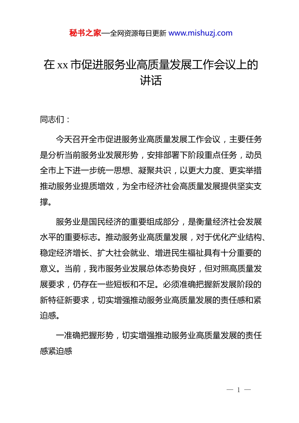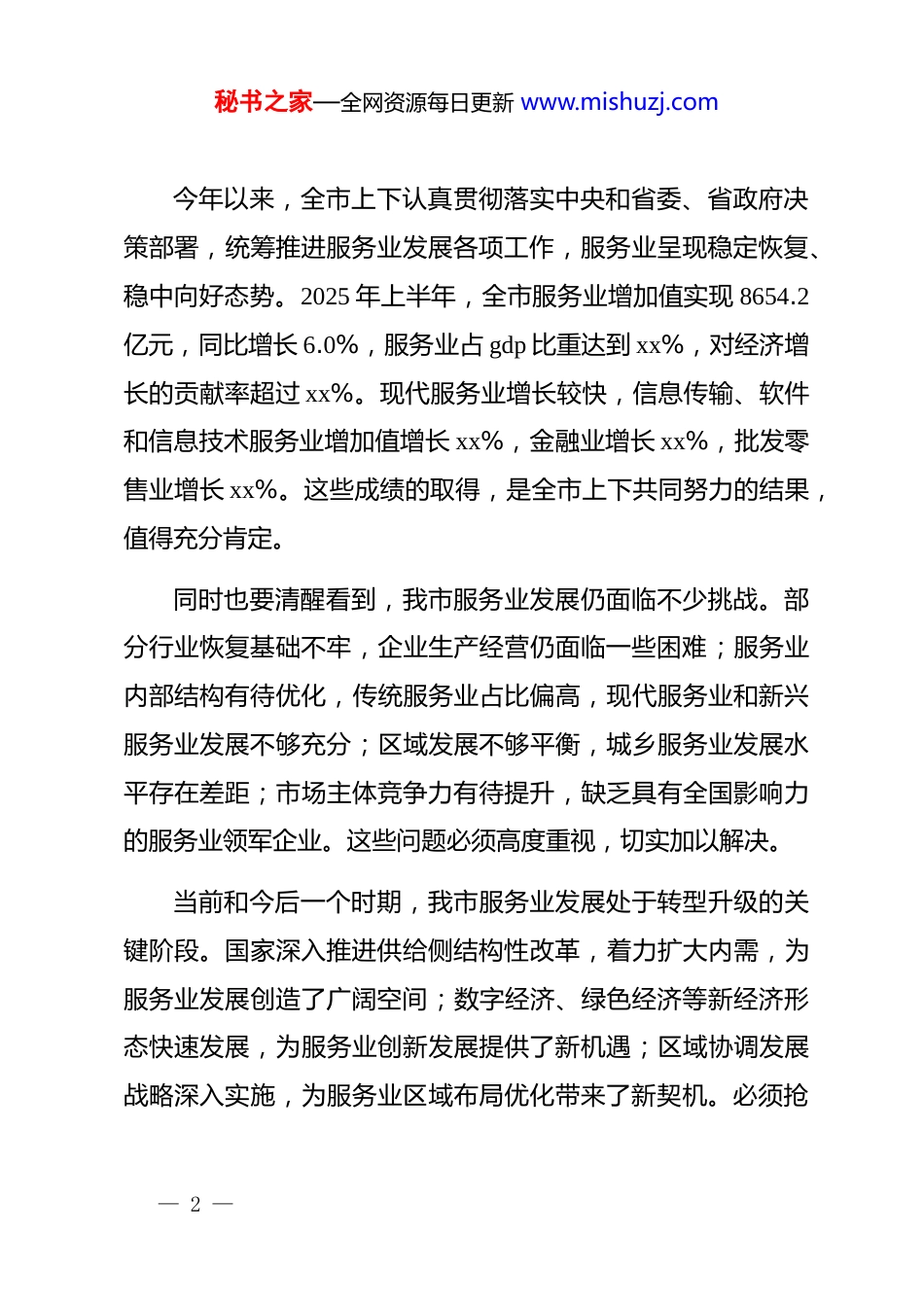 秘书之家—全网资源每日更新 www.mishuzj.com在 xx 市促进服务业高质量发展工作会议上的讲话同志们:今天召开全市促进服务业高质量发展工作会议,主要任务是分析当前服务业发展形势,安排部署下阶段重点任务,动员全市上下进一步统一思想、凝聚共识,以更大力度、更实举措推动服务业提质增效,为全市经济社会高质量发展提供坚实支撑。服务业是国民经济的重要组成部分,是衡量经济社会发展水平的重要标志。推动服务业高质量发展,对于优化产业结构、稳定经济增长、扩大社会就业、增进民生福祉具有十分重要的意义。当前,我市服务业发展总体态势良好,但对照高质量发展要求,仍存在一些短板和不足。必须准确把握新发展阶段的新特征新要求,切实增强推动服务业高质量发展的责任感和紧迫感。一准确把握形势,切实增强推动服务业高质量发展的责任感紧迫感— 1 —秘书之家—全网资源每日更新 www.mishuzj.com今年以来,全市上下认真贯彻落实中央和省委、省政府决策部署,统筹推进服务业发展各项工作,服务业呈现稳定恢复、稳中向好态势。2025 年上半年,全市服务业增加值实现 8654.2亿元,同比增长 6.0%,服务业占 gdp 比重达到 xx%,对经济增长的贡献率超过 xx%。现代服务业增长较快,信息传输、软件和信息技术服务业增加值增长 xx%,金融业增长 xx%,批发零售业增长 xx%。这些成绩的取得,是全市上下共同努力的结果,值得充分肯定。同时也要清醒看到,我市服务业发展仍面临不少挑战。部分行业恢复基础不牢,企业生产经营仍面临一些困难;服务业内部结构有待优化,传统服务业占比偏高,现代服务业和新兴服务业发展不够充分;区域发展不够平衡,城乡服务业发展水平存在差距;市场主体竞争力有待提升,缺乏具有全国影响力的服务业领军企业。这些问题必须高度重视,切实加以解决。当前和今后一个时期,我市服务业发展处于转型升级的关键阶段。国家深入推进供给侧结构性改革,着力扩大内需,为服务业发展创造了广阔空间;数字经济、绿色经济等新经济形态快速发展,为服务业创新发展提供了新机遇;区域协调发展战略深入实施,为服务业区域布局优化带来了新契机。必须抢— 2 —秘书之家—全网资源每日更新 www.mishuzj.com抓机遇、乘势而上,推动服务业发展迈上新台阶。二聚焦重点环节,扎实做好服务业入库纳统工作入库纳统工作是反映服务业发展成效的“晴雨表”,是*委政府科学决策的重要依据。做好入库纳统工作,对于全面准确反映服务业发展状况、精准实施宏观调控、推动服务业高质量发展具有重要意义。当前我市服务业入库纳统工作还存在一些薄弱环节。部分企业对入库纳统认识不足,申报积极性不高;个别部门重视不够,工作推进力度有待加强;纳统数据质量需要进一步提升。必须坚持问题导向,采取有力措施,切实抓紧抓实入库纳统工作。要明确入库标准和要求。严格执行国家统计制度规定,准确把握规模以上服务业、限额以上批发零售业和住宿餐饮业、资质以内建筑业、房地产开发经营业等行业的入库标准。加强对企业的宣传引导,提高企业对入库纳统工作重要性的认识,增强申报主动性。要全面摸排梳理。各行业主管部门要深入一线,对本行业企业进行全面排查,建立准达标企业清单,做到底数清、情况— 3 —秘书之家—全网资源每日更新 www.mishuzj.com明。对已达到入库标准的企业,要督促指导其及时申报入库;对接近达标的企业,要加强培育扶持,帮助其尽快达标入库。要提高数据质量。坚持依法统计、科学统计,确保数据真实准确、完整及时。加强统计人员业务培训,提高专业能力和水平。健全数据质量管控机制,加强对数据的审核评估,防止漏报、错报、虚报、瞒报等现象发生。要强化部门协作。建立健全统计部门与行业主管部门的协作机制,形成工作合力。发改、商务、文旅、交通、住建、金融等部门要各负其责,共同做好相关行业企业的入库纳统工作。完善信息共享机制,提高工作效率。三坚持多措并举,着力提升服务业发展质效推动服务业高质量发展,必须坚持扩大总量与提升质量并重,优化结构与转型升级并举,采取更加精准有效的措施,促进服务业发展提速、比重提高、水平提升。...