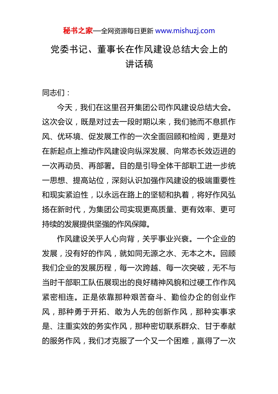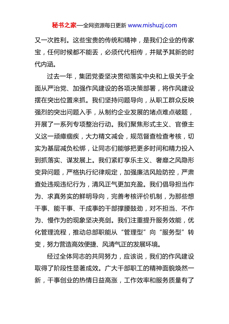 秘书之家—全网资源每日更新 www.mishuzj.com党委书记、董事长在作风建设总结大会上的讲话稿 同志们:今天,我们在这里召开集团公司作风建设总结大会。这次会议,既是对过去一段时期以来,我们驰而不息抓作风、优环境、促发展工作的一次全面回顾和检阅,更是对在新起点上推动作风建设向纵深发展、向常态长效迈进的一次再动员、再部署。目的是引导全体干部职工进一步统一思想、提高站位,深刻认识加强作风建设的极端重要性和现实紧迫性,以永远在路上的坚韧和执着,将好作风弘扬在新时代,为集团公司实现更高质量、更有效率、更可持续的发展提供坚强的作风保障。作风建设关乎人心向背,关乎事业兴衰。一个企业的发展,没有好的作风,就如同无源之水、无本之木。回顾我们企业的发展历程,每一次跨越、每一次突破,无不与当时干部职工队伍展现出的良好精神风貌和过硬工作作风紧密相连。正是依靠那种艰苦奋斗、勤俭办企的创业作风,那种勇于开拓、敢为人先的创新作风,那种实事求是、注重实效的务实作风,那种密切联系群众、甘于奉献的服务作风,我们才克服了一个又一个困难,赢得了一次秘书之家—全网资源每日更新 www.mishuzj.com又一次胜利。这些宝贵的传统和精神,是我们企业的传家宝,任何时候都不能丢,必须代代相传,并赋予其新的时代内涵。过去一年,集团党委坚决贯彻落实中央和上级关于全面从严治党、加强作风建设的各项决策部署,将作风建设摆在突出位置来抓。我们坚持问题导向,从职工群众反映强烈的突出问题入手,从制约企业发展的堵点难点破题,开展了一系列专项整治行动。我们聚焦形式主义、官僚主义这一顽瘴痼疾,大力精文减会,规范督查检查考核,切实为基层减负松绑,让同志们能够把更多时间和精力投入到抓落实、谋发展上。我们紧盯享乐主义、奢靡之风隐形变异问题,严格执行纪律规定,加强廉洁风险防控,严肃查处违规违纪行为,清风正气更加充盈。我们倡导担当作为、求真务实的鲜明导向,完善考核评价机制,为那些想干事、能干事、干成事的干部撑腰鼓劲,对不担当、不作为、慢作为的现象坚决亮剑。我们注重提升服务效能,优化管理流程,推动总部职能从“管理型”向“服务型”转变,努力营造高效便捷、风清气正的发展环境。经过全体同志的共同努力,应该说,我们的作风建设取得了阶段性显著成效。广大干部职工的精神面貌焕然一新,干事创业的热情日益高涨,工作效率和服务质量有了秘书之家—全网资源每日更新 www.mishuzj.com明显提升,企业内部的凝聚力、向心力、战斗力进一步增强。这些变化,体现在我们主要经营指标的稳步增长上,体现在重点项目建设的加快推进上,体现在科技创新成果的不断涌现上,更体现在基层单位和职工群众满意度、获得感的切实提升上。对此,职工群众是认可的,上级组织是肯定的。在此,我代表集团党委,向为作风建设付出辛勤努力的全体干部职工,表示衷心的感谢!在肯定成绩的同时,我们更要保持清醒的头脑,绝不能有松口气、歇歇脚的想法。作风建设永远在路上,一些深层次问题具有顽固性和反复性,不可能一蹴而就、一劳永逸。我们必须清醒地看到,与新时代新任务的要求相比,与职工群众的期盼相比,我们的作风建设仍然存在一些不容忽视的问题和差距。比如,形式主义、官僚主义在某些方面、某些环节依然存在,有时还改头换面、潜入地下。有的工作满足于“开了会、发了文”,但在抓落实的“最后一公里”上力度不够、效果不彰;有的干部习惯于坐在办公室听汇报、看材料,深入基层一线调研解决实际问题的次数不多、深度不够;有的部门在制定政策、部署任务时,未能充分考虑基层实际,存在“一刀切”现象,增加了执行难度。再比如,担当精神不足、斗争本领不强的问题依然存在。面秘书之家—全网资源每日更新 www.mishuzj.com对改革发展中的硬骨头,有的同志存在畏难情绪,缺乏攻坚克难的锐气和勇气,“等靠要”思想仍未根除;面对市场竞争的严峻挑战,有的同志创新意识不强,习惯于按部就班、墨守成规,敢闯敢试、敢为人先的劲头有所减弱。还比如,服务意识、工作效率仍有提升空间。个别窗口单位、服务岗位还存在“门好进、脸好看、事难办”...