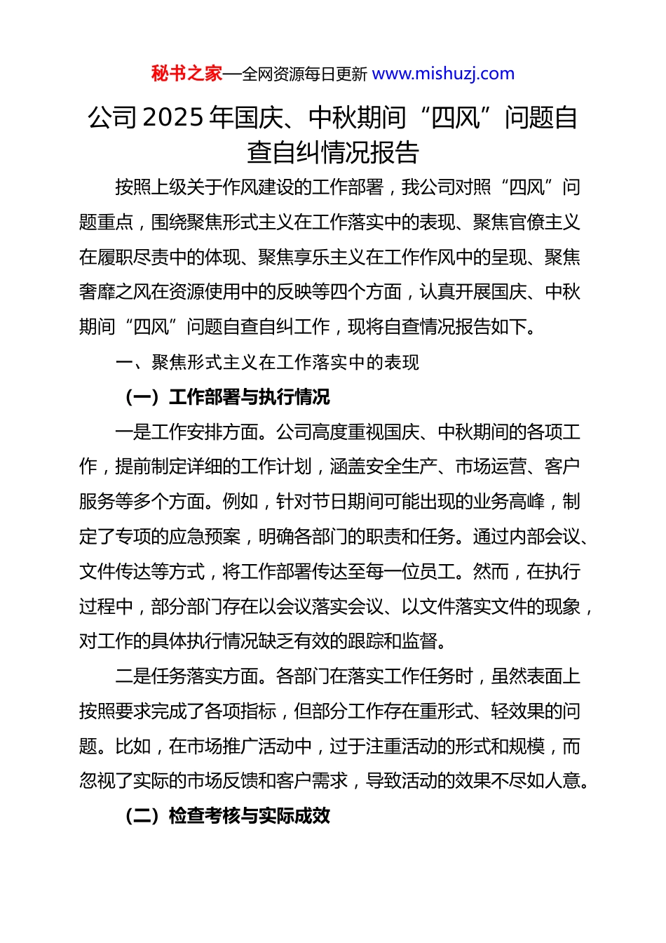 秘书之家—全网资源每日更新 www.mishuzj.com公司 2025 年国庆、中秋期间“四风”问题自查自纠情况报告按照上级关于作风建设的工作部署,我公司对照“四风”问题重点,围绕聚焦形式主义在工作落实中的表现、聚焦官僚主义在履职尽责中的体现、聚焦享乐主义在工作作风中的呈现、聚焦奢靡之风在资源使用中的反映等四个方面,认真开展国庆、中秋期间“四风”问题自查自纠工作,现将自查情况报告如下。一、聚焦形式主义在工作落实中的表现(一)工作部署与执行情况一是工作安排方面。公司高度重视国庆、中秋期间的各项工作,提前制定详细的工作计划,涵盖安全生产、市场运营、客户服务等多个方面。例如,针对节日期间可能出现的业务高峰,制定了专项的应急预案,明确各部门的职责和任务。通过内部会议、文件传达等方式,将工作部署传达至每一位员工。然而,在执行过程中,部分部门存在以会议落实会议、以文件落实文件的现象,对工作的具体执行情况缺乏有效的跟踪和监督。二是任务落实方面。各部门在落实工作任务时,虽然表面上按照要求完成了各项指标,但部分工作存在重形式、轻效果的问题。比如,在市场推广活动中,过于注重活动的形式和规模,而忽视了实际的市场反馈和客户需求,导致活动的效果不尽如人意。(二)检查考核与实际成效秘书之家—全网资源每日更新 www.mishuzj.com一是检查考核机制方面。公司建立了相应的检查考核机制,定期对各部门的工作进行检查和评估。在国庆、中秋前夕,组织了专项的安全检查和业务考核,以确保各项工作的顺利进行。但在检查过程中,存在走过场、形式化的问题,部分检查人员只是简单地查看资料和记录,没有深入实际工作中进行检查和评估。二是实际成效评估方面。对工作实际成效的评估缺乏科学合理的标准和方法,过于依赖数据和报表,而忽视了实际工作中的质量和效果。例如,在客户服务工作中,只关注客户投诉的数量,而没有深入了解客户的满意度和需求,导致客户服务工作存在一定的漏洞。二、聚焦官僚主义在履职尽责中的体现(一)领导决策与基层沟通一是决策制定方面。公司领导在制定国庆、中秋期间的工作决策时,虽然广泛征求了各部门的意见和建议,但部分决策的制定缺乏充分的调研和论证,没有充分考虑到基层员工的实际情况和需求。例如,在制定节日期间的加班安排时,没有充分考虑到员工的意愿和实际困难,导致部分员工对加班安排存在不满情绪。二是沟通交流方面。公司领导与基层员工之间的沟通交流不够顺畅,存在信息传递不畅、沟通渠道单一的问题。部分领导干部习惯于坐在办公室里发号施令,很少深入基层了解实际情况,导致对基层工作的指导和支持不够到位。秘书之家—全网资源每日更新 www.mishuzj.com(二)责任担当与工作效率一是责任担当方面。在国庆、中秋期间的工作中,部分领导干部存在责任意识不强、担当精神不足的问题。遇到问题时,习惯于推诿扯皮,不愿意承担责任。例如,在处理客户投诉时,部分部门之间相互推诿,导致客户问题得不到及时解决,影响了公司的形象和声誉。二是工作效率方面。部分领导干部工作效率低下,办事拖沓,对工作缺乏紧迫感和责任感。在处理紧急事务时,不能及时做出决策和处理,导致工作延误,影响了公司的正常运营。三、聚焦享乐主义在工作作风中的呈现(一)工作态度与敬业精神一是工作态度方面。部分员工在国庆、中秋期间存在工作态度不端正、敷衍了事的问题。对工作缺乏热情和积极性,对待工作任务只是应付了事,不愿意付出更多的努力。例如,在客户服务工作中,部分员工对客户的咨询和投诉不够耐心,态度冷漠,影响了客户的满意度。二是敬业精神方面。部分员工缺乏敬业精神,过于注重个人利益和享受,忽视了工作的重要性和责任。在节日期间,部分员工存在迟到早退、擅自离岗等现象,影响了工作的正常开展。(二)工作纪律与生活作风一是工作纪律方面。公司制定了严格的工作纪律,但部分员秘书之家—全网资源每日更新 www.mishuzj.com工在国庆、中秋期间存在违反工作纪律的问题。例如,部分员工在工作时间内玩手机、聊天、玩游戏等,严重影响了工作效率和工作秩序。二是生活作风方面。部分员工在...