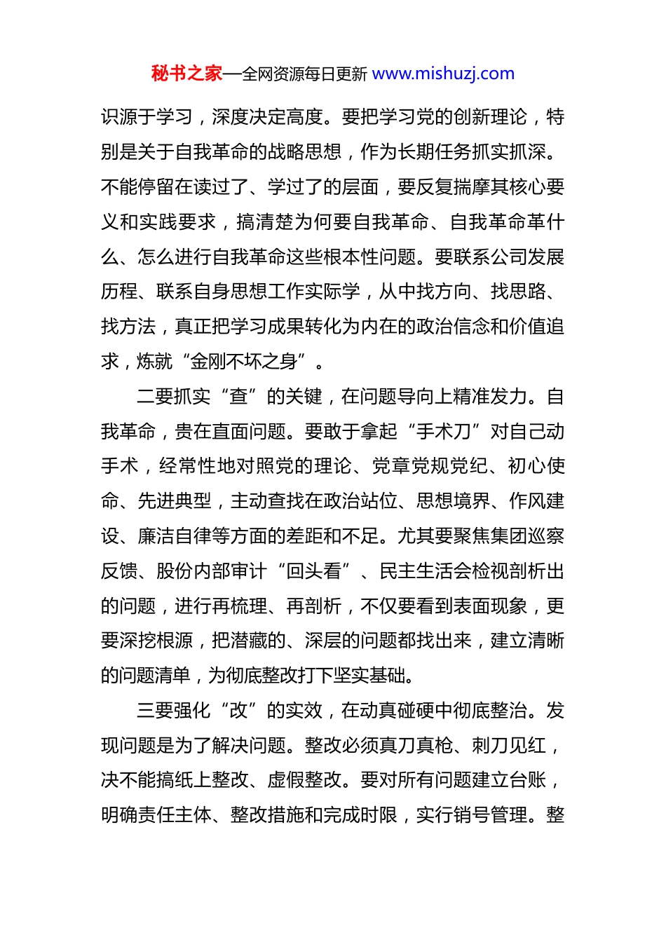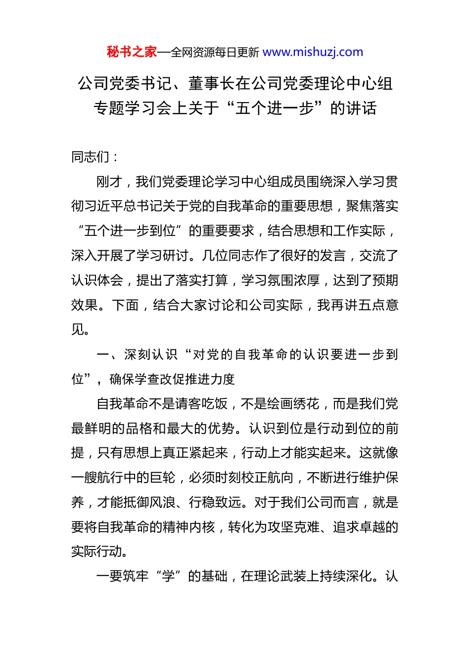 秘书之家—全网资源每日更新 www.mishuzj.com公司党委书记、董事长在公司党委理论中心组专题学习会上关于“五个进一步”的讲话 同志们:刚才,我们党委理论学习中心组成员围绕深入学习贯彻习近平总书记关于党的自我革命的重要思想,聚焦落实“五个进一步到位”的重要要求,结合思想和工作实际,深入开展了学习研讨。几位同志作了很好的发言,交流了认识体会,提出了落实打算,学习氛围浓厚,达到了预期效果。下面,结合大家讨论和公司实际,我再讲五点意见。一、深刻认识“对党的自我革命的认识要进一步到位”,确保学查改促推进力度自我革命不是请客吃饭,不是绘画绣花,而是我们党最鲜明的品格和最大的优势。认识到位是行动到位的前提,只有思想上真正紧起来,行动上才能实起来。这就像一艘航行中的巨轮,必须时刻校正航向,不断进行维护保养,才能抵御风浪、行稳致远。对于我们公司而言,就是要将自我革命的精神内核,转化为攻坚克难、追求卓越的实际行动。一要筑牢“学”的基础,在理论武装上持续深化。认秘书之家—全网资源每日更新 www.mishuzj.com识源于学习,深度决定高度。要把学习党的创新理论,特别是关于自我革命的战略思想,作为长期任务抓实抓深。不能停留在读过了、学过了的层面,要反复揣摩其核心要义和实践要求,搞清楚为何要自我革命、自我革命革什么、怎么进行自我革命这些根本性问题。要联系公司发展历程、联系自身思想工作实际学,从中找方向、找思路、找方法,真正把学习成果转化为内在的政治信念和价值追求,炼就“金刚不坏之身”。二要抓实“查”的关键,在问题导向上精准发力。自我革命,贵在直面问题。要敢于拿起“手术刀”对自己动手术,经常性地对照党的理论、党章党规党纪、初心使命、先进典型,主动查找在政治站位、思想境界、作风建设、廉洁自律等方面的差距和不足。尤其要聚焦集团巡察反馈、股份内部审计“回头看”、民主生活会检视剖析出的问题,进行再梳理、再剖析,不仅要看到表面现象,更要深挖根源,把潜藏的、深层的问题都找出来,建立清晰的问题清单,为彻底整改打下坚实基础。三要强化“改”的实效,在动真碰硬中彻底整治。发现问题是为了解决问题。整改必须真刀真枪、刺刀见红,决不能搞纸上整改、虚假整改。要对所有问题建立台账,明确责任主体、整改措施和完成时限,实行销号管理。整秘书之家—全网资源每日更新 www.mishuzj.com改过程中,要发扬“钉钉子”精神,一锤接着一锤敲,直到问题彻底解决。要注重举一反三,从个别问题中反思共性问题,从表面问题深挖制度机制根源,通过解决一个问题带动解决一类问题,确保类似问题不再发生,真正实现“革故鼎新”。四要突出“促”的目标,在发展实践上见到新成效。自我革命的最终目的是为了促进事业高质量发展。要把自我革命焕发出的政治热情、激发的内生动力,引导到推动公司改革发展、攻坚克难上来。要看通过这次学习整改,我们的政治生态是不是更清朗了,干部队伍的精气神是不是更昂扬了,推动工作的思路办法是不是更开阔了,破解难题的成效是不是更显著了,最终要体现在公司核心竞争力增强、服务效能提升、高质量发展取得新突破上,用实实在在的发展成果检验自我革命的成效。二、深刻认识“党员干部增强党性要进一步到位”,提升党性修养高度党性是党员干部立身、立业、立言、立德的基石。党性不会随着党龄增长而自然增强,也不会随着职务升迁而自然提升,必须在持续的修炼和锤炼中才能坚如磐石。这就像锻造一把利剑,需要经过千锤百炼,去除杂质,才能锋利无比。我们必须把加强党性修养作为终身课题,常修秘书之家—全网资源每日更新 www.mishuzj.com常炼,不断提升政治境界、思想境界、道德境界。一要拧紧“总开关”,在理论滋养中固本培元。思想上的清醒是政治上坚定的基础。要坚持把理论学习作为增强党性的根本途径,深入学习马克思主义基本原理,学深悟透习近平新时代中国特色社会主义思想,掌握蕴含其中的立场观点方法。要读原著、学原文、悟原理,做到学思用贯通、知信行统一,真正让党的创新理论融入血脉、注入灵魂,转化为不可撼动的理想信念。只有理论上的彻底,才能有党...