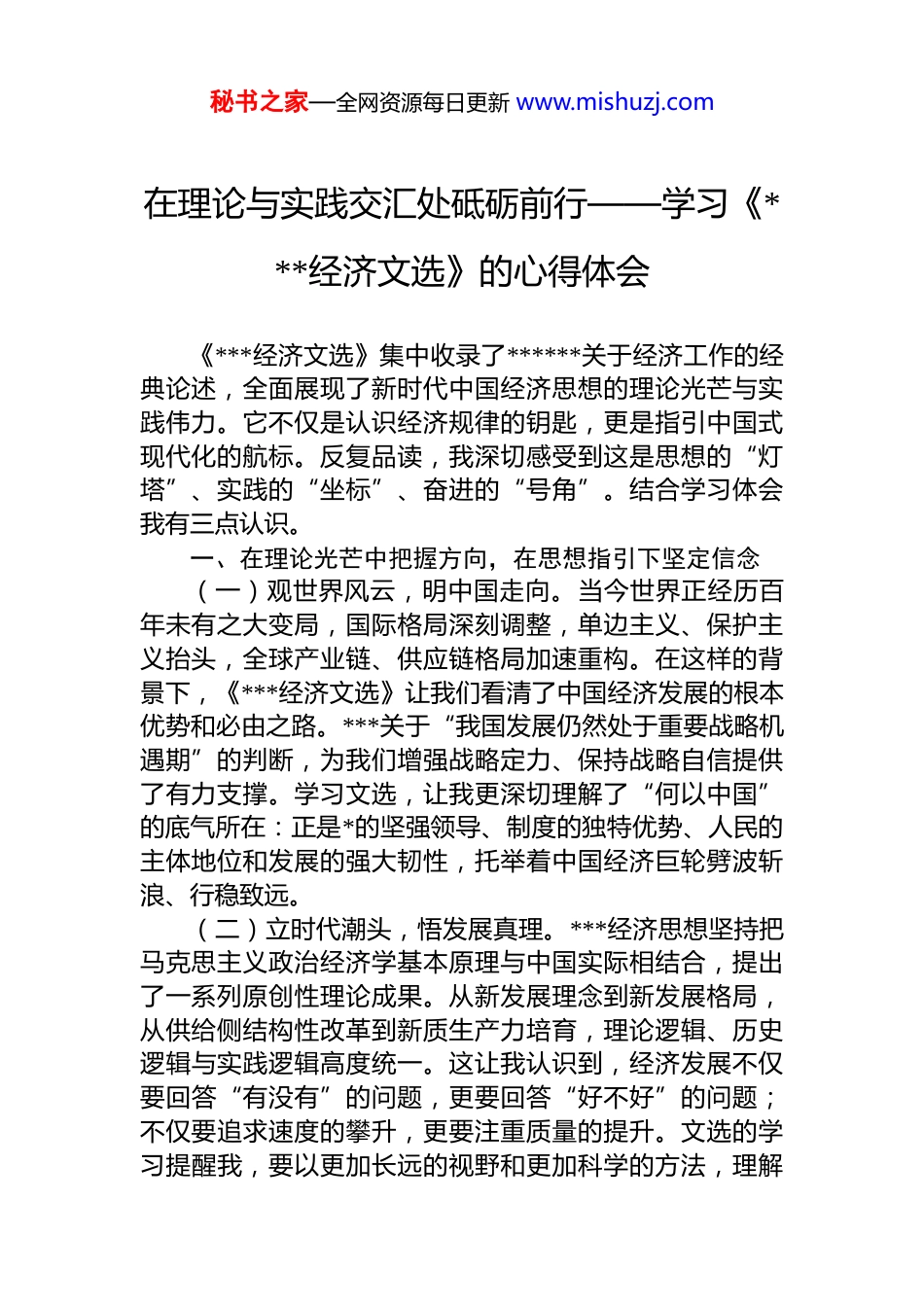 秘书之家—全网资源每日更新 www.mishuzj.com在理论与实践交汇处砥砺前行——学习《***经济文选》的心得体会《***经济文选》集中收录了******关于经济工作的经典论述,全面展现了新时代中国经济思想的理论光芒与实践伟力。它不仅是认识经济规律的钥匙,更是指引中国式现代化的航标。反复品读,我深切感受到这是思想的“灯塔”、实践的“坐标”、奋进的“号角”。结合学习体会我有三点认识。一、在理论光芒中把握方向,在思想指引下坚定信念(一)观世界风云,明中国走向。当今世界正经历百年未有之大变局,国际格局深刻调整,单边主义、保护主义抬头,全球产业链、供应链格局加速重构。在这样的背景下,《***经济文选》让我们看清了中国经济发展的根本优势和必由之路。***关于“我国发展仍然处于重要战略机遇期”的判断,为我们增强战略定力、保持战略自信提供了有力支撑。学习文选,让我更深切理解了“何以中国”的底气所在:正是*的坚强领导、制度的独特优势、人民的主体地位和发展的强大韧性,托举着中国经济巨轮劈波斩浪、行稳致远。(二)立时代潮头,悟发展真理。***经济思想坚持把马克思主义政治经济学基本原理与中国实际相结合,提出了一系列原创性理论成果。从新发展理念到新发展格局,从供给侧结构性改革到新质生产力培育,理论逻辑、历史逻辑与实践逻辑高度统一。这让我认识到,经济发展不仅要回答“有没有”的问题,更要回答“好不好”的问题;不仅要追求速度的攀升,更要注重质量的提升。文选的学习提醒我,要以更加长远的视野和更加科学的方法,理解秘书之家—全网资源每日更新 www.mishuzj.com发展规律、谋划发展战略,把“怎么看”和“怎么干”统一起来,把握发展主动。(三)强理论自觉,筑信仰基石。理论的光芒,是坚定信仰的底气。学习文选,让我切身感受到理论自觉的重要性。***强调:“要在学习中不断增强政治判断力、政治领悟力、政治执行力。”在经济发展进入深水区的关键时刻,唯有在理论上清醒坚定,才能在实践中沉着应对。作为干部,我要自觉把***经济思想作为行动指南,把理论学习作为长期任务,从中汲取思想的力量、实践的智慧和精神的动力,在风高浪急中始终不迷航、不失速。二、在人民立场中校准航向,在价值坚守里积蓄力量(一)问初心何在,始终为了人民。《***经济文选》贯穿着鲜明的人民立场。“人民对美好生活的向往,就是我们的奋斗目标。”这一根本命题,不仅是治国理政的价值标尺,更是经济建设的出发点和落脚点。学习文选让我更加深刻地理解到:一切经济发展,归根到底是为了人民无论是政策的制定,还是改革的推进,都必须回答“是否真正让人民受益”。唯有不忘初心,才能行稳致远。(二)察百姓冷暖,聚焦民生答卷。经济发展的成效,最直接的体现就是百姓生活的改善。从就业、教育到医疗养老,从食品安全到生态环境,人民群众关切的,正是经济工作的落点。《***经济文选》中的一系列论述,提醒我们在推动高质量发展中,要更加注重补齐民生短板,解决群众急难愁盼。作为干部,要把“群众满意不满意”作为最根本的衡量标准,把一件件具体的小事办好,把一桩桩民生实事落细落实,让发展的成果真正惠及千家万户。(三)谋共同富裕,校准价值航向。******指出:“共同富裕是社会主义的本质要求。”文选系统阐释了共同富裕的战略目标与实践路径。学习让我认识到,共同富裕不是平均主义,而是在高质量发展中不断扩大中等收入群体、缩小城乡区域差距,让发展成果更多更公平地惠及秘书之家—全网资源每日更新 www.mishuzj.com全体人民。作为一名干部,要在工作谋划中自觉融入这一战略追求,既要有“雪中送炭”的责任感,更要有“锦上添花”的主动性,把共同富裕的目标转化为一项项实实在在的举措。三、在实践探索中勇担使命,在开拓创新里积蓄动能(一)以创新引擎,点燃发展动力。文选指出:“创新是引领发展的第一动力。”今天,中国经济转向高质量发展,传统模式已经难以为继,必须依靠创新才能开辟新赛道、塑造新优势。无论是推动数字经济发展,还是加快绿色转型,本质上都是在孕育新质生产力。学习让我明白干部要有敢闯敢试的锐气,更要有...