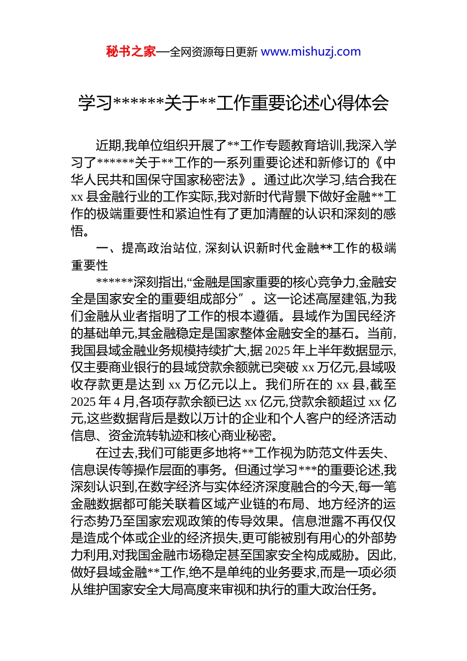 秘书之家—全网资源每日更新 www.mishuzj.com学习******关于**工作重要论述心得体会近期,我单位组织开展了**工作专题教育培训,我深入学习了******关于**工作的一系列重要论述和新修订的《中华人民共和国保守国家秘密法》。通过此次学习,结合我在xx 县金融行业的工作实际,我对新时代背景下做好金融**工作的极端重要性和紧迫性有了更加清醒的认识和深刻的感悟。一、提高政治站位,深刻认识新时代金融**工作的极端重要性******深刻指出,“金融是国家重要的核心竞争力,金融安全是国家安全的重要组成部分”。这一论述高屋建瓴,为我们金融从业者指明了工作的根本遵循。县域作为国民经济的基础单元,其金融稳定是国家整体金融安全的基石。当前,我国县域金融业务规模持续扩大,据 2025 年上半年数据显示,仅主要商业银行的县域贷款余额就已突破 xx 万亿元,县域吸收存款更是达到 xx 万亿元以上。我们所在的 xx 县,截至2025 年 4 月,各项存款余额已达 xx 亿元,贷款余额超过 xx 亿元,这些数据背后是数以万计的企业和个人客户的经济活动信息、资金流转轨迹和核心商业秘密。在过去,我们可能更多地将**工作视为防范文件丢失、信息误传等操作层面的事务。但通过学习***的重要论述,我深刻认识到,在数字经济与实体经济深度融合的今天,每一笔金融数据都可能关联着区域产业链的布局、地方经济的运行态势乃至国家宏观政策的传导效果。信息泄露不再仅仅是造成个体或企业的经济损失,更可能被别有用心的外部势力利用,对我国金融市场稳定甚至国家安全构成威胁。因此,做好县域金融**工作,绝不是单纯的业务要求,而是一项必须从维护国家安全大局高度来审视和执行的重大政治任务。秘书之家—全网资源每日更新 www.mishuzj.com二、筑牢思想防线,准确把握**工作的核心要义与实践要求******关于**工作的重要论述,内涵丰富、思想深邃,为我们筑牢思想防线、做好本职工作提供了行动指南。一是必须坚持*管**,确保正确方向。***强调,坚持*对**工作的统一领导,是**工作最大的政治优势。在金融领域,这意味着我们的一切**工作都必须在*的领导下进行,服务于*和国家事业发展大局。我们要不断加强*性修养,将对*忠诚作为**工作的生命线,自觉在思想上、政治上、行动上同以***同志为核心的*中央保持高度一致,确保金融血脉的安全与畅通。二是必须严守纪律规矩,做到令行禁止。***指出,**纪律是“带电的高压线”。2024 年新修订的**法更是对我们的行为规范提出了更高、更严的要求。在日常工作中,我们要时刻绷紧**这根弦,将**规定内化于心、外化于行。无论是处理客户信贷资料、审查内部经营报表,还是使用办公自动化系统、参与涉密会议,都要严格遵守操作流程和权限设置,坚决杜绝麻痹思想和侥幸心理。要深刻认识到,工作中的任何一次“图方便”“走捷径”,都可能埋下失泄密的巨大隐患。三是必须强化风险意识,防范化解新挑战。当前,信息技术革命带来了前所未有的便利,也催生了更为复杂隐蔽的窃密风险。网络攻击、数据爬取、电信诈骗等手段层出不穷,金融行业海量的敏感数据使其成为重点攻击目标。这要求我们不仅要保守好传统的国家秘密和商业秘密,更要高度重视对客户个人信息的保护。我们要主动学习网络安全知识,提升对新型风险的识别和防范能力,构建覆盖物理环境、信息网络、数据全生命周期的立体防护体系。三、聚焦主责主业,全力推动**工作与业务发展深度融合学习的最终目的在于指导实践。作为县域金融工作者,秘书之家—全网资源每日更新 www.mishuzj.com我们必须将***的要求落实到具体行动中,推动**工作与业务发展同频共振、深度融合。一是推动**教育常态化制度化。要改变过去“临时抱佛脚”式的培训模式,建立长效学习机制。建议单位定期组织学习新修订的**法规,常态化开展警示教育,通过剖析近年来金融领域发生的失泄密真实案例,让全体员工切身感受违规操作的严重后果,真正让**意识入脑入心,成为一种自觉的行为习惯。二是推动**管理精细化科学化。应根据岗位职责,对接触和处理的信息进行科学定级、分类管理,明确不同等级信息的流转、存储、销毁规范。要加强对关键岗位人员的背景审查和动态管理,严格落实涉密载体全流程...