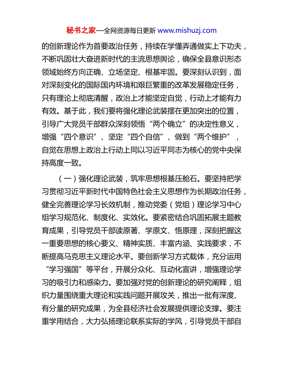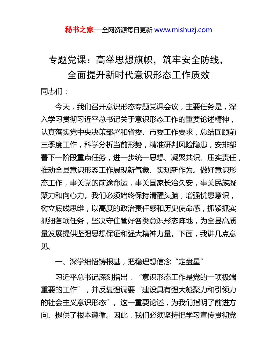 秘书之家—全网资源每日更新 www.mishuzj.com专题党课:高举思想旗帜,筑牢安全防线,全面提升新时代意识形态工作质效同志们:今天,我们召开意识形态专题党课会议,主要任务是,深入学习贯彻习近平总书记关于意识形态工作的重要论述精神,认真落实党中央决策部署和省委、市委工作要求,总结回顾前三季度工作,科学分析当前形势,精准研判风险隐患,安排部署下一阶段重点任务,进一步统一思想、凝聚共识、压实责任,推动全县意识形态工作展现新气象、实现新作为。做好意识形态工作,事关党的前途命运,事关国家长治久安,事关民族凝聚力和向心力。我们必须始终保持清醒头脑,增强忧患意识,树立底线思维,以高度的政治责任感和历史使命感,抓紧抓实抓细各项任务,坚决守住管好各类意识形态阵地,为全县高质量发展提供坚强思想保证和强大精神力量。下面,我讲几点意见。一、深学细悟铸根基,把稳理想信念“定盘星”习近平总书记深刻指出,“意识形态工作是党的一项极端重要的工作”,并反复强调要“建设具有强大凝聚力和引领力的社会主义意识形态”。这一重要论述,为我们指明了前进方向、提供了根本遵循。因此,我们必须坚持把学习宣传贯彻党秘书之家—全网资源每日更新 www.mishuzj.com的创新理论作为首要政治任务,持续在学懂弄通做实上下功夫,不断巩固壮大奋进新时代的主流思想舆论,确保全县意识形态领域始终方向正确、立场坚定、根基牢固。要深刻认识到,面对深刻变化的国际国内环境和艰巨繁重的改革发展稳定任务,只有理论上彻底清醒,政治上才能坚定自觉,行动上才能有力有效。基于此,我们要将强化理论武装摆在更加突出的位置,引导广大党员干部群众深刻领悟“两个确立”的决定性意义,增强“四个意识”、坚定“四个自信”、做到“两个维护”,自觉在思想上政治上行动上同以习近平同志为核心的党中央保持高度一致。(一)强化理论武装,筑牢思想根基压舱石。要坚持把学习贯彻习近平新时代中国特色社会主义思想作为长期政治任务,健全完善理论学习长效机制,推动党委(党组)理论学习中心组学习规范化、制度化、实效化。要紧密结合巩固拓展主题教育成果,引导党员干部读原著、学原文、悟原理,深刻把握这一重要思想的核心要义、精神实质、丰富内涵、实践要求,不断提高马克思主义理论水平。要创新学习方式载体,充分运用“学习强国”等平台,开展分众化、互动化宣讲,增强理论学习的吸引力和感染力。要加强对党的创新理论的研究阐释,组织力量围绕重大理论和实践问题开展攻关,推出一批有深度、有分量的研究成果,为全县经济社会发展提供理论支撑。要注重学用结合,大力弘扬理论联系实际的学风,引导党员干部自秘书之家—全网资源每日更新 www.mishuzj.com觉运用党的创新理论观察分析形势、研究解决问题、指导推动工作,切实把学习成果转化为谋划发展的正确思路、促进发展的政策举措、领导发展的实际能力。要加强对学习情况的督促检查和质量评估,确保学习不走过场、取得实效,真正使党的创新理论入脑入心、融会贯通。(二)深化价值引领,凝聚社会共识同心圆。要紧紧围绕培育和践行社会主义核心价值观,将其融入国民教育、精神文明创建、文化产品创作生产传播全过程。要持续深化社会公德、职业道德、家庭美德、个人品德建设,选树宣传道德模范、身边好人等先进典型,用榜样力量引领社会风尚。要广泛开展群众性主题宣传教育活动,精心组织重大纪念日活动,激发干部群众爱党爱国爱社会主义的热情。要加强和改进新时代思想政治工作,针对不同群体特点,开展精准化、差异化思想引导,理顺情绪、化解矛盾、增进认同。要深入推进精神文明创建提质扩面,扎实做好文明城市、文明村镇、文明单位、文明家庭、文明校园创建,提升城乡居民文明素养和社会文明程度。要繁荣发展社会主义文化,坚持以人民为中心的创作导向,鼓励支持创作生产更多反映时代风貌、展现*特色的优秀文化产品,丰富人民群众精神文化生活。要加强网络文明建设,发展积极健康的网络文化,净化网络环境,让互联网成为凝聚共识的新空间。秘书之家—全网资源每日更新 www.mishuzj.com(三)巩固宣传阵地,壮大主...
