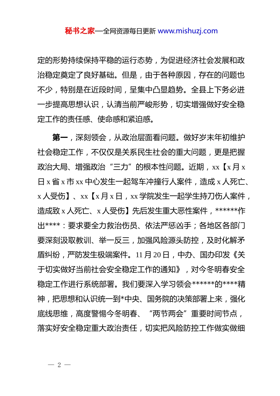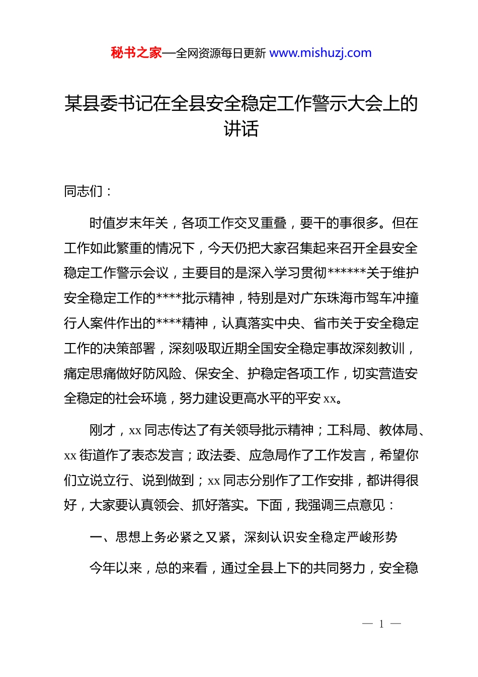 秘书之家—全网资源每日更新 www.mishuzj.com某县委书记在全县安全稳定工作警示大会上的讲话同志们:时值岁末年关,各项工作交叉重叠,要干的事很多。但在工作如此繁重的情况下,今天仍把大家召集起来召开全县安全稳定工作警示会议,主要目的是深入学习贯彻******关于维护安全稳定工作的****批示精神,特别是对广东珠海市驾车冲撞行人案件作出的****精神,认真落实中央、省市关于安全稳定工作的决策部署,深刻吸取近期全国安全稳定事故深刻教训,痛定思痛做好防风险、保安全、护稳定各项工作,切实营造安全稳定的社会环境,努力建设更高水平的平安 xx。刚才,xx 同志传达了有关领导批示精神;工科局、教体局、xx 街道作了表态发言;政法委、应急局作了工作发言,希望你们立说立行、说到做到;xx 同志分别作了工作安排,都讲得很好,大家要认真领会、抓好落实。下面,我强调三点意见:一、思想上务必紧之又紧,深刻认识安全稳定严峻形势今年以来,总的来看,通过全县上下的共同努力,安全稳— 1 —秘书之家—全网资源每日更新 www.mishuzj.com定的形势持续保持平稳的运行态势,为促进经济社会发展和政治稳定奠定了良好基础。但是,由于各种原因,存在的问题也不少,特别是在近段时间,呈集中凸显趋势。全县上下务必进一步提高思想认识,认清当前严峻形势,切实增强做好安全稳定工作的责任感、使命感和紧迫感。第一,深刻领会,从政治层面看问题。做好岁末年初维护社会稳定工作,不仅仅是关系民生社会的重大问题,更是把握政治大局、增强政治“三力”的根本性问题。近期,xx【x 月 x日 x 省 x 市 xx 中心发生一起驾车冲撞行人案件,造成 x 人死亡、x 人受伤】、xx【x 月 x 日,xx 学院发生一起学生持刀伤人案件,造成致 x 人死亡、x 人受伤】先后发生重大恶性案件,******作出****:要求要全力救治伤员、依法严惩凶手;各地区各部门要深刻汲取教训、举一反三,加强风险源头防控,及时化解矛盾纠纷,严防发生极端案件。11 月 20 日,中办、国办印发《关于切实做好当前社会安全稳定工作的通知》,对今冬明春安全稳定工作进行系统部署。我们要深入学习领会******的****精神,把思想和认识统一到*中央、国务院的决策部署上来,强化底线思维,高度警惕今冬明春、“两节两会”重要时间节点,落实好安全稳定重大政治责任,切实把风险防控工作做实做细— 2 —秘书之家—全网资源每日更新 www.mishuzj.com做到位,全力保障人民群众生命安全和社会稳定。第二,细致排查,从工作层面找漏洞。安全稳定工作从来都是“100-1=0”,而且往往容易产生蝴蝶效应和连锁反应。2023 年,我县前三季度发生 xx 起命案,但在 11 月份接连发生xx 起命案,全年累计发生 xx 起命案、xx 人死亡,导致我县被上级通报整治、xx 个乡镇被挂牌整治。同志们,我们要吃一堑长一智,今年决不能好了伤疤忘了痛。客观分析当前全县安全稳定工作,形势不容乐观:安全生产方面,3 月份,xx 石矿山发生一起安全事故,造成 1 人死亡,导致矿山被市应急局责令停产整顿;前天下午,xx 煤矿又发生一起安全事故,造成 1 人死亡;目前我县取得安全生产许可证或安全审查批复的非煤矿山还有 30 座,可以说矿山安全风险非常大。此外,道路交通、建筑施工、城镇燃气、消防、地质灾害等重点领域安全风险也不容忽视,必须引起高度警觉。矛盾化解方面,截至目前,全县累计排查矛盾纠纷 xx 件,化解 xx 件,还有 xx 件未能化解;县级信访 xx 批次 xx 人次,同比上升 x%、x%;重复信访 xx 件xx 人次,化解 xx 件,仍有 xx 件尚未化解。特别是昨天下午xx 社区发生的一起 xx 中毒致 x 死 x 伤事件,初步排查系感情纠纷,说明我们在基层社会治理方面还存在较多漏洞、较大风险。— 3 —秘书之家—全网资源每日更新 www.mishuzj.com社会治安方面,1 至 10 月,全县查处农村涉赌案件 xx 件、行政处罚 xx 人,同比上升 x%、x%;查处涉未成年人案件 x 起,案件数与去年同期相比呈上升趋势。加之我县债务风险较大,财政收支紧张,“两拖欠”治理和“六个清零”...