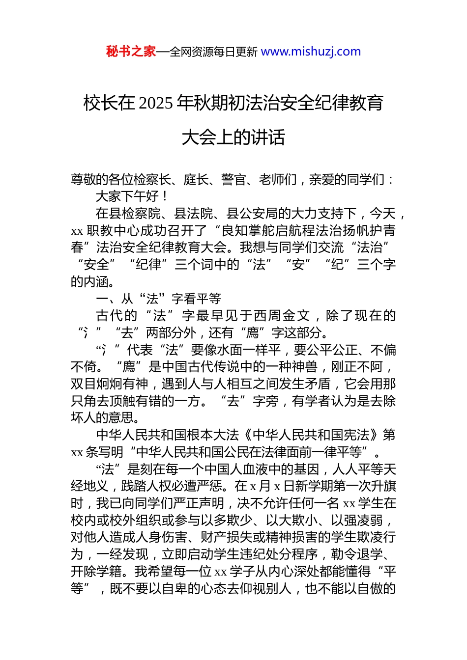 秘书之家—全网资源每日更新 www.mishuzj.com校长在 2025 年秋期初法治安全纪律教育大会上的讲话尊敬的各位检察长、庭长、警官、老师们,亲爱的同学们:大家下午好!在县检察院、县法院、县公安局的大力支持下,今天,xx 职教中心成功召开了“良知掌舵启航程法治扬帆护青春”法治安全纪律教育大会。我想与同学们交流“法治”“安全”“纪律”三个词中的“法”“安”“纪”三个字的内涵。一、从“法”字看平等古代的“法”字最早见于西周金文,除了现在的“氵”“去”两部分外,还有“廌”字这部分。“氵”代表“法”要像水面一样平,要公平公正、不偏不倚。“廌”是中国古代传说中的一种神兽,刚正不阿,双目炯炯有神,遇到人与人相互之间发生矛盾,它会用那只角去顶触有错的一方。“去”字旁,有学者认为是去除坏人的意思。中华人民共和国根本大法《中华人民共和国宪法》第xx 条写明“中华人民共和国公民在法律面前一律平等”。“法”是刻在每一个中国人血液中的基因,人人平等天经地义,践踏人权必遭严惩。在 x 月 x 日新学期第一次升旗时,我已向同学们严正声明,决不允许任何一名 xx 学生在校内或校外组织或参与以多欺少、以大欺小、以强凌弱,对他人造成人身伤害、财产损失或精神损害的学生欺凌行为,一经发现,立即启动学生违纪处分程序,勒令退学、开除学籍。我希望每一位 xx 学子从内心深处都能懂得“平等”,既不要以自卑的心态去仰视别人,也不能以自傲的秘书之家—全网资源每日更新 www.mishuzj.com心态去俯视别人,要学会平视,平视他人、平视世界。二、从“安”字看自由“安”字,上面的宝盖头表示房子,下面是女字,合起来,意思就是“女坐室内为安”,一个人能回到家里,就是“安”。今年 x 月 xx 日,xx 届全国人大常委会第 xx 次会议表决通过新修订的《中华人民共和国治安管理处罚法》。对于高中阶段学生违反治安管理的处罚的变化有三方面:一是适当调整不执行拘留的规定,有针对性地加大惩处力度。“对 xx 周岁至 xx 周岁(涉及高一年级学生)以及 xx 周岁至 xx 周岁(涉及高二、高三年级学生)初次违反治安管理但情节严重、影响恶劣的,或者 xx 周岁至 xx 周岁(涉及高一年级学生)一年内二次以上违反治安管理的,依法执行拘留。”二是与预防未成年人犯罪法做好衔接。对于“已满十四周岁不满十六周岁的,初次违反治安管理,情节不严重、影响不恶劣的,不执行行政拘留处罚”“已满十六周岁不满十八周岁,违反治安管理的,情节不严重、影响不恶劣的,不执行行政拘留处罚”这两种违反治安管理的未成年人,规定“公安机关依照《中华人民共和国预防未成年人犯罪法》的规定采取相应矫治教育等措施”。三是依法治理学生欺凌。规定“以殴打、侮辱、恐吓等方式实施学生欺凌,违反治安管理的,公安机关应当依法给予治安管理处罚、采取相应矫治教育等措施”。新修订的《中华人民共和国治安管理处罚法》将于xxxx 年 x 月 x 日起执行,xx 学生如果仍有违反治安管理的行为,你不但不能在校园里生活,同时你也将在一定时间内或者在看守所挽留或者在市专门学校接受专门矫治教育这段时间你将丧失人身自由、回不了家。法国教育家卢梭曾讲道“人人渴望自由却处处是枷锁”,只有每一个人有所为有所不为,才能守护这个世界的和平,才能保护每一个人的自由。秘书之家—全网资源每日更新 www.mishuzj.com三、从“纪”字看惩戒“纪”字的左半部分“纟”表示“纪”与丝线有关,右半部分“己”在古文中表示“整理出丝线的头绪”。一所学校要想形成良好的校风,就要有严明的纪律。学校教育处利用暑假,对《学生违纪处分规定》和《德育操行考评办法》进行了全面修订,建立了学生违纪蓝色、黄色、橙色、红色、黑色五级预警体系,对蓝色、黄色、橙色预警的学生安排到涅槃班接受学习教育,对于每一周涅槃班的新学员,我都进行谈心,让同学们认识到每个人都一棵树,要想茁壮成长,既要经历春日细雨,也需要经历夏日大雨,这样你的根扎的更深,你的树干更结实,你的枝叶更茂盛。最近两周,xx 学子的表现悄然发生着变化,老师们说:“教育管理的压力小了...