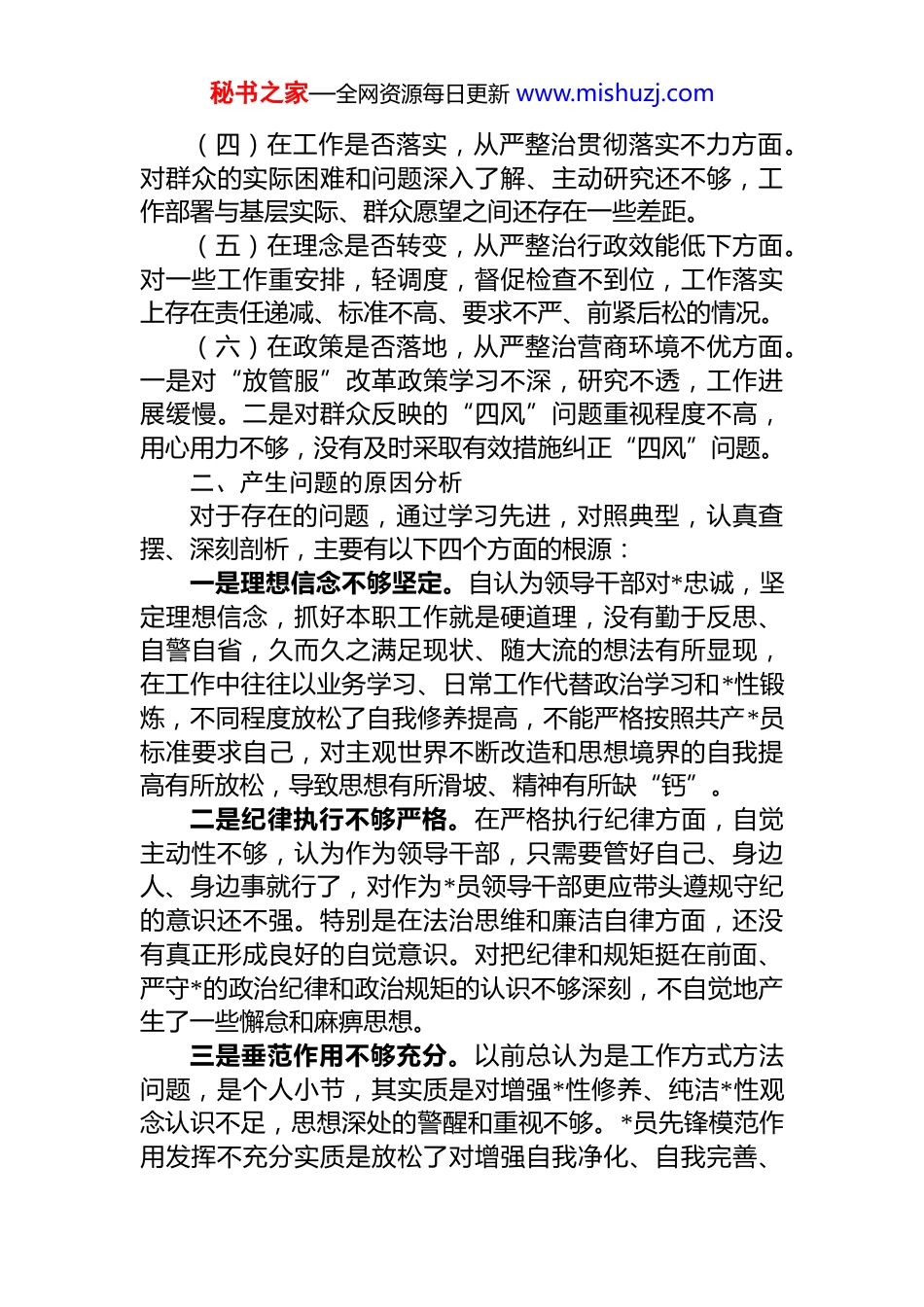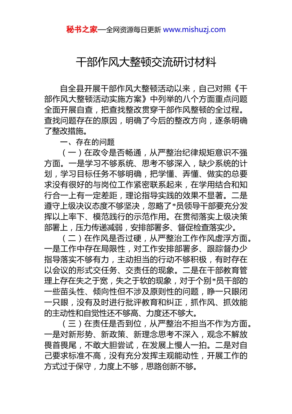 秘书之家—全网资源每日更新 www.mishuzj.com干部作风大整顿交流研讨材料自全县开展干部作风大整顿活动以来,自己对照《干部作风大整顿活动实施方案》中列举的八个方面重点问题全面开展自查,把查找整改贯穿干部作风整顿的全过程。查找问题存在的原因,明确了今后的整改方向,逐条明确了整改措施。一、存在的问题(一)在政令是否畅通,从严整治纪律规矩意识不强方面。一是学习不够系统、思考不够深入,缺少系统的计划,学习目标任务不够明确,把学懂、弄懂、做实的总要求没有很好的与岗位工作紧密联系起来,在学用结合和知行合一上有一定差距,理论指导实践的效果不显著。二是遵守上级决议态度不够坚决,忽略了*员领导干部要充分发挥以上率下、模范践行的示范作用。在贯彻落实上级决策部署上,压力传递减弱,安排部署多、督促检查落实少。(二)在作风是否过硬,从严整治工作作风虚浮方面。一是工作中存在局限性,对工作安排部署多、跟踪督办少指导落实不够有力,主动担当的行动不够积极,有时存在以会议的形式交任务、交责任的现象。二是在干部教育管理上存在失之于宽,失之于软的现象,对于个别*员干部的一些苗头性、倾向性但不涉及原则性的问题,睁一只眼闭一只眼,没有及时进行批评教育和纠正,抓作风、抓效能的主动性和自觉性还不够高、力度还不够大。(三)在责任是否到位,从严整治不担当不作为方面。一是对新形势、新政策、新理念思考不深入,观念不解放畏首畏尾,不敢大胆尝试,在发展上慢人一拍。二是对自己要求标准不高,没有充分发挥主观能动性,开展工作的方式过于保守,力度上不够,思路创新不够。秘书之家—全网资源每日更新 www.mishuzj.com(四)在工作是否落实,从严整治贯彻落实不力方面。对群众的实际困难和问题深入了解、主动研究还不够,工作部署与基层实际、群众愿望之间还存在一些差距。(五)在理念是否转变,从严整治行政效能低下方面。对一些工作重安排,轻调度,督促检查不到位,工作落实上存在责任递减、标准不高、要求不严、前紧后松的情况。(六)在政策是否落地,从严整治营商环境不优方面。一是对“放管服”改革政策学习不深,研究不透,工作进展缓慢。二是对群众反映的“四风”问题重视程度不高,用心用力不够,没有及时采取有效措施纠正“四风”问题。二、产生问题的原因分析对于存在的问题,通过学习先进,对照典型,认真查摆、深刻剖析,主要有以下四个方面的根源:一是理想信念不够坚定。自认为领导干部对*忠诚,坚定理想信念,抓好本职工作就是硬道理,没有勤于反思、自警自省,久而久之满足现状、随大流的想法有所显现,在工作中往往以业务学习、日常工作代替政治学习和*性锻炼,不同程度放松了自我修养提高,不能严格按照共产*员标准要求自己,对主观世界不断改造和思想境界的自我提高有所放松,导致思想有所滑坡、精神有所缺“钙”。二是纪律执行不够严格。在严格执行纪律方面,自觉主动性不够,认为作为领导干部,只需要管好自己、身边人、身边事就行了,对作为*员领导干部更应带头遵规守纪的意识还不强。特别是在法治思维和廉洁自律方面,还没有真正形成良好的自觉意识。对把纪律和规矩挺在前面、严守*的政治纪律和政治规矩的认识不够深刻,不自觉地产生了一些懈怠和麻痹思想。三是垂范作用不够充分。以前总认为是工作方式方法问题,是个人小节,其实质是对增强*性修养、纯洁*性观念认识不足,思想深处的警醒和重视不够。*员先锋模范作用发挥不充分实质是放松了对增强自我净化、自我完善、秘书之家—全网资源每日更新 www.mishuzj.com自我革新、自我提高能力的重视,放松了对保持*员先进性和纯洁性的追求,导致在工作中缺乏善谋事善干事的担当意识和责任意识。四是宗旨意识不够牢固。深入群众做得还不够,群众观点树得还不牢,全心全意为人民服务的宗旨意识还没有真正在心中牢牢扎根。认为自己主要职责是服务,没有多少能力为群众办些实事,全心全意为人民服务的宗旨意识不够强,对工作中反映出的一些矛盾和问题还没有完全站在群众的角度进行深层次的思考。三、今后努力方向和整改措施一是锤炼*性修养,坚定理想信念。把*性锻炼当...
