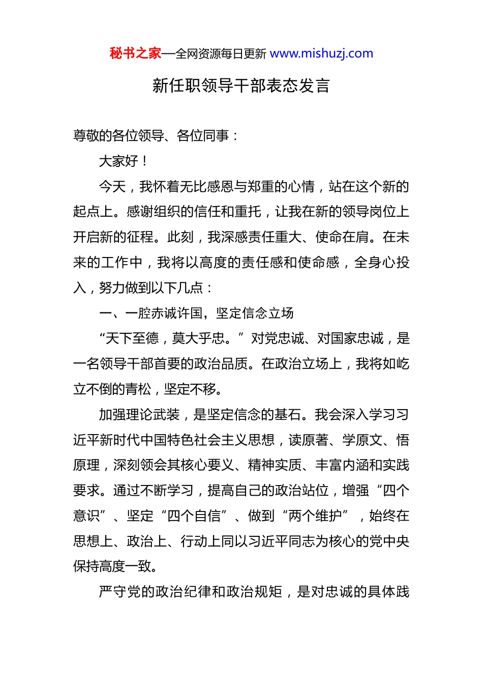 秘书之家—全网资源每日更新 www.mishuzj.com新任职领导干部表态发言 尊敬的各位领导、各位同事:大家好!今天,我怀着无比感恩与郑重的心情,站在这个新的起点上。感谢组织的信任和重托,让我在新的领导岗位上开启新的征程。此刻,我深感责任重大、使命在肩。在未来的工作中,我将以高度的责任感和使命感,全身心投入,努力做到以下几点:一、一腔赤诚许国,坚定信念立场“天下至德,莫大乎忠。”对党忠诚、对国家忠诚,是一名领导干部首要的政治品质。在政治立场上,我将如屹立不倒的青松,坚定不移。加强理论武装,是坚定信念的基石。我会深入学习习近平新时代中国特色社会主义思想,读原著、学原文、悟原理,深刻领会其核心要义、精神实质、丰富内涵和实践要求。通过不断学习,提高自己的政治站位,增强“四个意识”、坚定“四个自信”、做到“两个维护”,始终在思想上、政治上、行动上同以习近平同志为核心的党中央保持高度一致。严守党的政治纪律和政治规矩,是对忠诚的具体践秘书之家—全网资源每日更新 www.mishuzj.com行。我会自觉遵守党章党规,严格执行党内政治生活准则,不搞阳奉阴违、不做两面人。在大是大非面前,旗帜鲜明、立场坚定;在风浪考验面前,无所畏惧、勇往直前。始终保持清醒的政治头脑,善于从政治上观察和处理问题,不断提高政治判断力、政治领悟力、政治执行力。忠诚不仅体现在思想上,更要落实到行动中。我会坚决贯彻党的路线方针政策,不折不扣地执行上级的决策部署,确保政令畅通。积极主动地为党和国家的事业贡献力量,在工作中勇挑重担、敢于担当,以实际行动诠释对党的忠诚、对国家的赤诚。二、一片热忱事公,推动事业发展“为官避事平生耻。”事业心和责任感是领导干部做好工作的动力源泉。我将以高度的敬业精神,全身心地投入到事业发展中。树立正确的政绩观,是推动事业发展的前提。我会坚持实事求是,不搞形式主义、不做表面文章。以人民群众的利益为出发点和落脚点,以推动事业的长远发展为目标,多做打基础、利长远的实事。加强战略谋划,是推动事业发展的关键。我会深入研究行业发展趋势,结合本地实际,制定科学合理的发展规划。明确工作目标和重点任务,找准工作的切入点和着力秘书之家—全网资源每日更新 www.mishuzj.com点,有条不紊地推进各项工作。同时,注重统筹协调,整合各方资源,形成工作合力,共同推动事业发展。勇于创新突破,是推动事业发展的动力。我会鼓励和支持创新创造,营造良好的创新氛围。敢于打破传统思维定式,积极探索新的工作方法和途径。在实践中不断总结经验,及时调整工作策略,以创新的思维和举措解决工作中的难题,推动事业不断取得新突破。三、一心一意服务,践行初心使命“民为邦本,本固邦宁。”为人民服务是我们党的根本宗旨,也是领导干部的初心和使命。我将把人民群众的冷暖放在心上,把为人民服务的宗旨落实到行动中。深入基层、深入群众,是了解群众需求的重要途径。我会经常到基层一线走访调研,与群众面对面交流,倾听他们的心声,了解他们的所思所想所盼。关心群众的生产生活,关注群众的热点难点问题,切实掌握第一手资料,为科学决策提供依据。积极回应群众关切,是践行初心使命的具体体现。对于群众反映的问题,我会认真对待、及时处理。能够立即解决的,马上就办;需要一定时间解决的,会明确责任人和时间节点,跟踪问效,确保问题得到妥善解决。同时,加强与群众的沟通反馈,让群众了解问题的解决进展情秘书之家—全网资源每日更新 www.mishuzj.com况,增强群众的信任感和满意度。提高服务质量和效率,是为人民服务的基本要求。我会不断优化服务流程,简化办事程序,提高工作效率。加强对工作人员的培训和管理,提高他们的服务意识和业务水平。积极推进政务公开,让权力在阳光下运行,接受群众的监督,为群众提供更加优质、高效、便捷的服务。四、一以贯之实干,确保工作落实“一分部署,九分落实。”执行力和抓落实是领导干部的重要能力。我将以钉钉子的精神,一以贯之地抓好工作落实。强化责任意识,是确保工作落实的基础。我会明确工作责任,将各项任务分解到具体的部门和个人,...